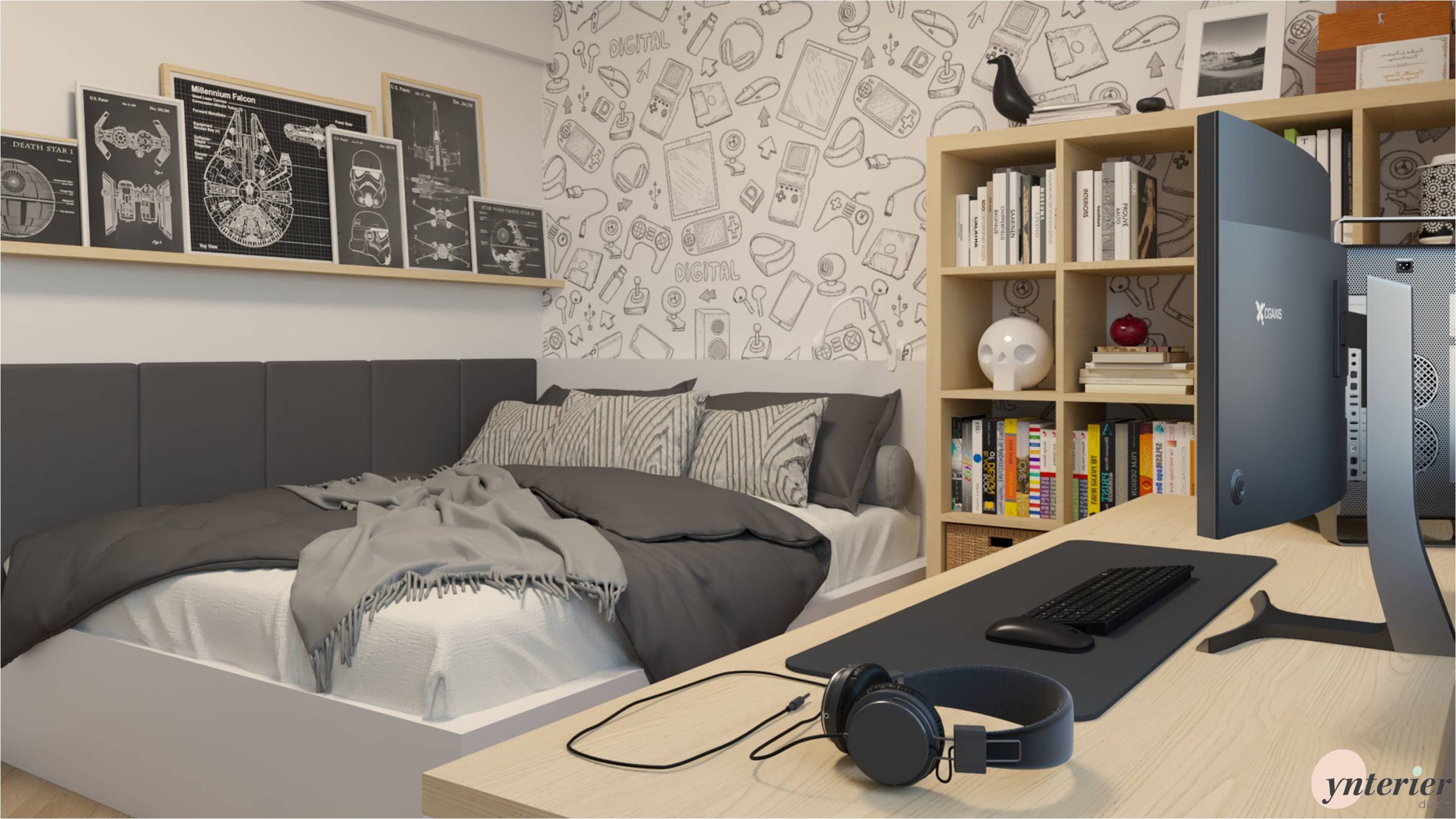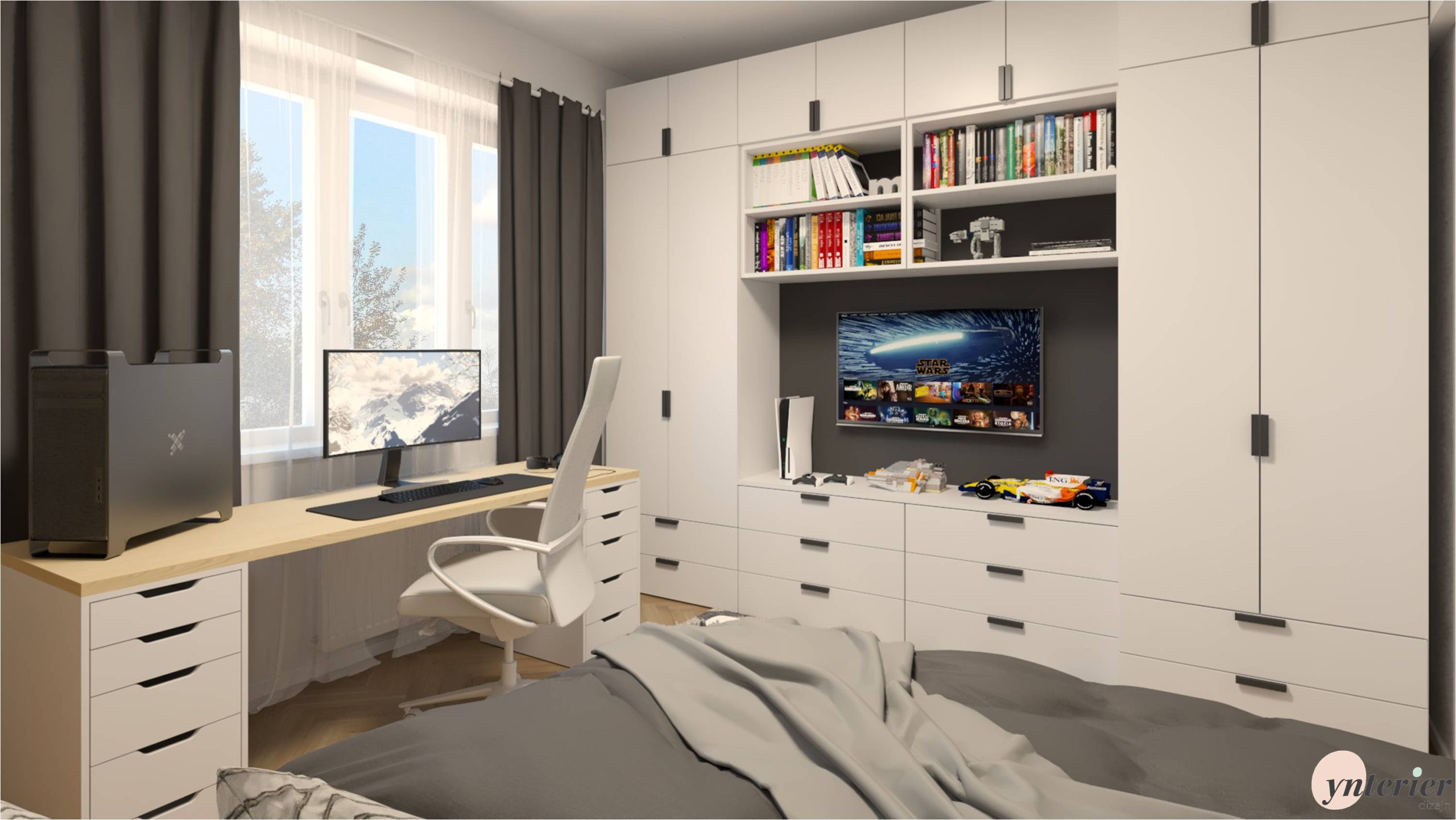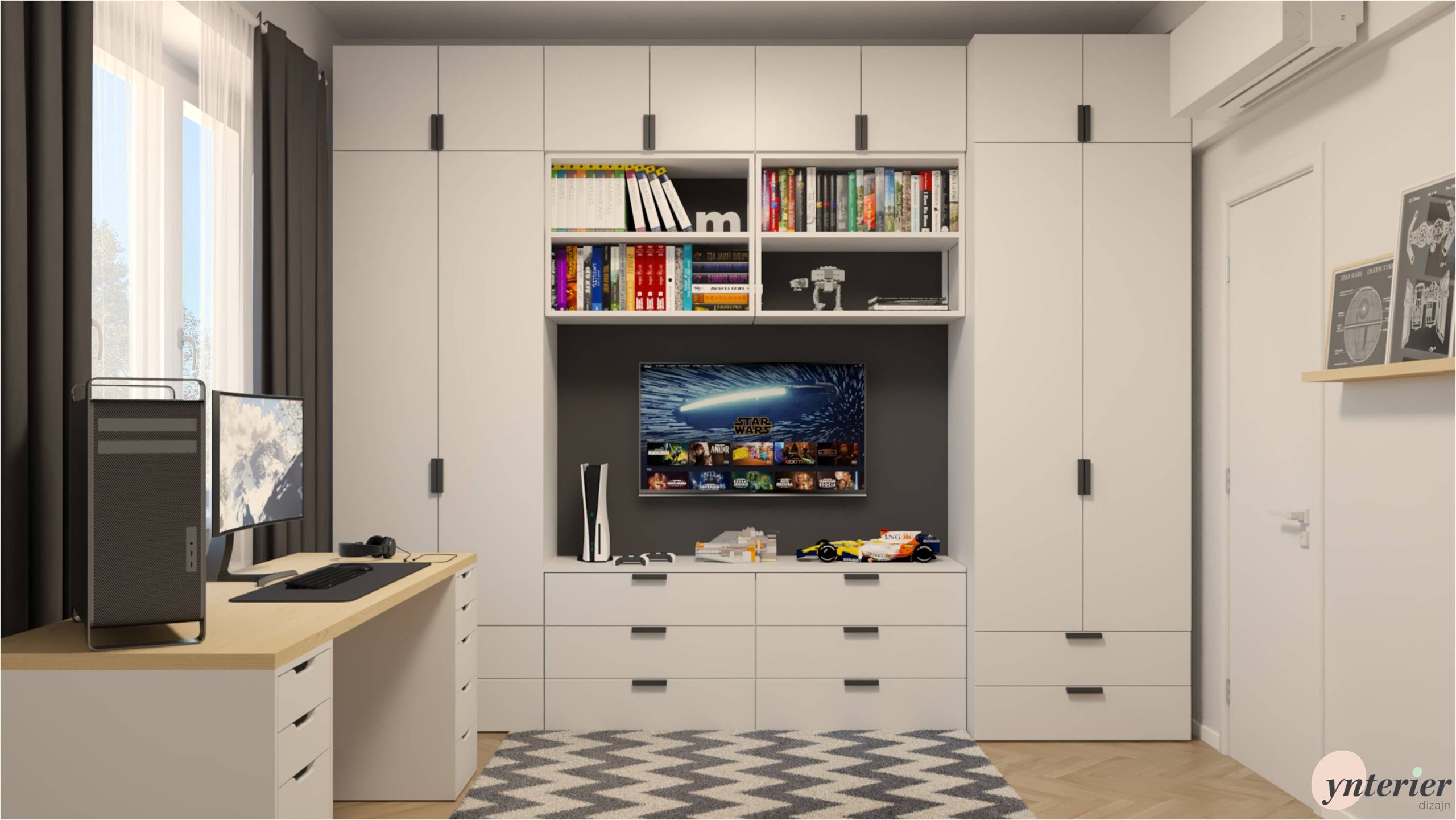 Na protiľahlej strane miestnosti sa nachádza úložný systém IKEA PLATSA, kde je umiestnená konzola, modely áut a obľúbené filmy.