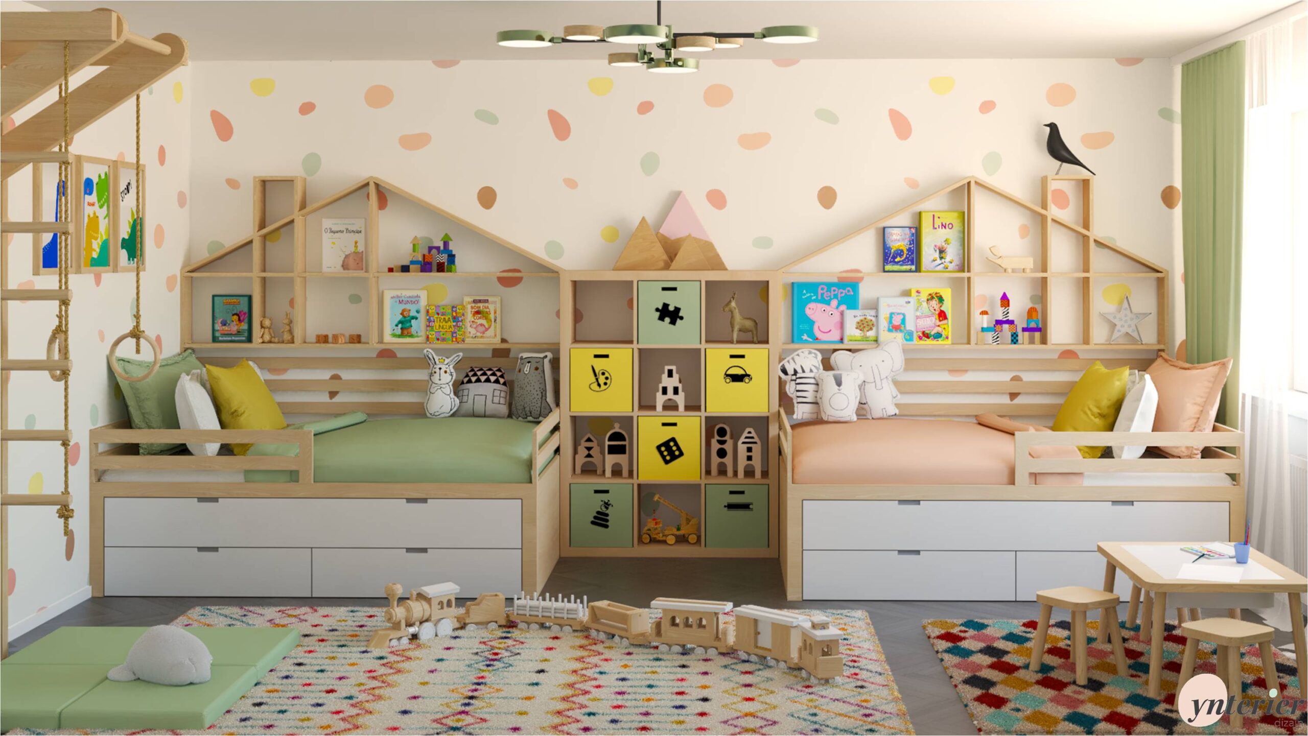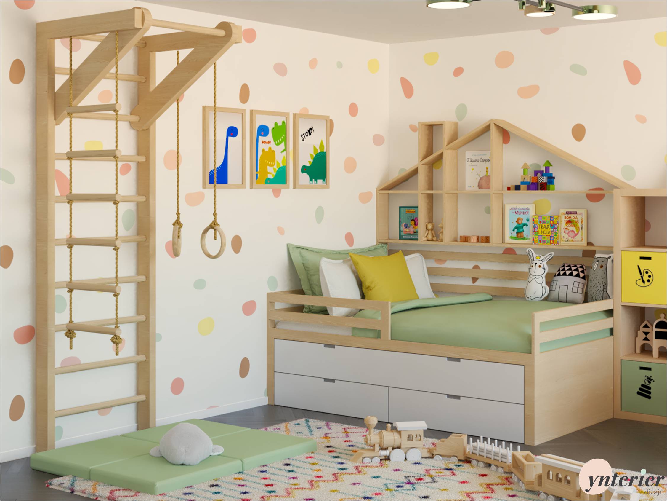 Deti potrebujú priestor na pohyb, preto sme do izby pridali hojdačku a rebriny, ktoré podporujú ich fyzický vývoj. Drevené hračky, vláčiková dráha a mäkké koberce s geometrickými vzormi dotvárajú celkový hravý charakter izby.