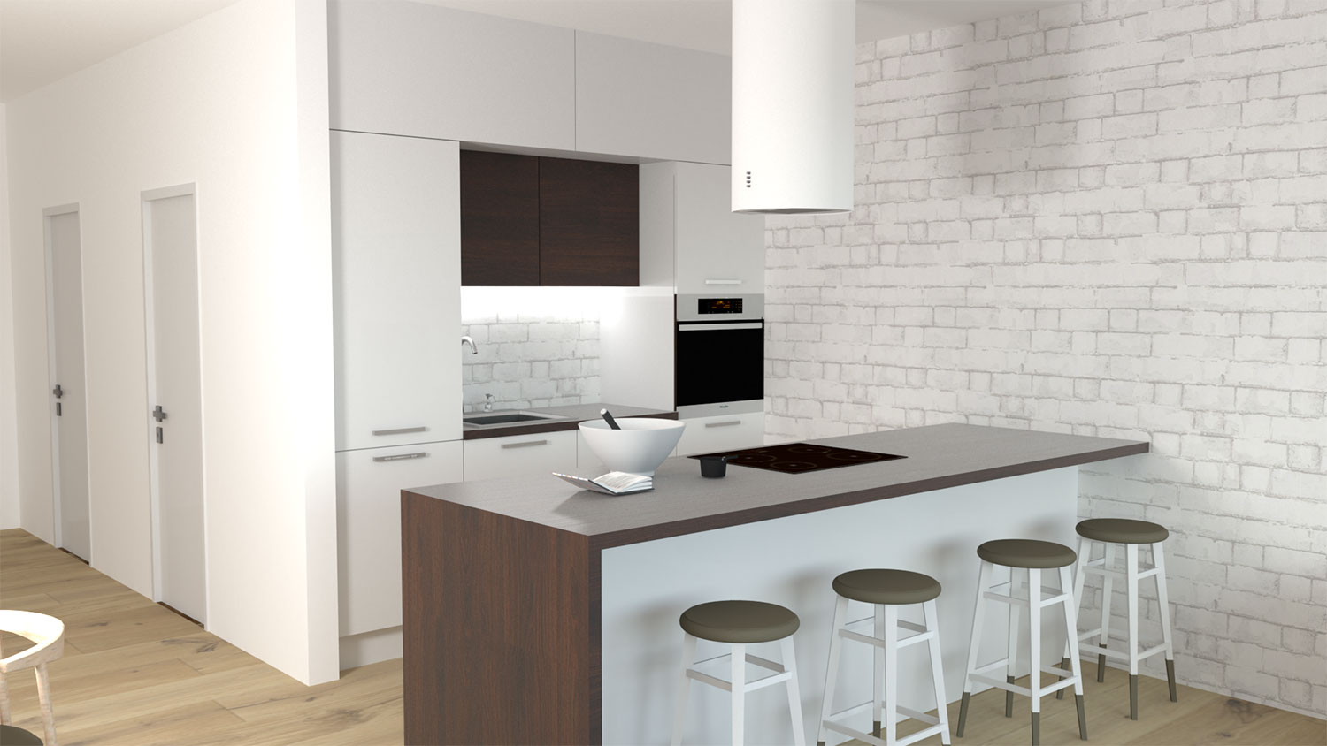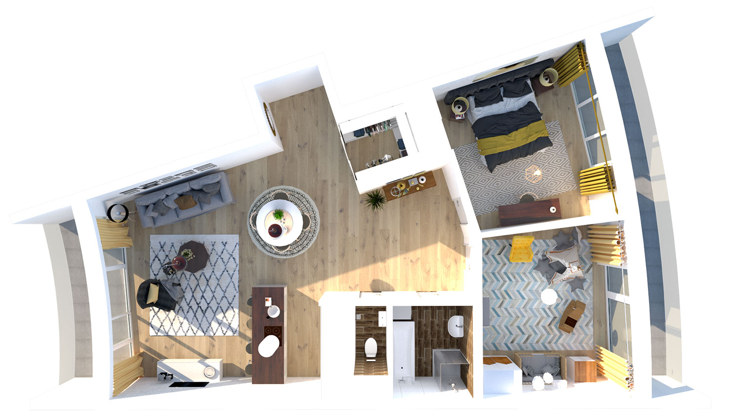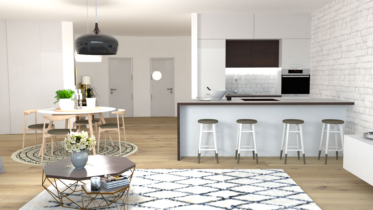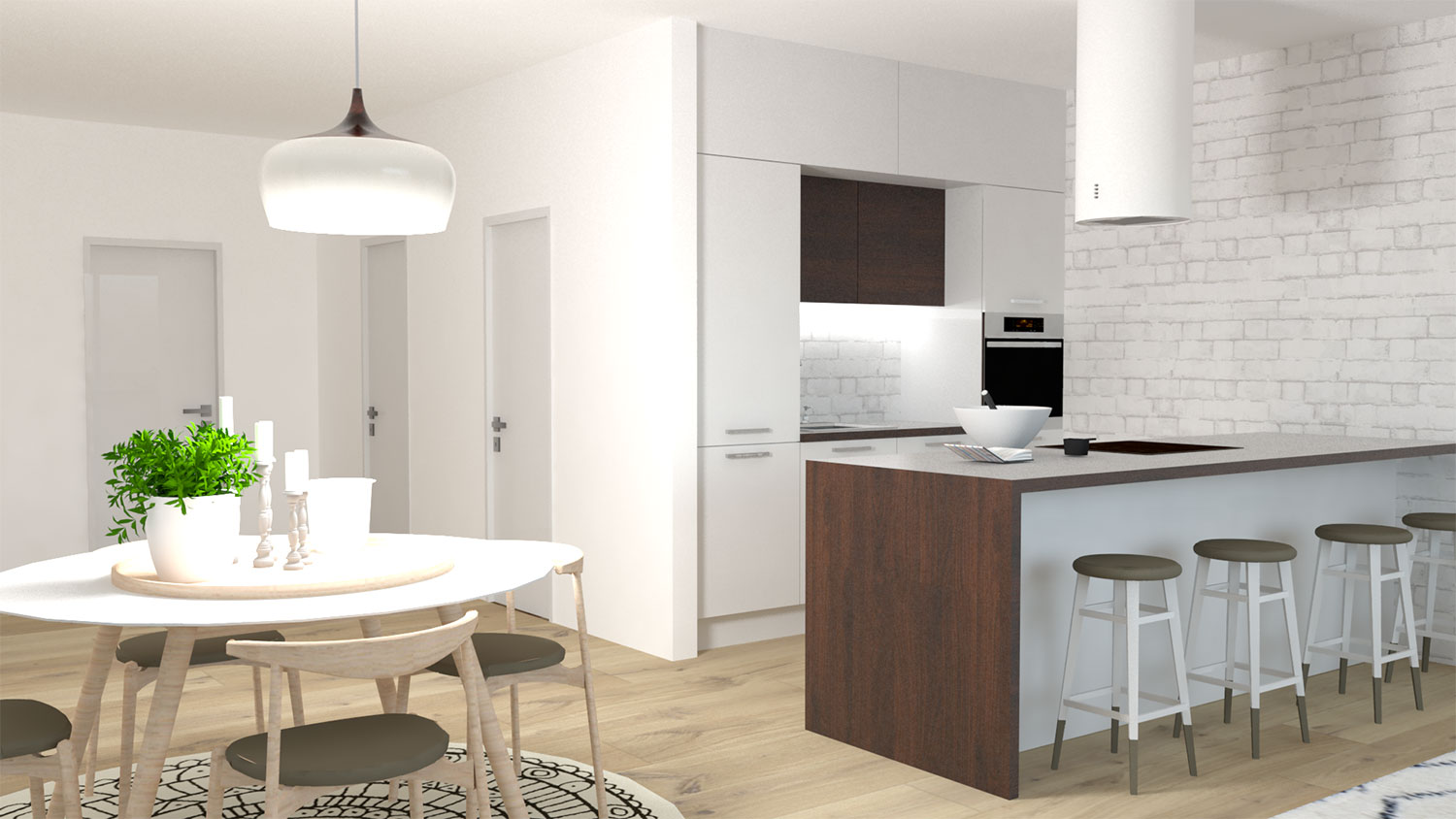 Byt v novostavbe má zaujímavý pôdorys v tvare vejáru. Veľké okná vnášajú do priestoru prirodzené svetlo, ale ho aj limitujú v zariadení nábytkom. Obývačke je tak nechaný veľkorysý priestor. Kuchynská linka je navrhnutá tak, aby neboli nutné zásahy do inštalácií. Drez a umývačka riadu sú umiestené vo vytvorenom výklenku a varenie je na ostrove. Z opačnej strany je aj pohodlné barové sedenie pre štyroch ľudí.