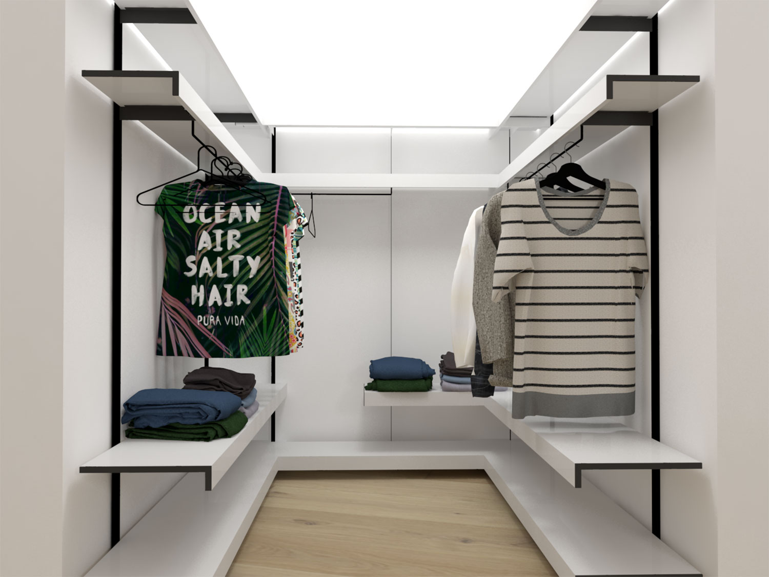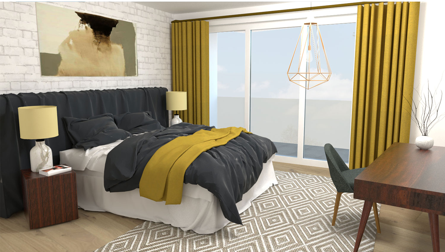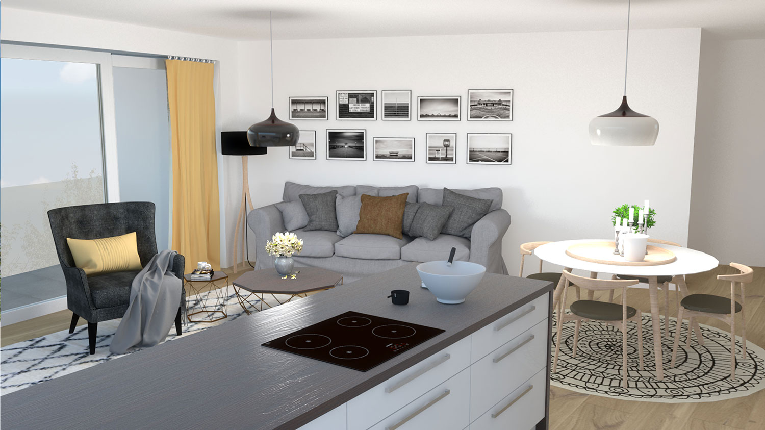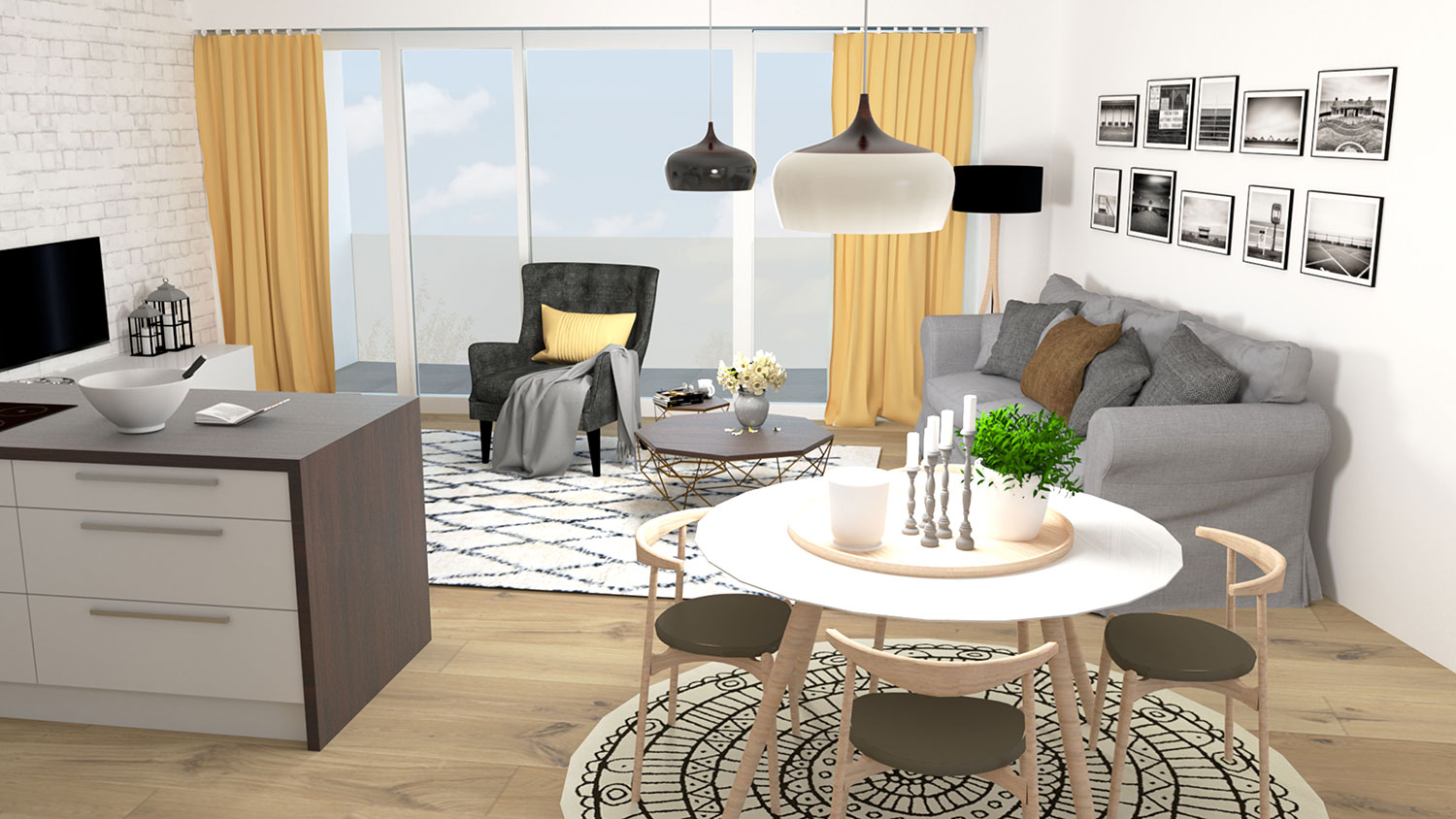 Byt v novostavbe má zaujímavý pôdorys v tvare vejáru. Veľké okná vnášajú do priestoru prirodzené svetlo, ale ho aj limitujú v zariadení nábytkom. Obývačke je tak nechaný veľkorysý priestor. Kuchynská linka je navrhnutá tak, aby neboli nutné zásahy do inštalácií. Drez a umývačka riadu sú umiestené vo vytvorenom výklenku a varenie je na ostrove. Z opačnej strany je aj pohodlné barové sedenie pre štyroch ľudí.