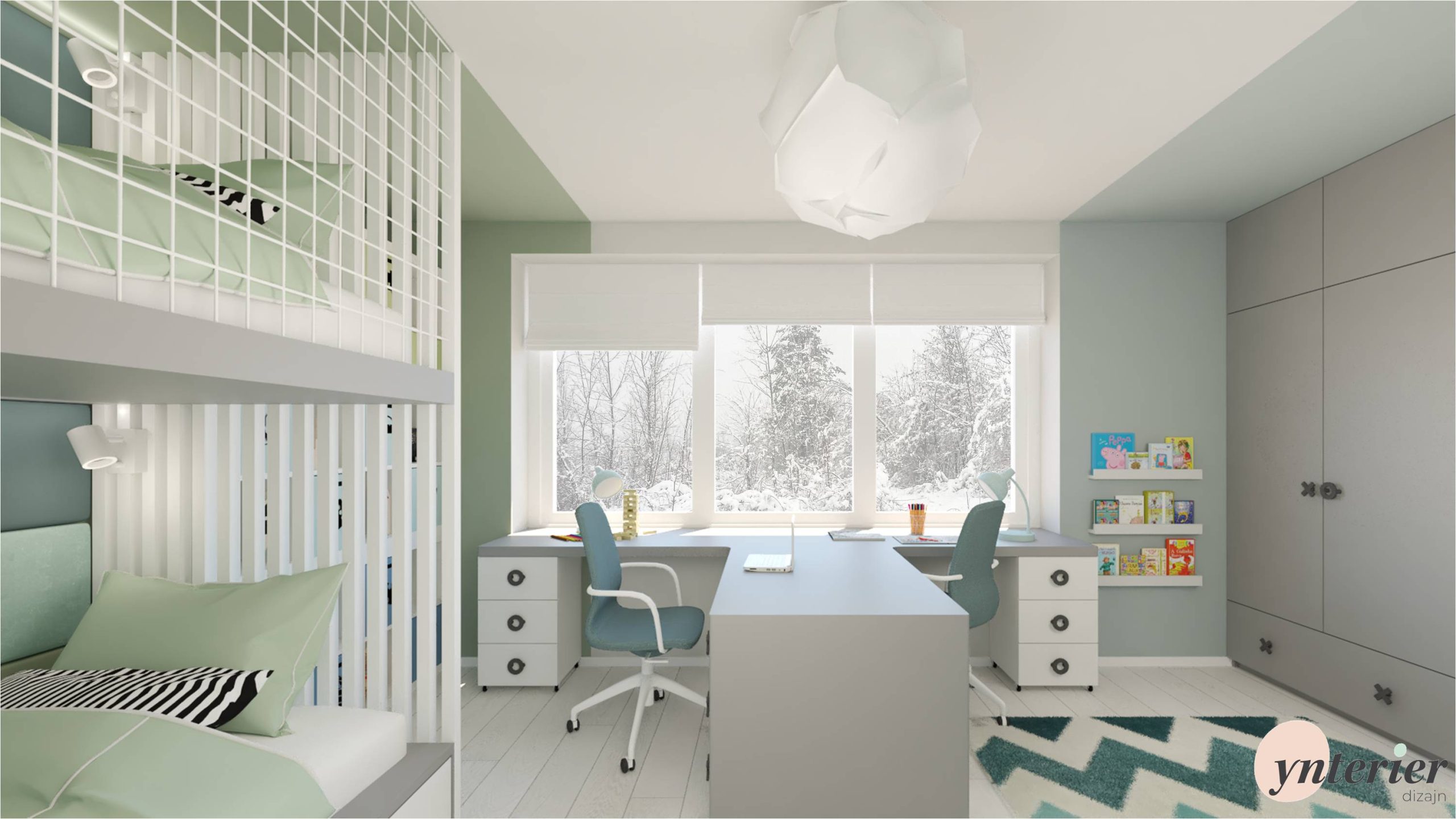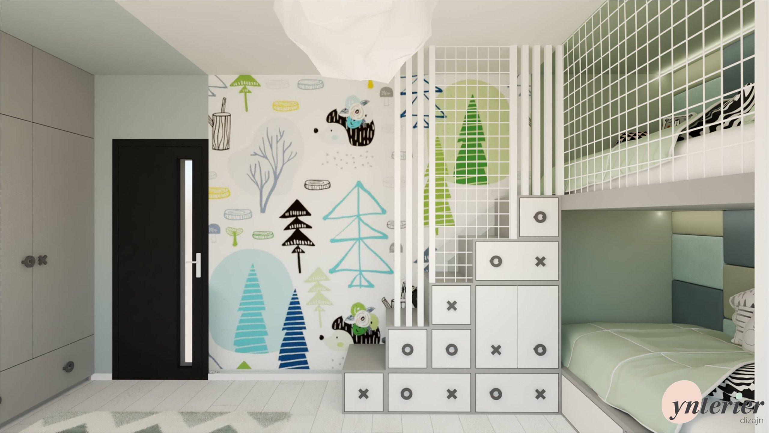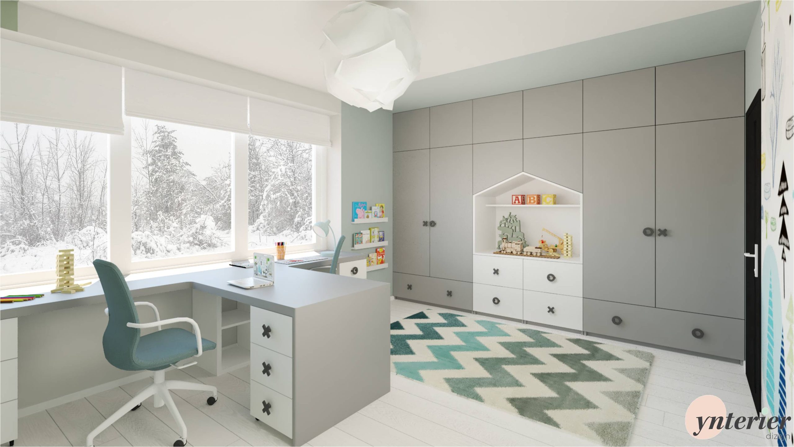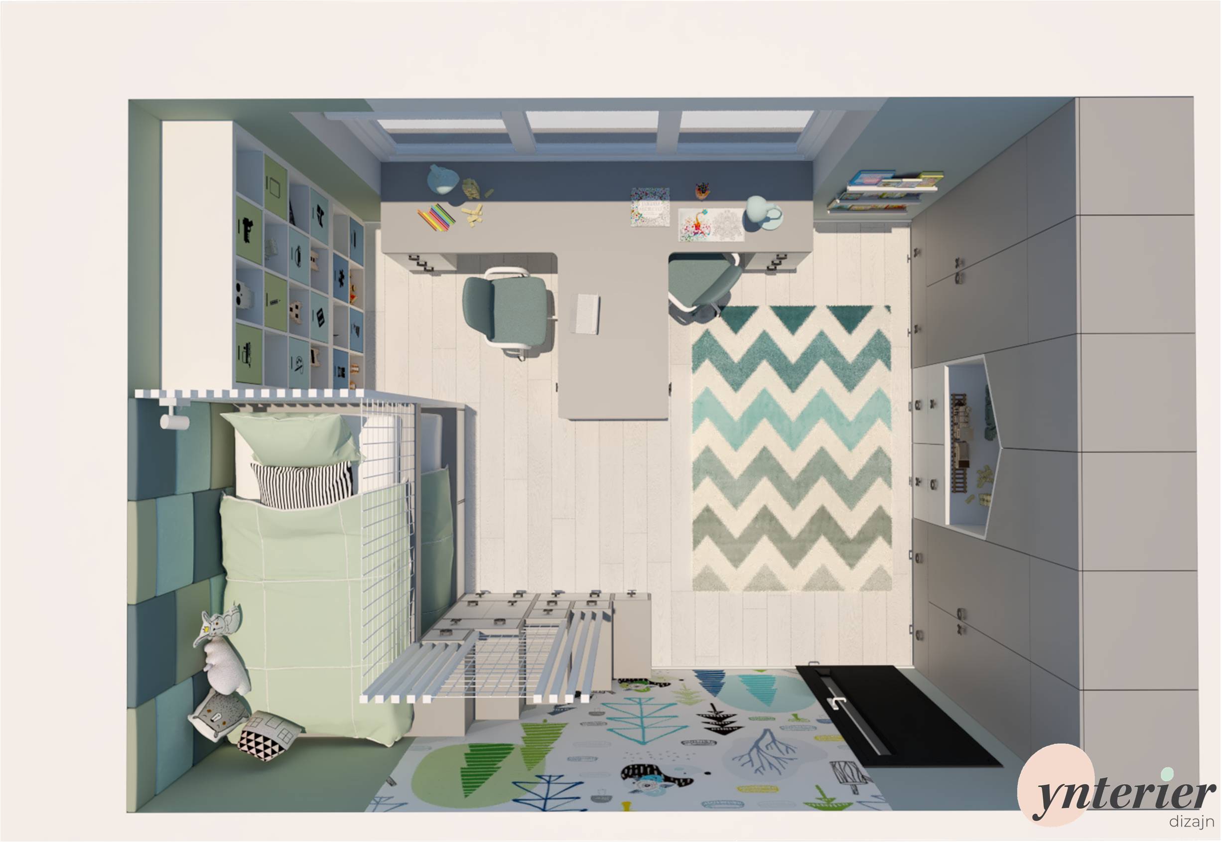 Návrh je pre izbu v rodinnom dome v rozmere 3,6m x 5,4m. Základ, ako svetlosivá podlaha a antracitové dvere, bol už už daný. K tomu sme doladili nábytok v sivobielej kombinácií s kontrastnými čiernymi úchytkami v tvare piškvoriek. Doplnky sú v zelenej 💚 a v modrej 💙.