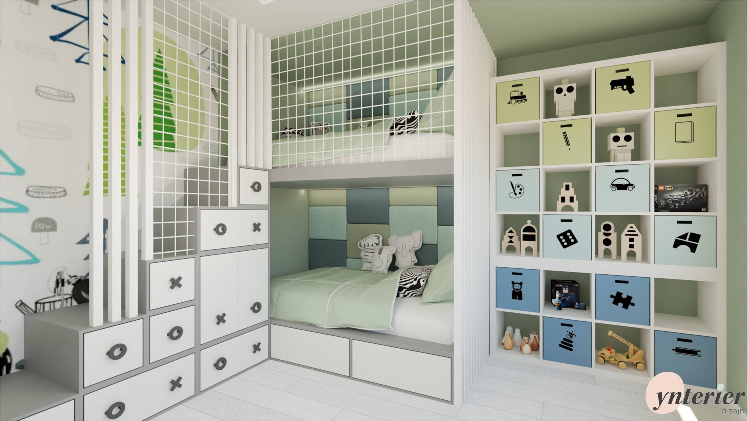 Širšie lôžka sú doplnené o zábrany z bielych lamiel a bezpečnostnej siete. Doplnkom sú aj tapacírované zásteny z farebných štvorcov. Schodíky sú tvorené zo zásuviek a skriniek na schovávanie vecí.