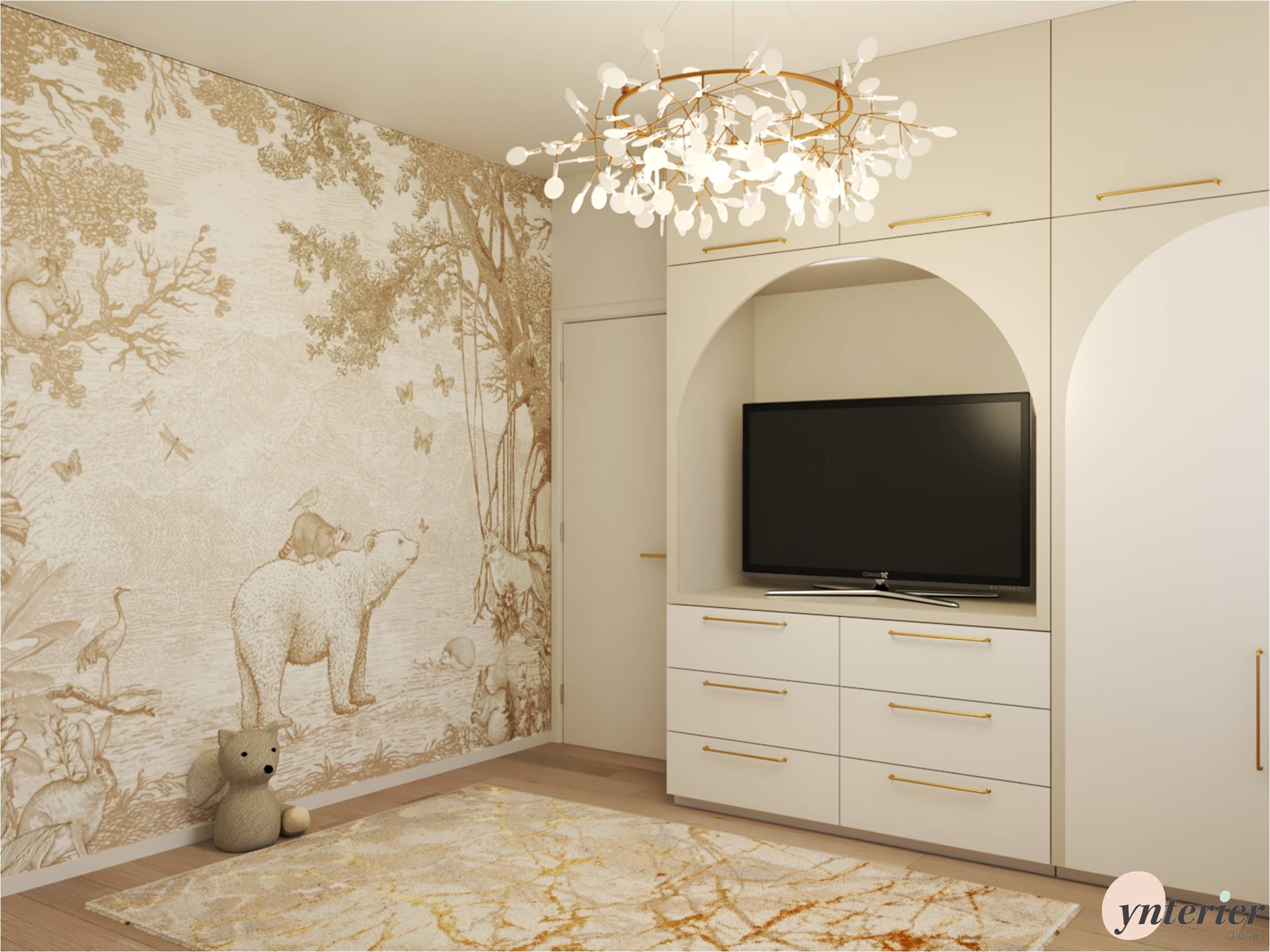 Zvolili sme dizajn, ktorý kombinuje krémovú, bielu a zlaté akcenty, čo dodáva izbe elegantný, no hravý vzhľad. Jemné tapety s ilustráciami zvieratiek dodávajú priestoru rozprávkovú atmosféru.