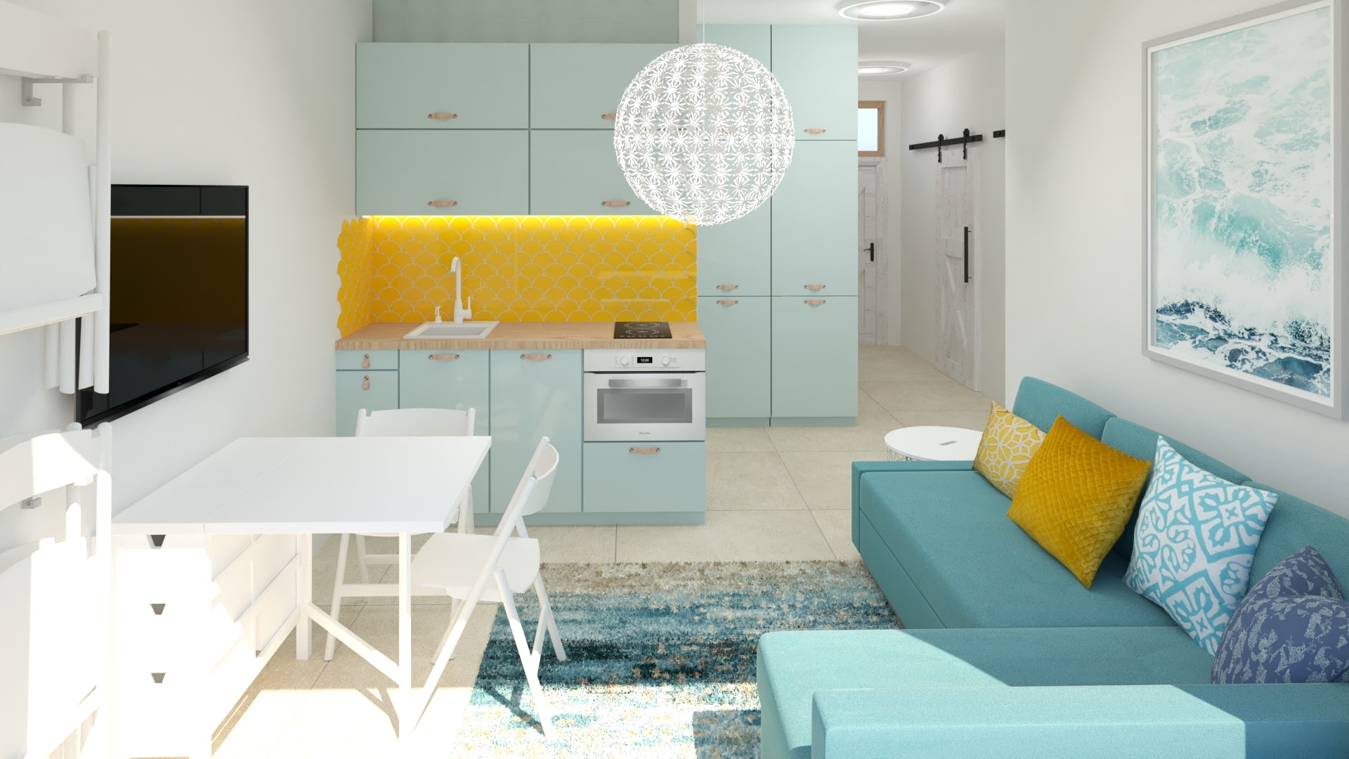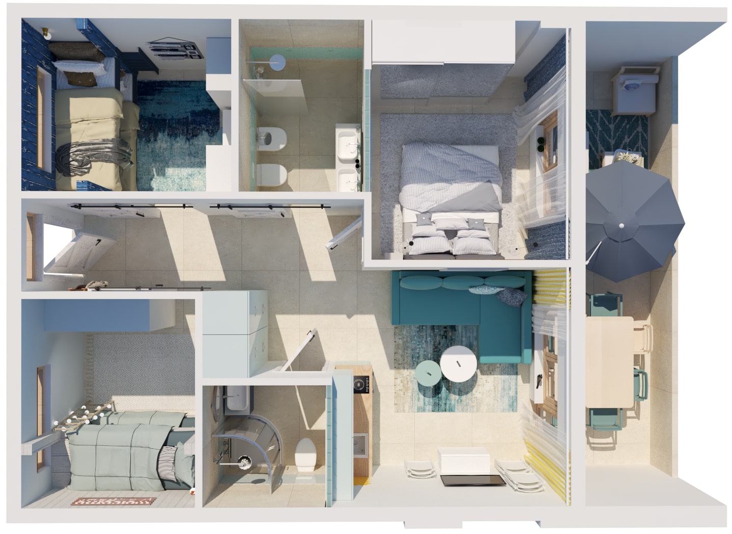 Dostal sa nám do rúk zaujímavý projekt navrhnúť malý byt v Taliansku, ktorý má slúžiť ako dovolenkový apartmán na krátkodobý prenájom. Úlohou bolo vytvorenie troch samostatných spální, dvoch kúpeľní a viacúčelovej obývačky s kuchynkou. Pri návrhu sme sa nechali inšpirovať morom a pieskom.