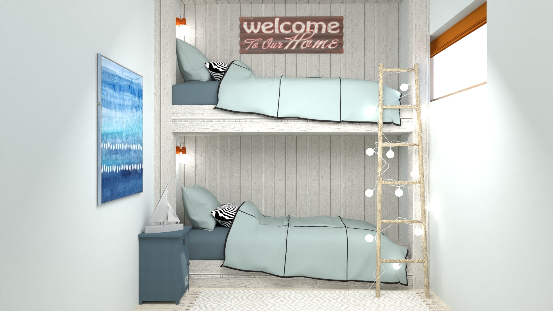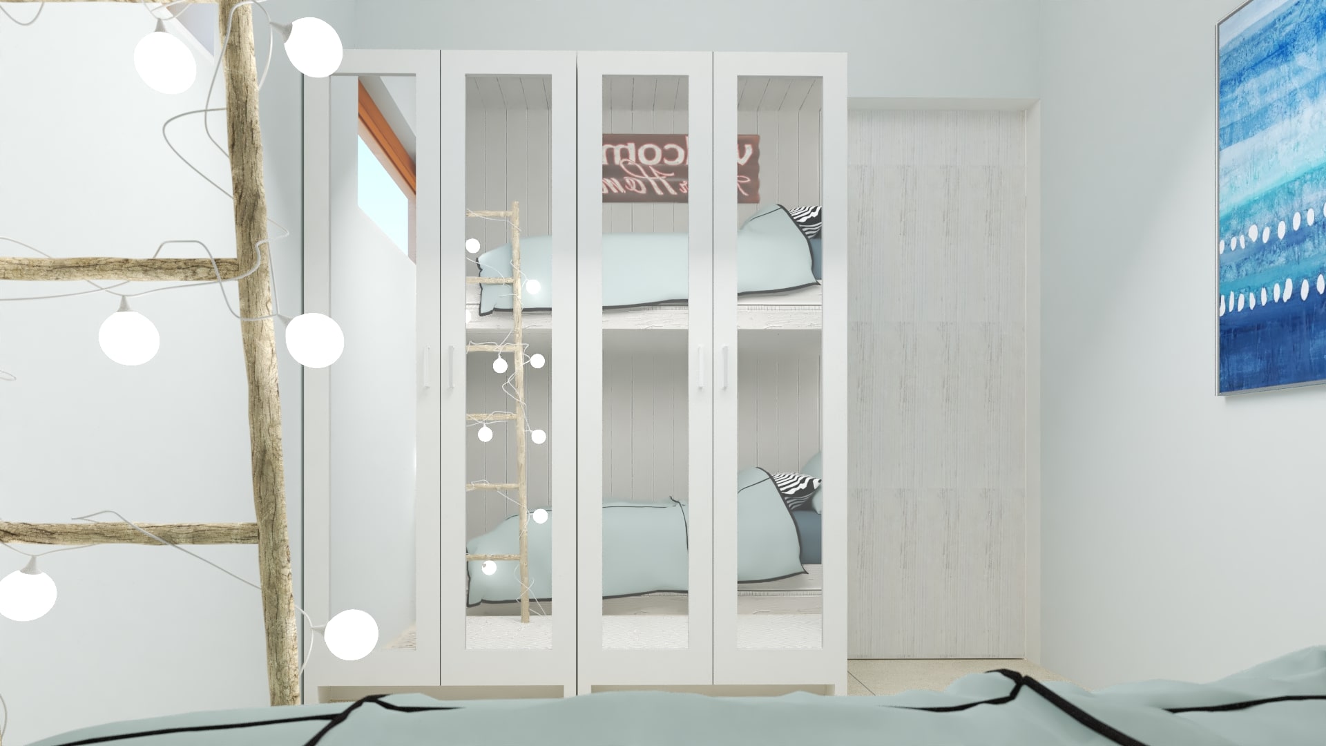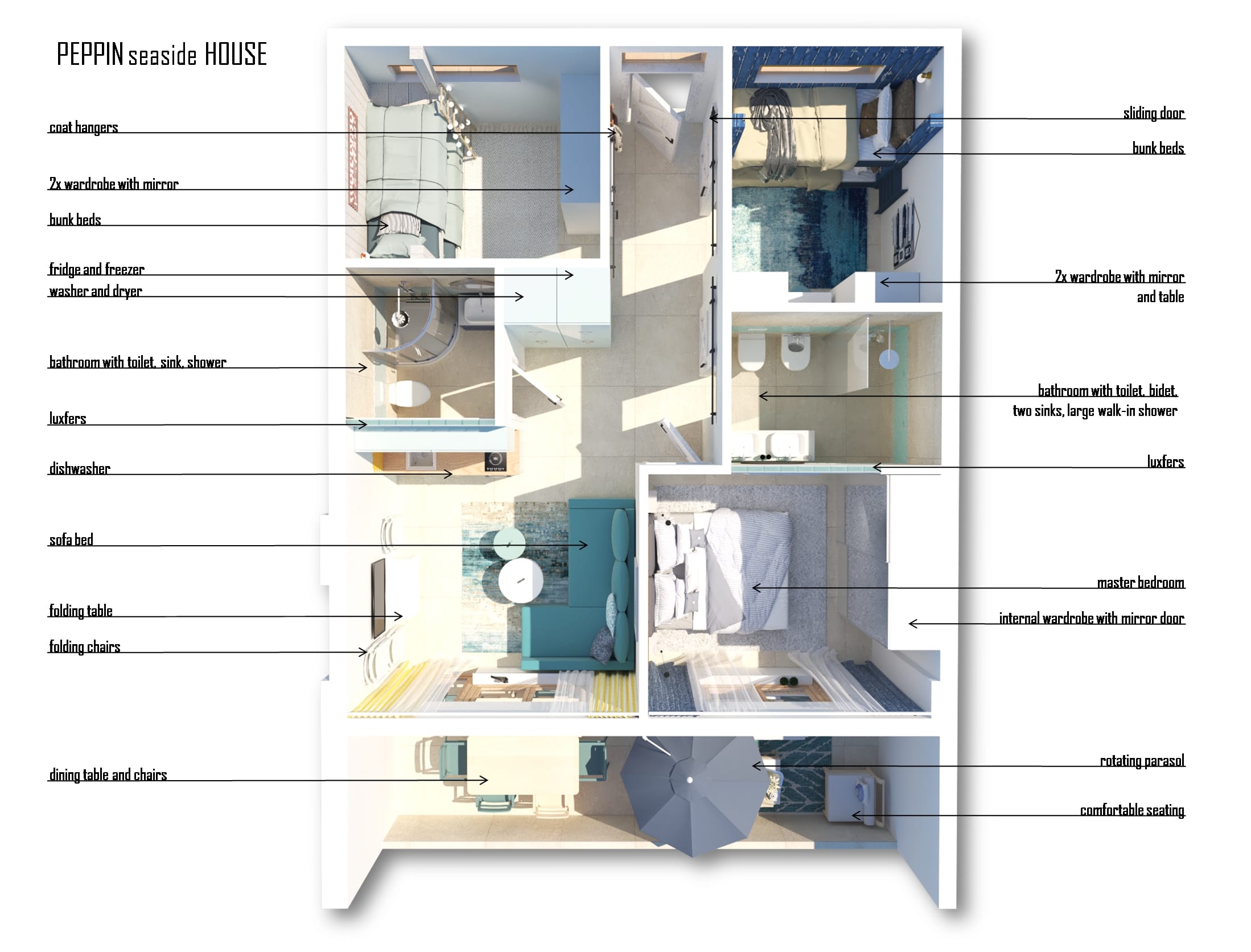 Multifunkčná obývačka s kuchynským kútom v sebe skrýva viac ako sa môže zdať. Gauč je rozkladací a slúži na spanie pre ďalších hostí. Stolík pod tv je zároveň jedálenský stôl a dá rozložiť do viacerých polôh. Kuchynka aj keď je malá, obsahuje umývačku riadu. A v dvoch vysokých skrinkách zas nájdete zabudovanú chladničku s mrazničkou a práčku so sušičkou. Kúpeľne sú inšpirované morským pobrežím. Dlažba je vo farbe piesku a obklady pripomínajú morské vlny. Spálne sú malé, ale prakticky zariadené…Vedeli by ste si aj vy predstaviť takéto dovolenkové ubytovanie?