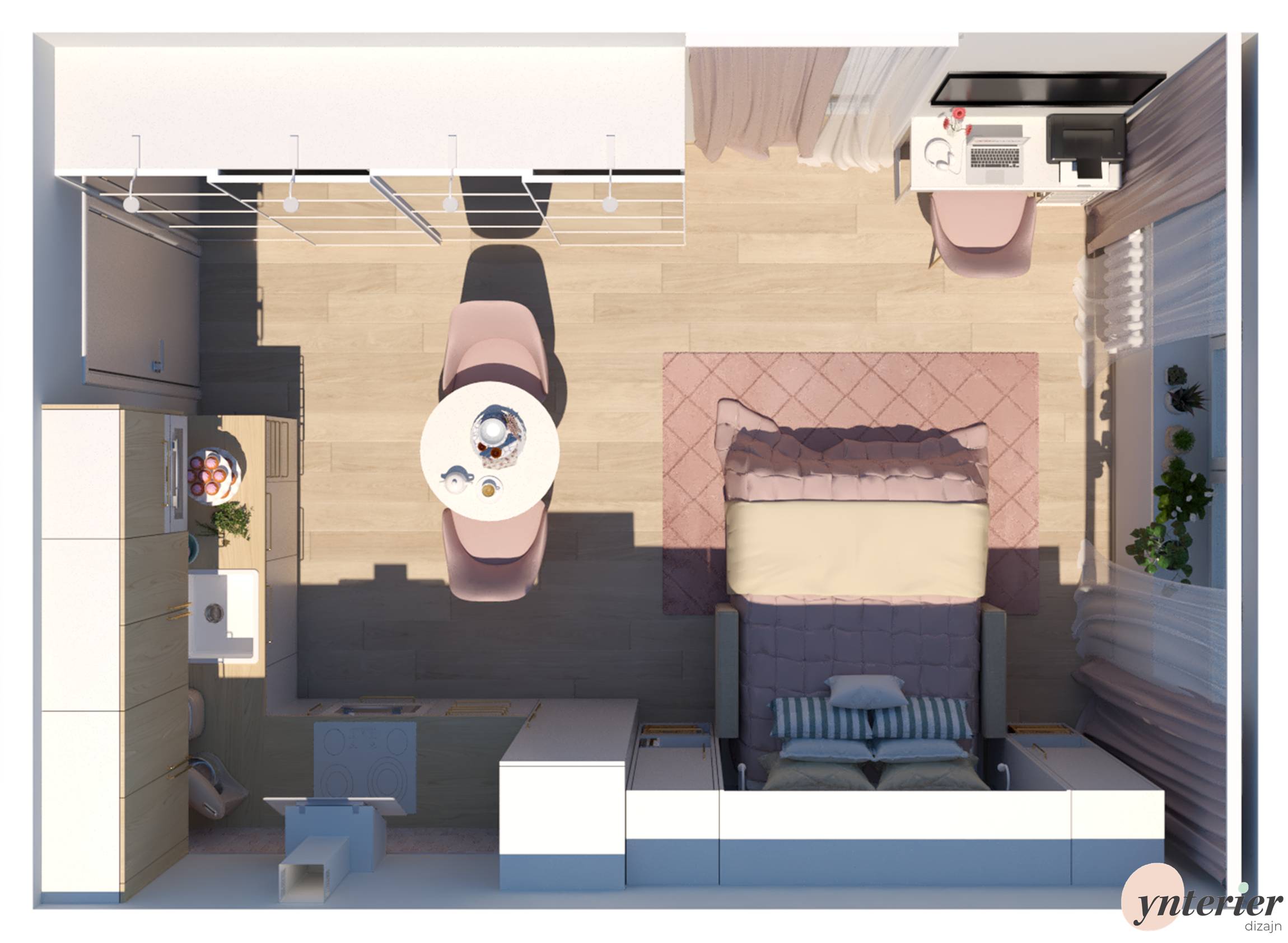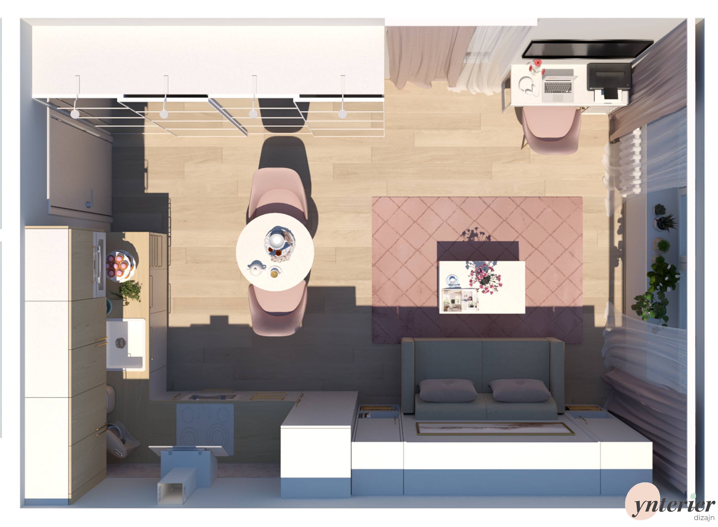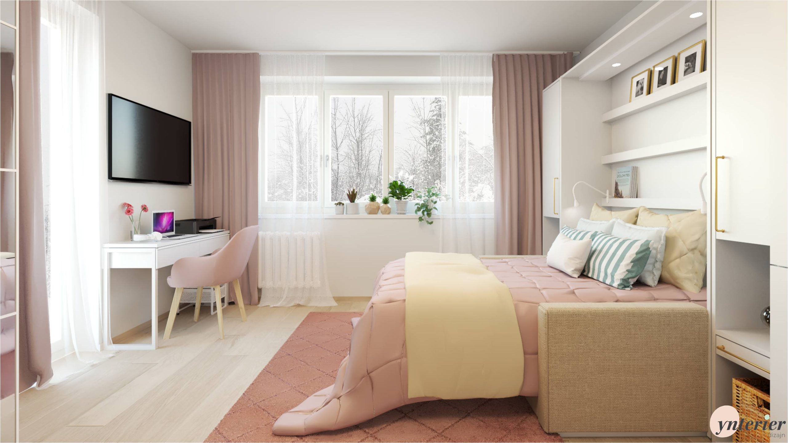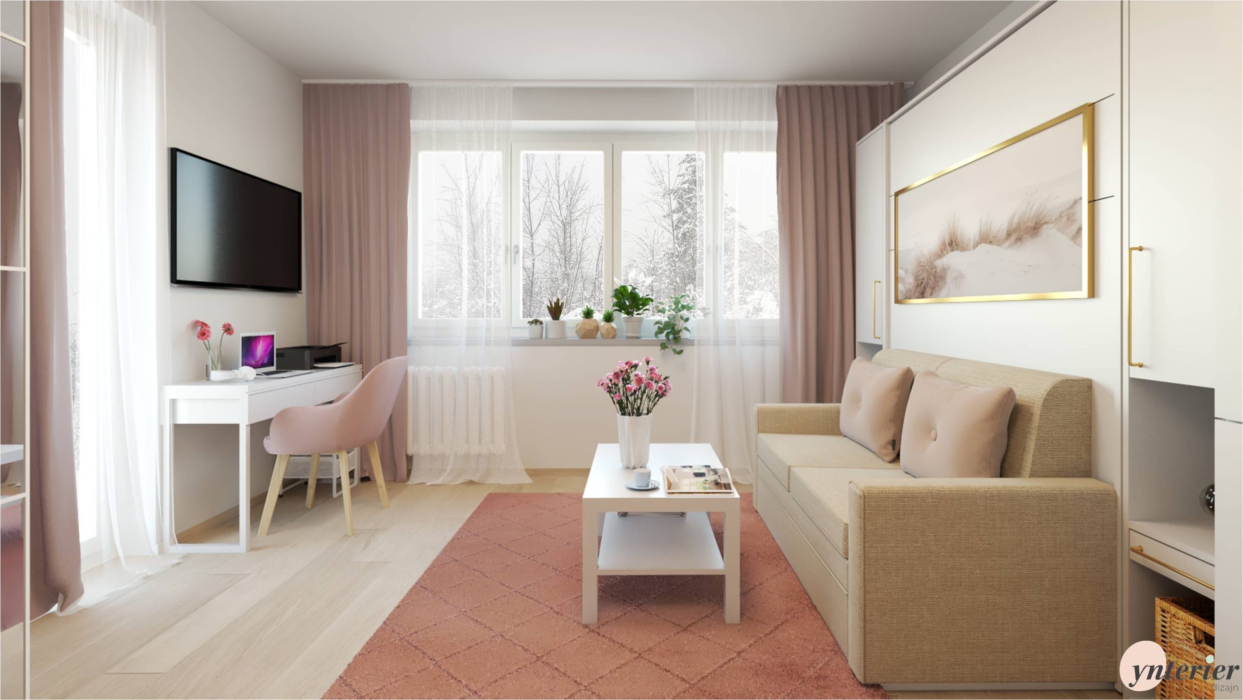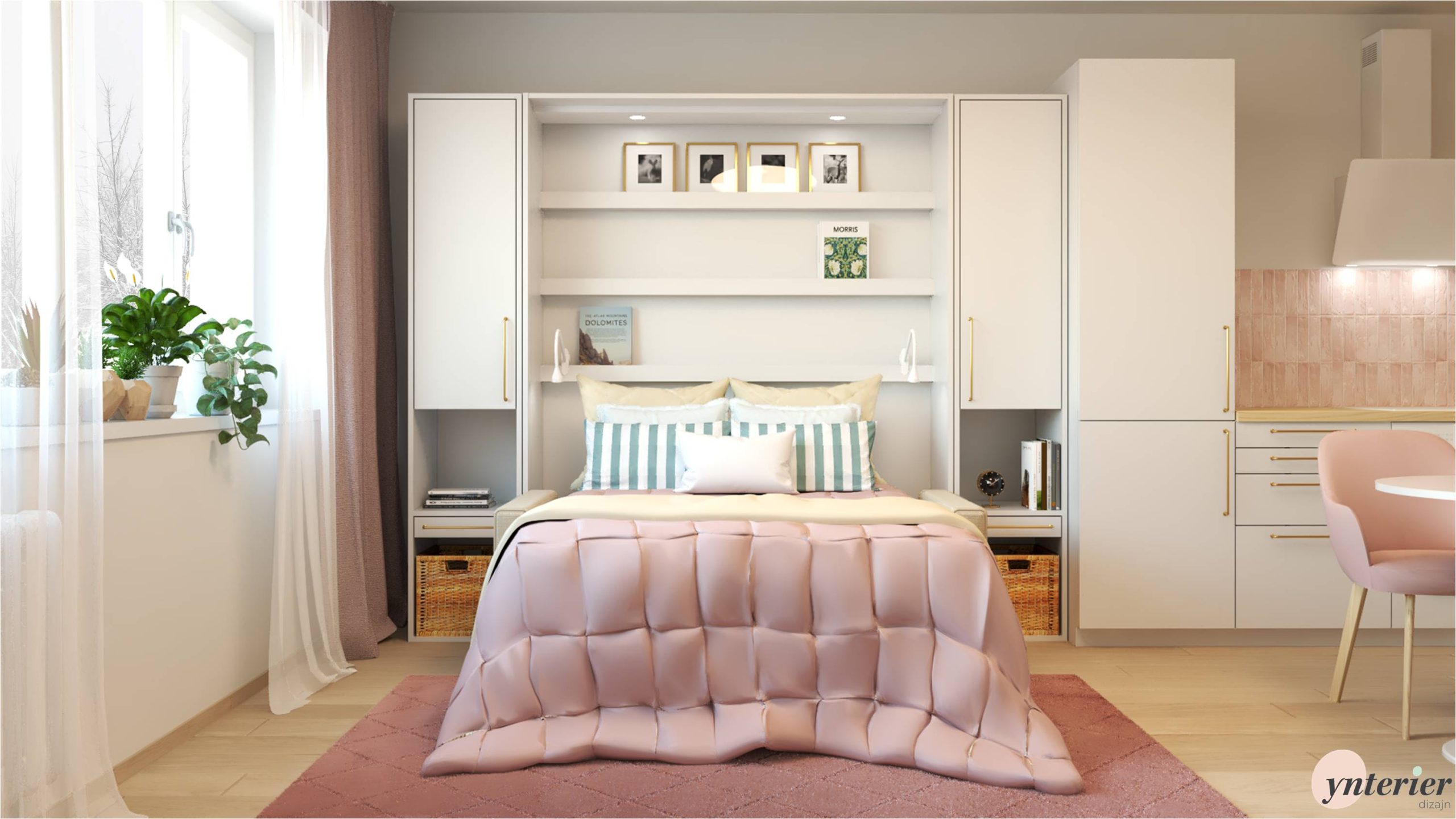 Ďalšou vychytávkou je výklopná posteľ, vďaka ktorej máme obývačku a spálňu 2v1. Cez deň miestnosť plní funkciu pohodlnej obývačky a večer sa premení na útulnú spálňu.