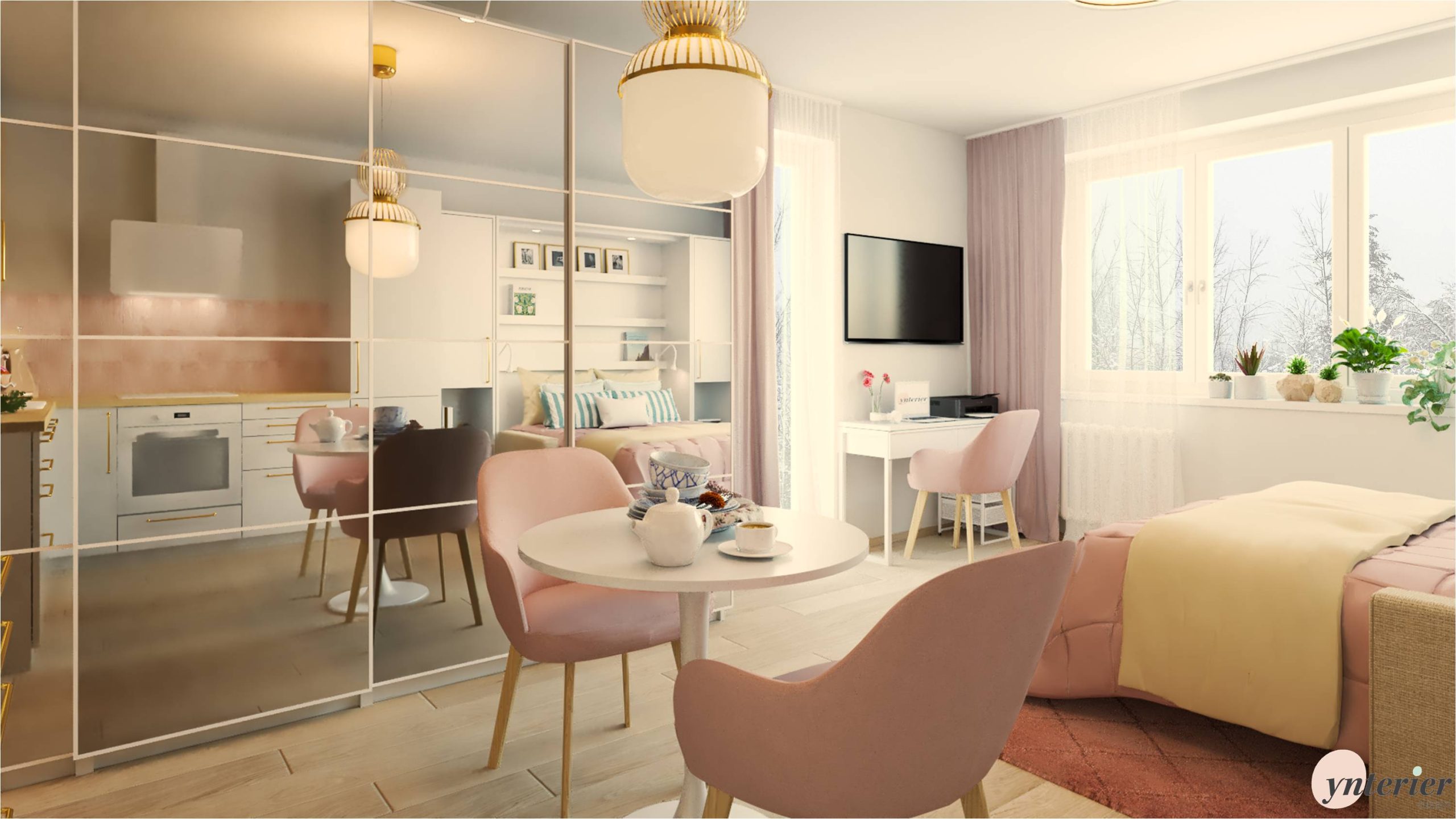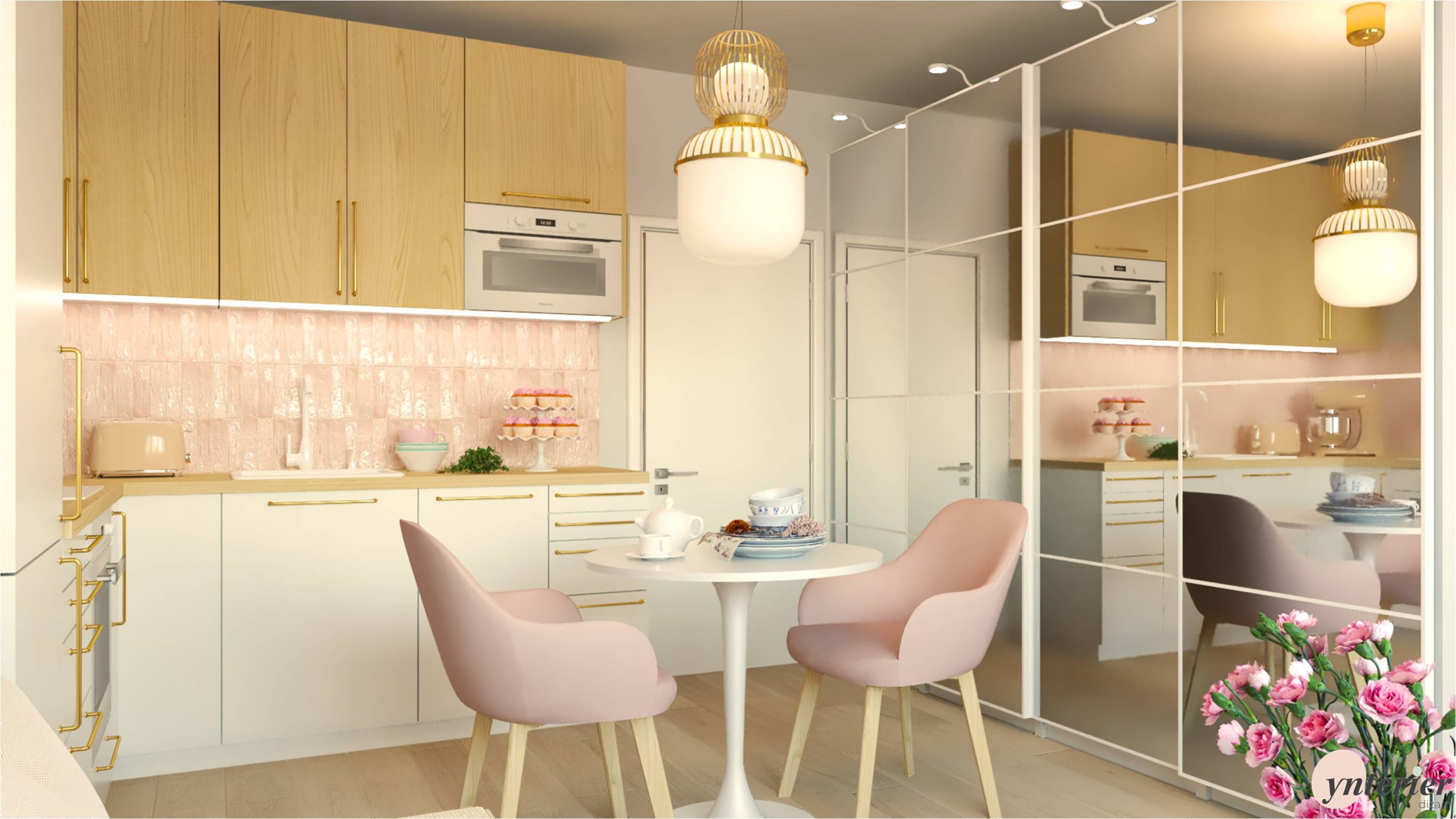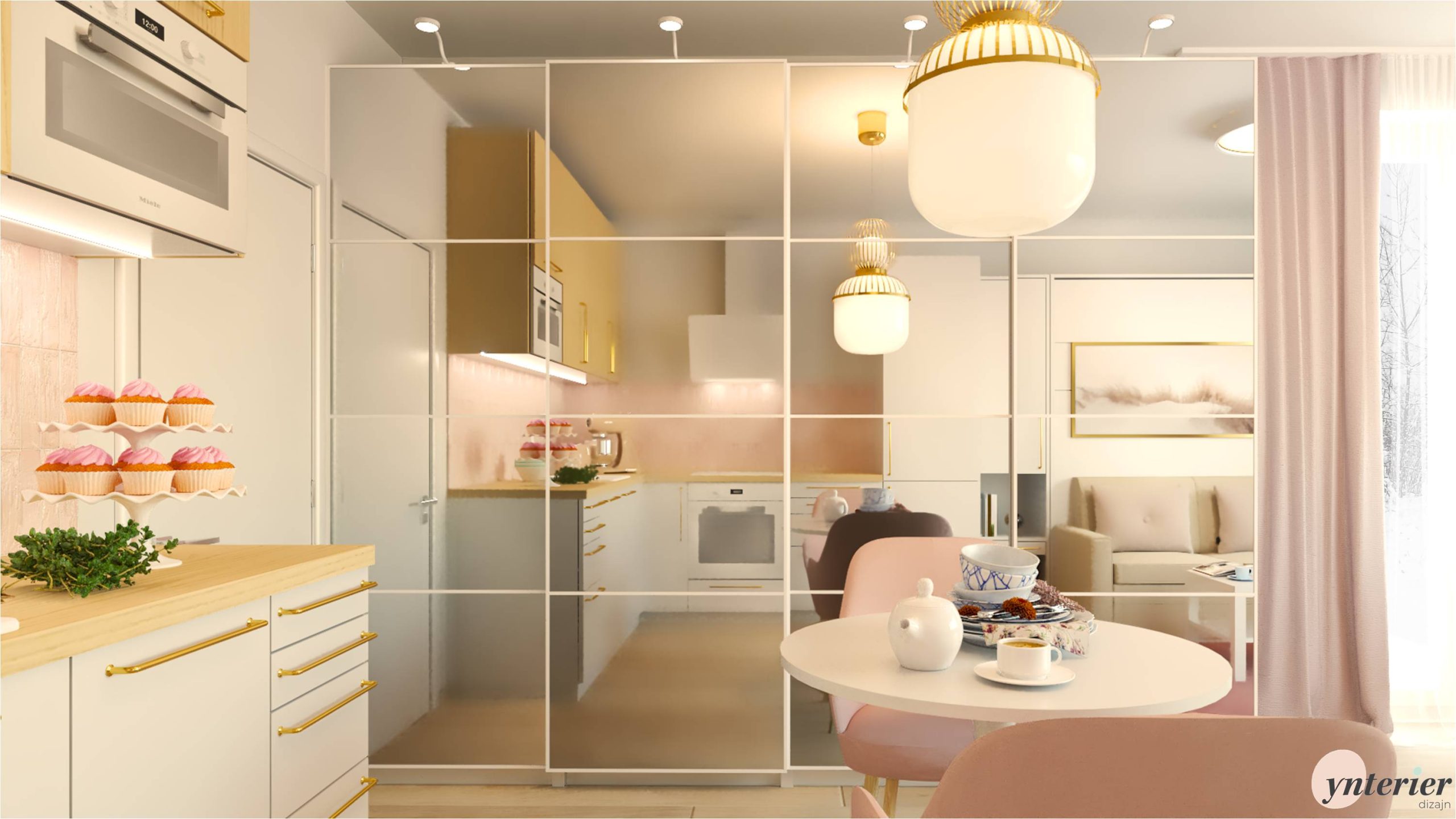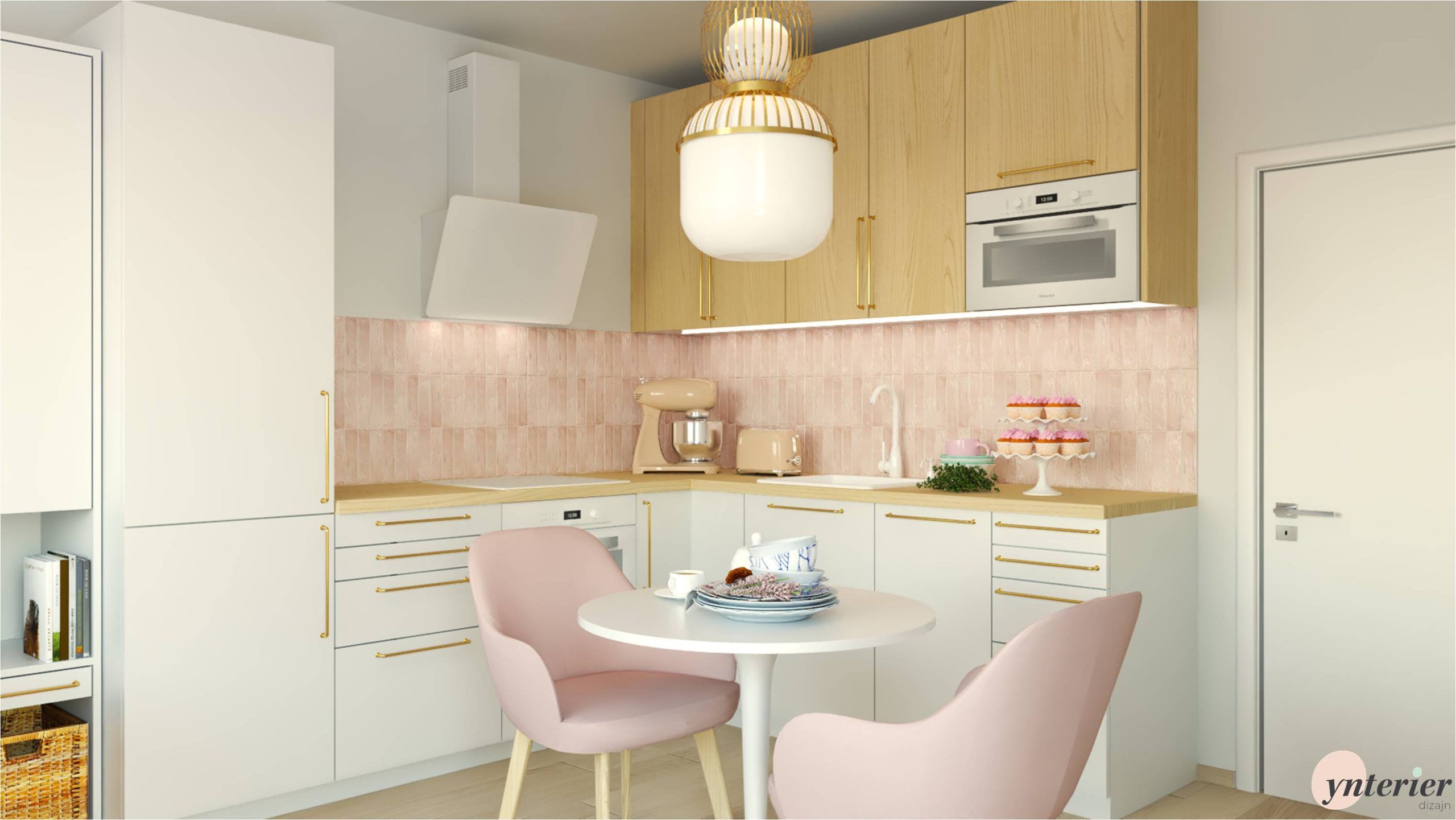 Interiér je navrhnutý v ženskom štýle, presne podľa predstáv majiteľky. Základný nábytok je v neutrálnej bielej farbe, ktorú dopĺňa štruktúra dreva. Doplnky sú v zlatej a v ružovej.