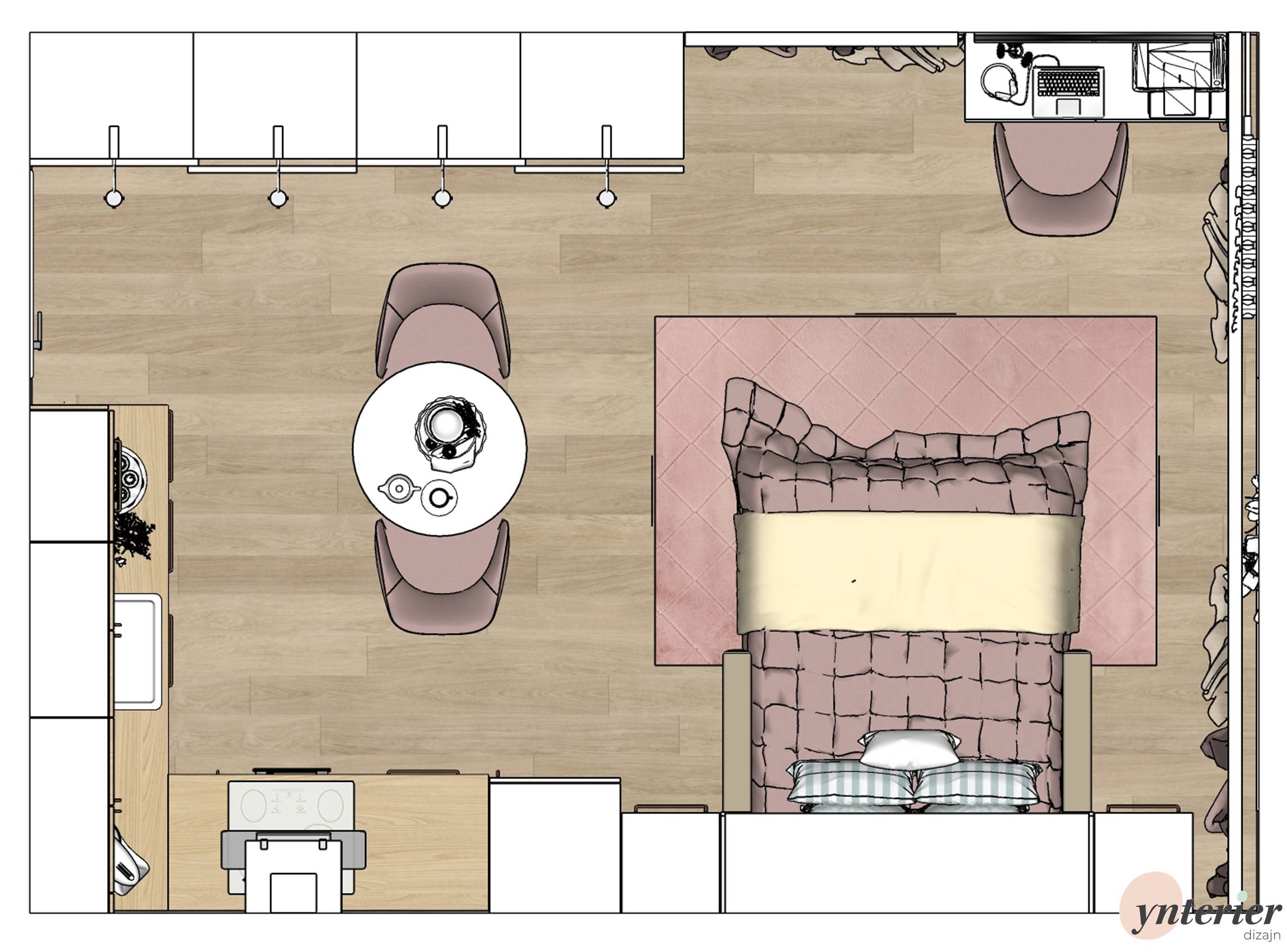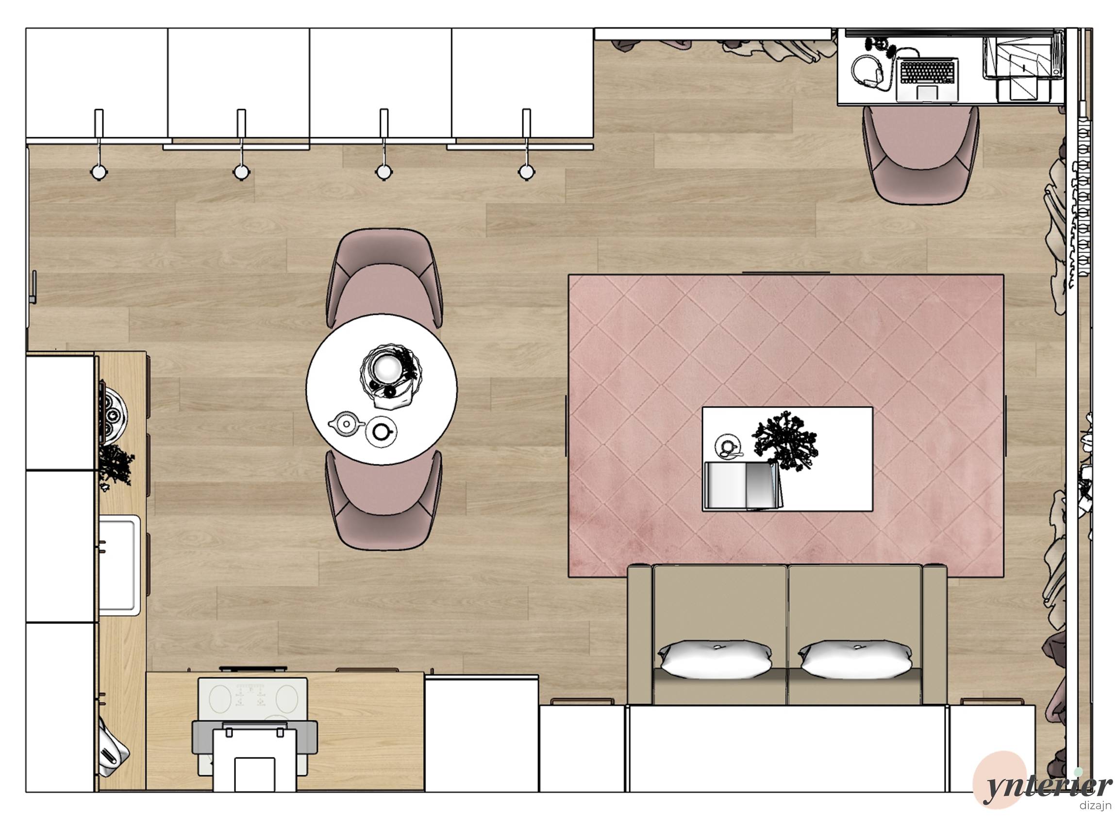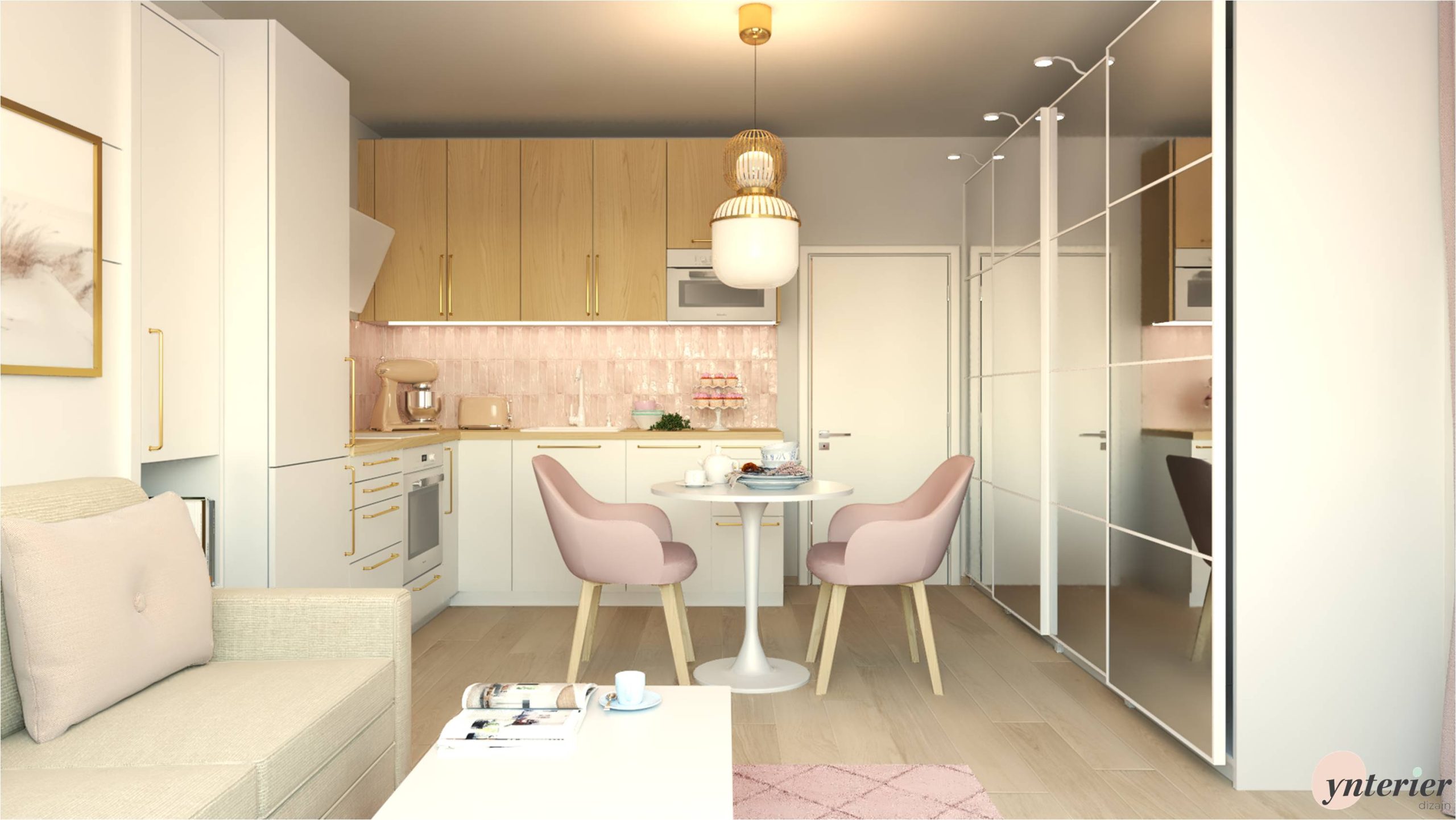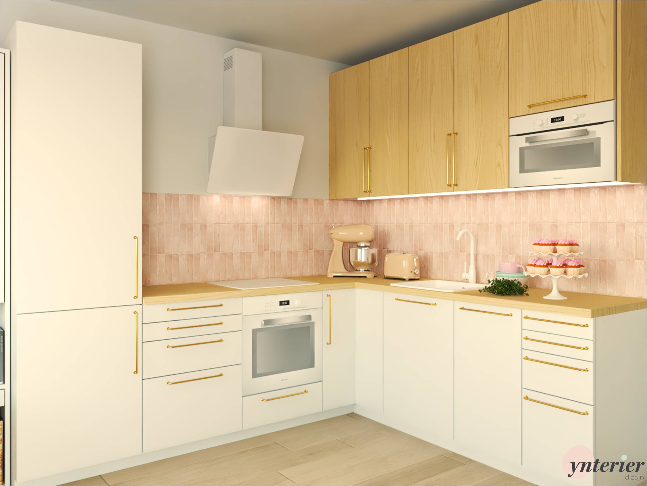 Interiér je navrhnutý v ženskom štýle, presne podľa predstáv majiteľky. Základný nábytok je v neutrálnej bielej farbe, ktorú dopĺňa štruktúra dreva. Doplnky sú v zlatej a v ružovej.