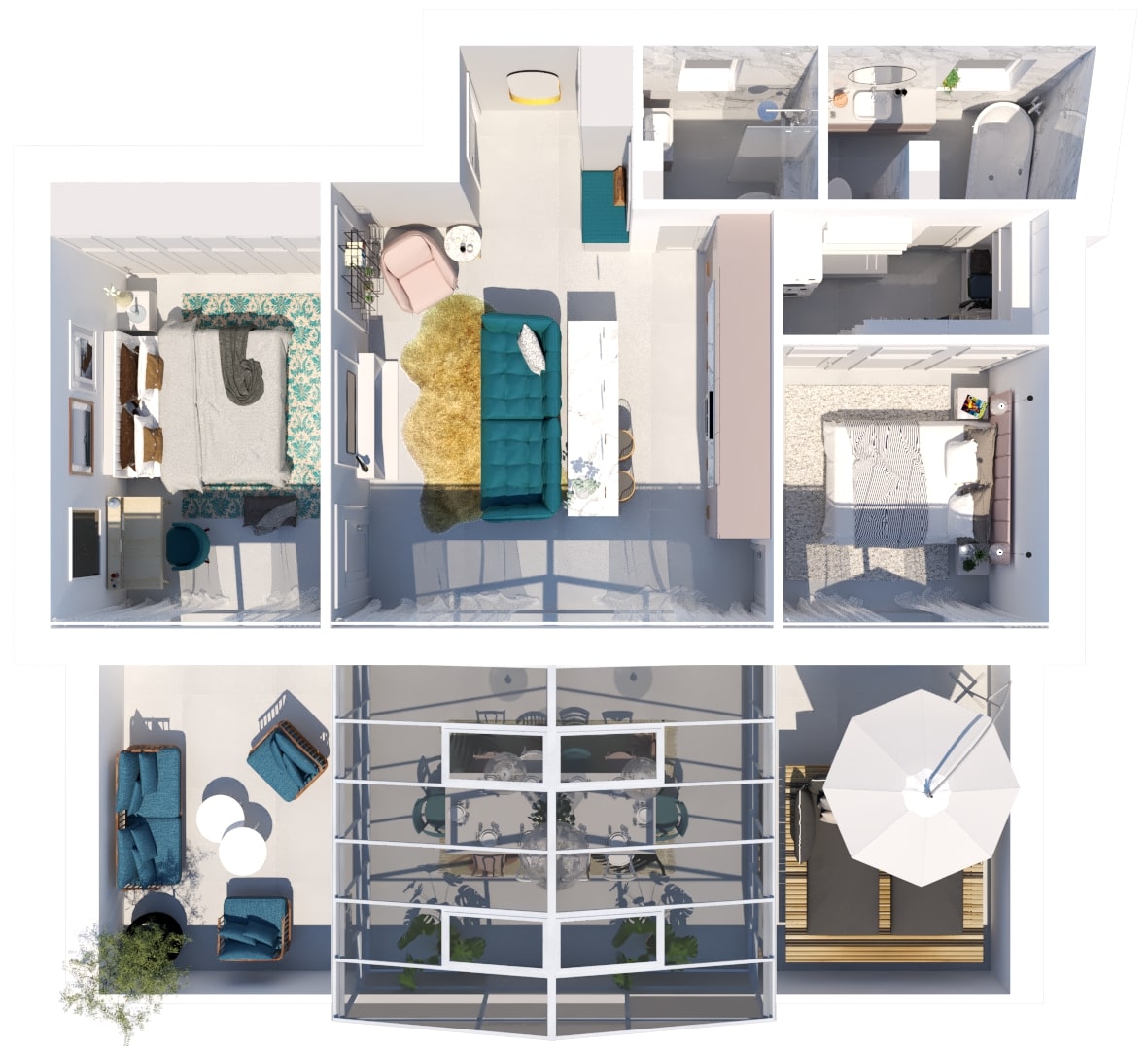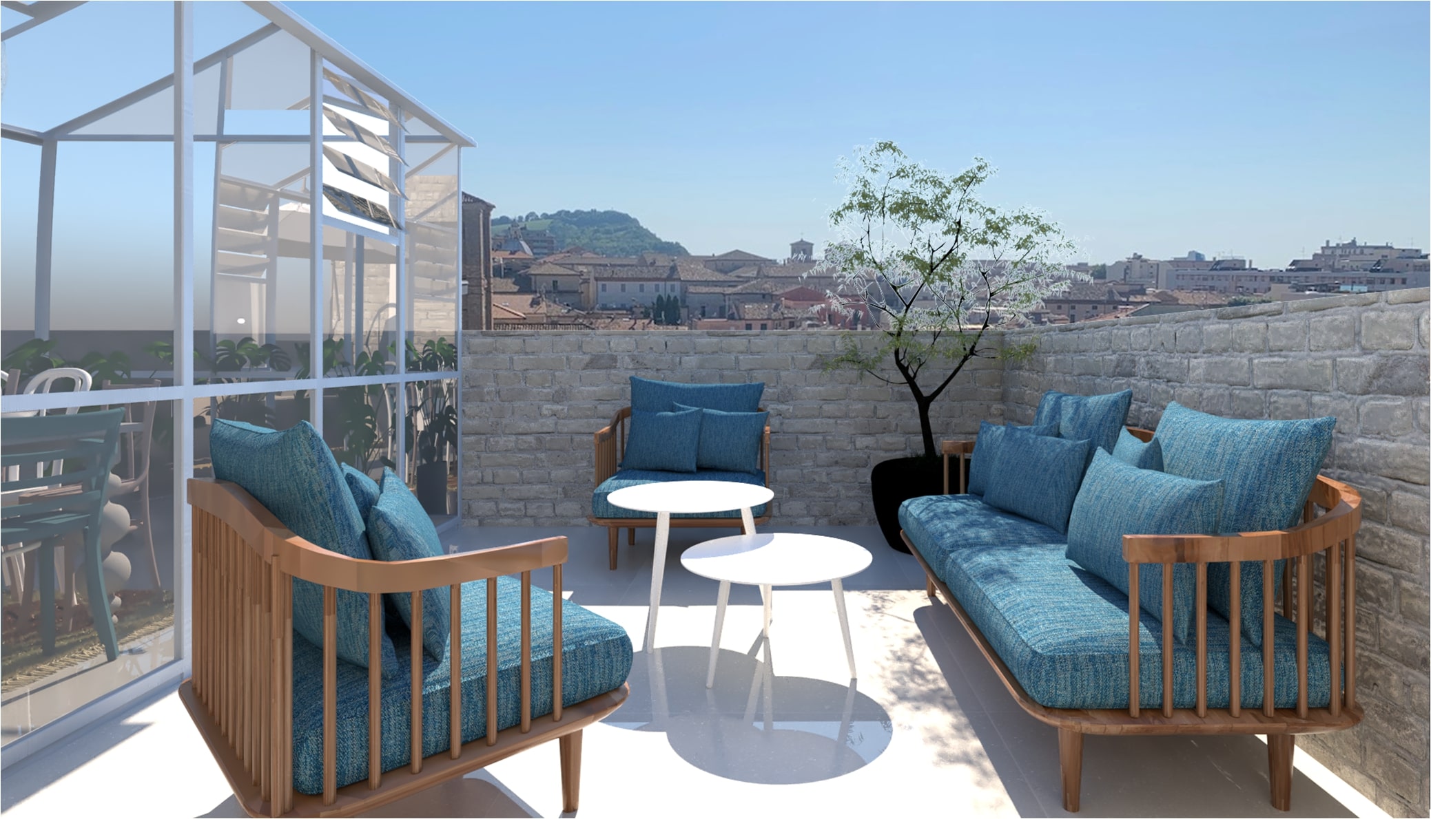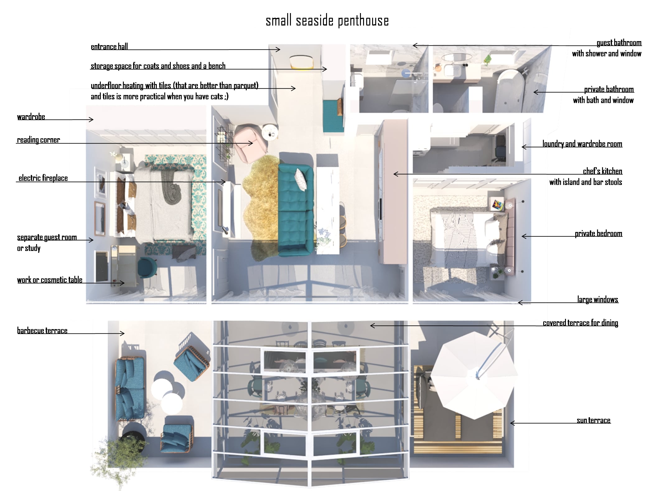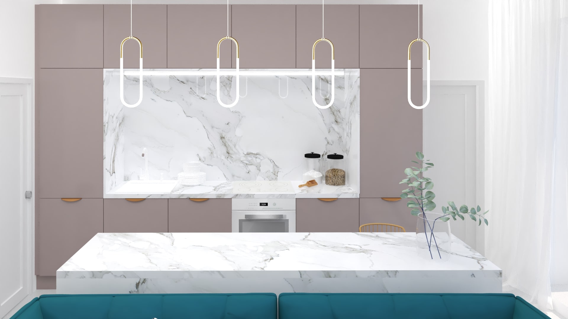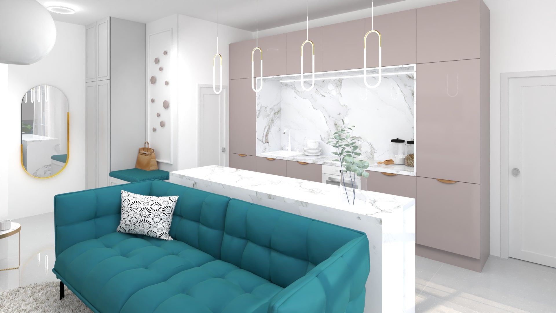 Navrhovali sme taliansky apartmán v ženskom štýle. Požiadavkou bola veľká kuchyňa ako pre šéfkuchára, čo sa nám podarilo splniť. Jedálenské sedenie sme presunuli do zimnej záhrady. Dve spálne a dve kúpeľne boli nevyhnutnosťou. Pravé časť bytu je súkromná pre majiteľku a tá druhá pre hostí. V celom návrhu sa prelínajú rovnaké farby a materiály, ktoré tvoria jeden celok.