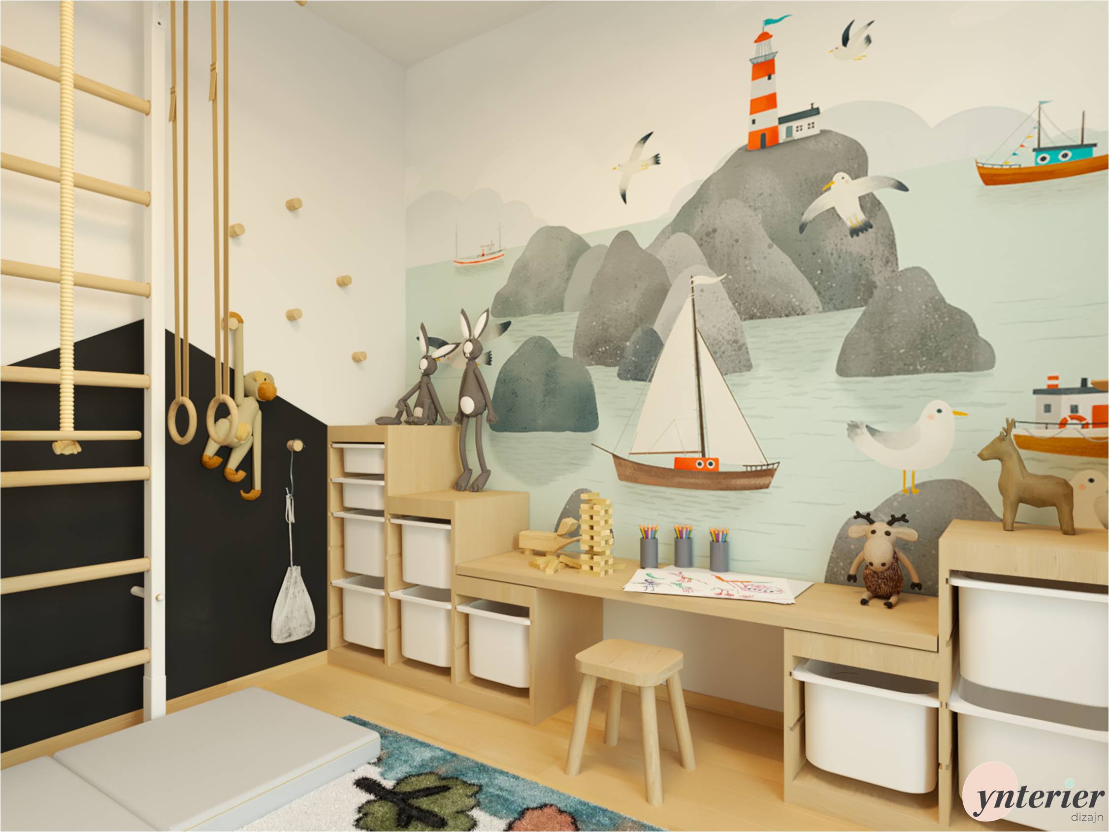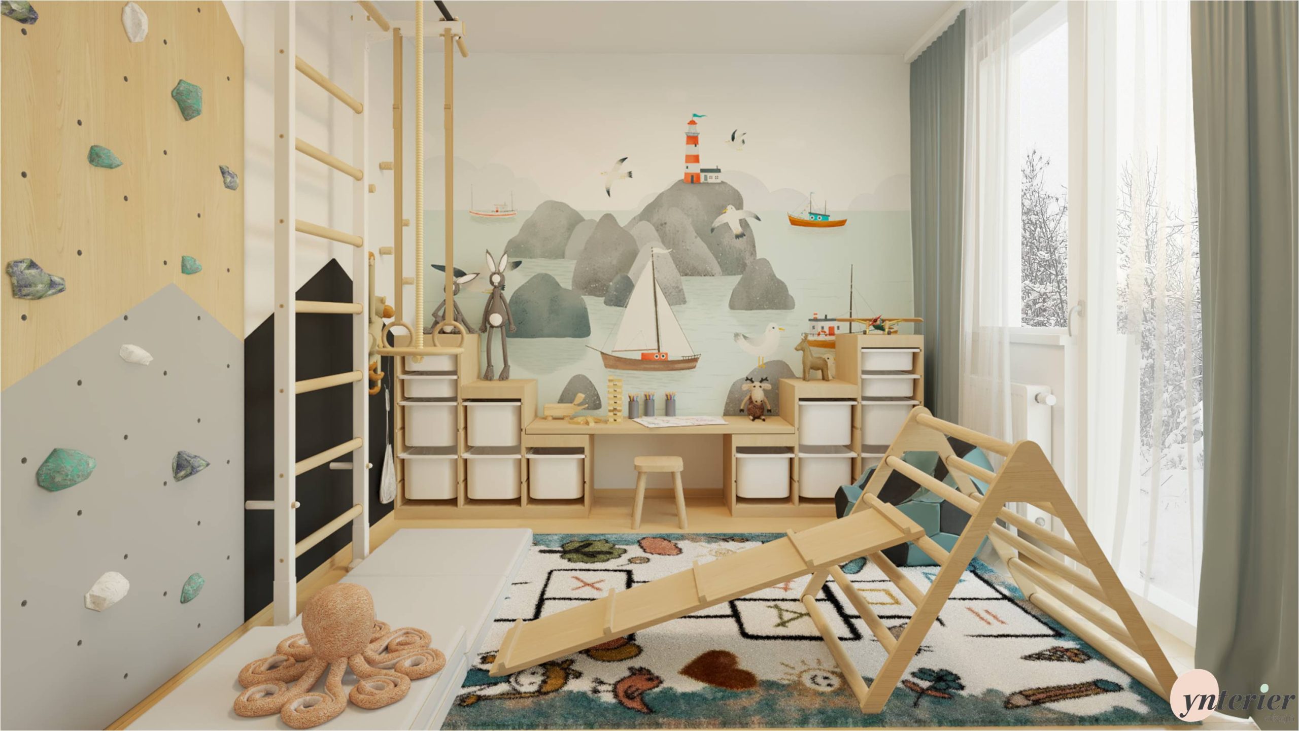 Hlavným vizuálnym prvkom herne je nádherná nástenná maľba s námornou tematikou – maják, lode a more vytvárajú atmosféru dobrodružstva. Táto téma stimuluje detskú predstavivosť a zároveň dodáva miestnosti jedinečný štýl. - Doplnky a detaily