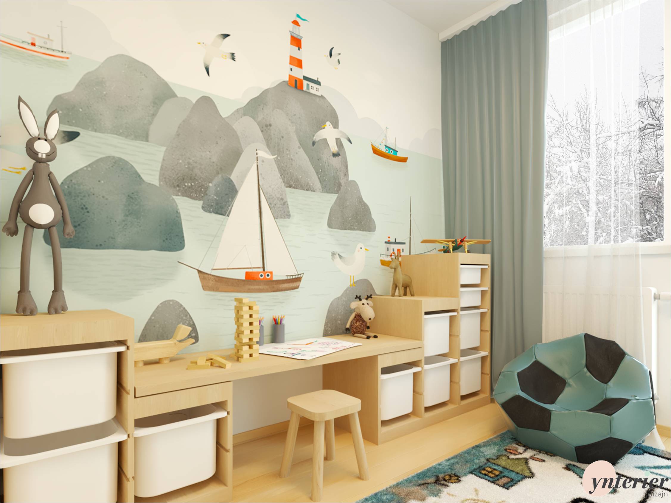 Na pracovnom stole s dostatkom úložného priestoru sa dieťa môže venovať kresleniu, skladaniu puzzle alebo štúdiu. Zásuvky na hračky a potreby sú prispôsobené na jednoduché uskladnenie, čo podporuje poriadok v miestnosti. - Námorná téma interiéru