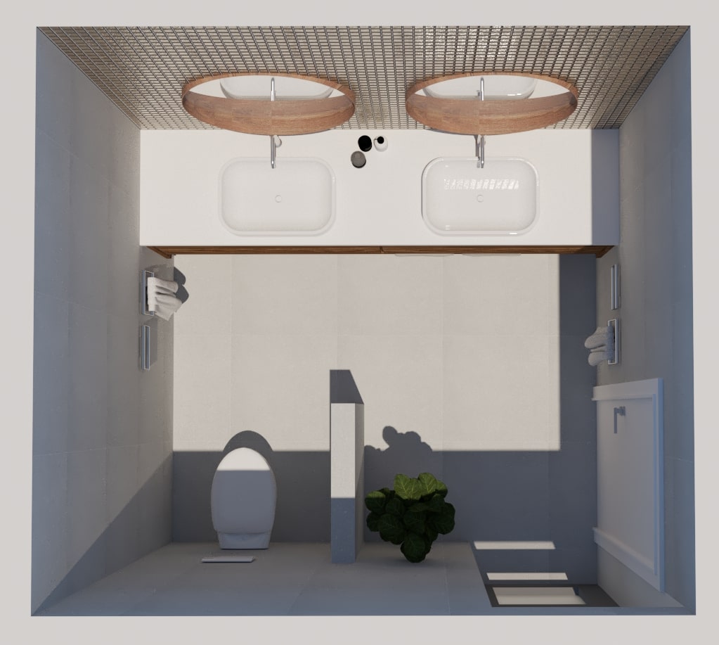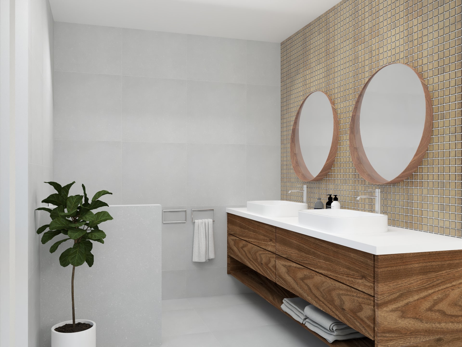 Návrh plný kontrastov. Keďže sme sa rozhodli na hlavnú stenu použiť zlatú mozaiku, ostatok musel byt neutrálny. Ako doplnok sme preto zvolili nenápadnú betónovú dlažbu, ktorá nechala vyniknúť dominante. Skrinkový nábytok je navrhnutý na mieru. V celom dome sa opakujú rovnaké materiály a tvoria jednotný celok.