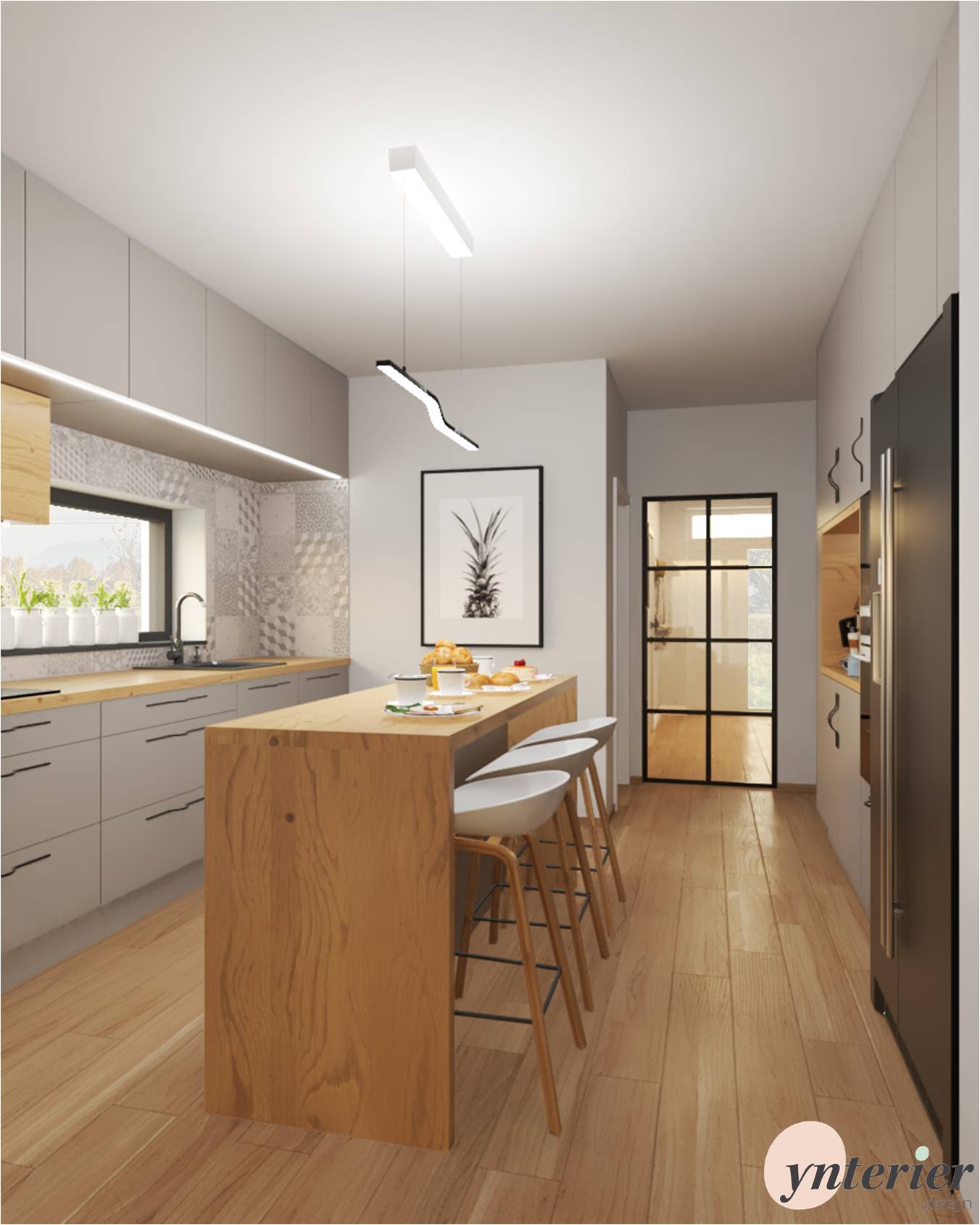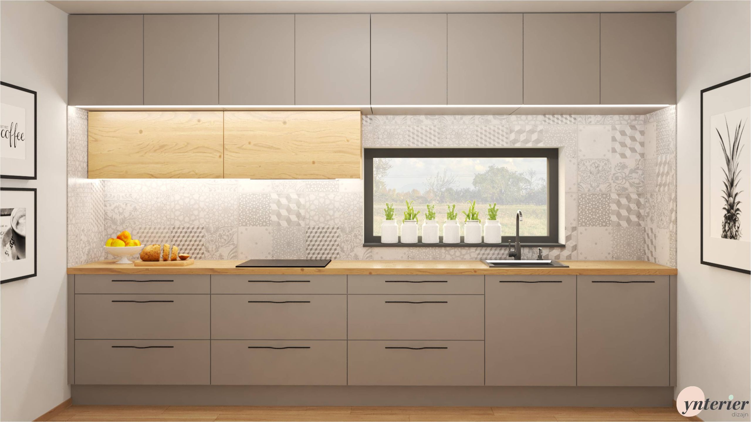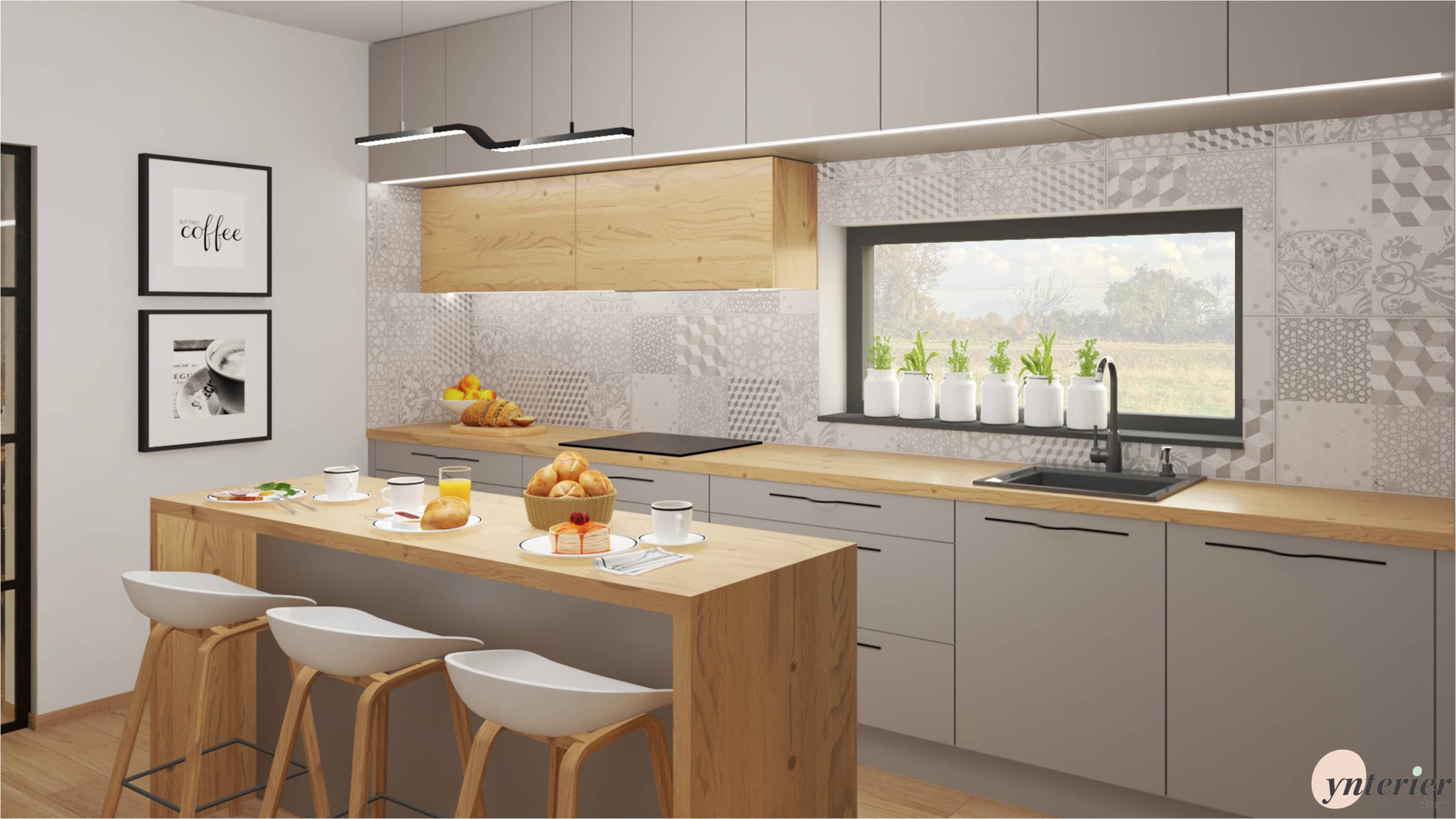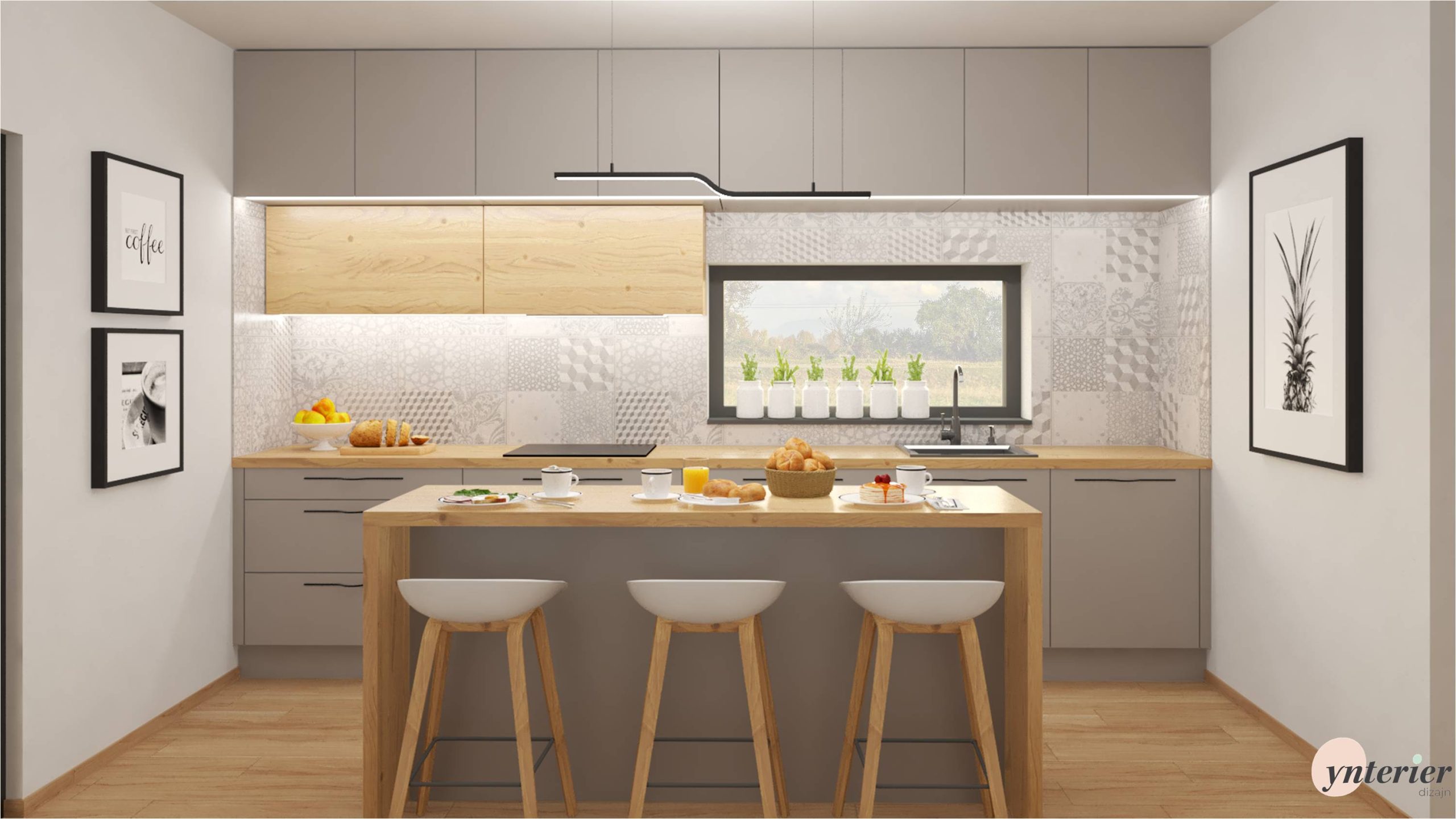 Inšpirujte sa našim návrhom kuchyne v rodinnom dome. Základom sú sivé skrinky, ktoré pekne dopĺňa dubové drevo. Výrazným prvkom sú vzorované kachličky, ktoré zaujmú na prvý pohľad .
