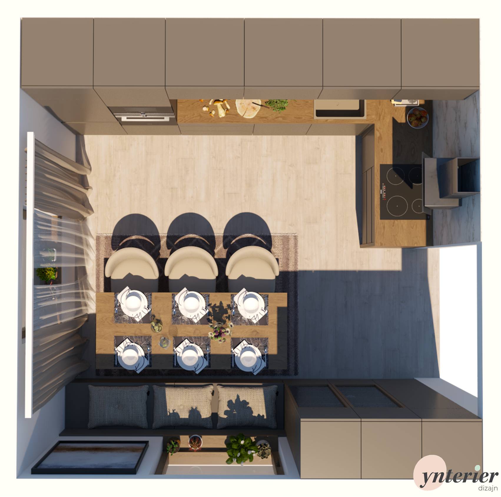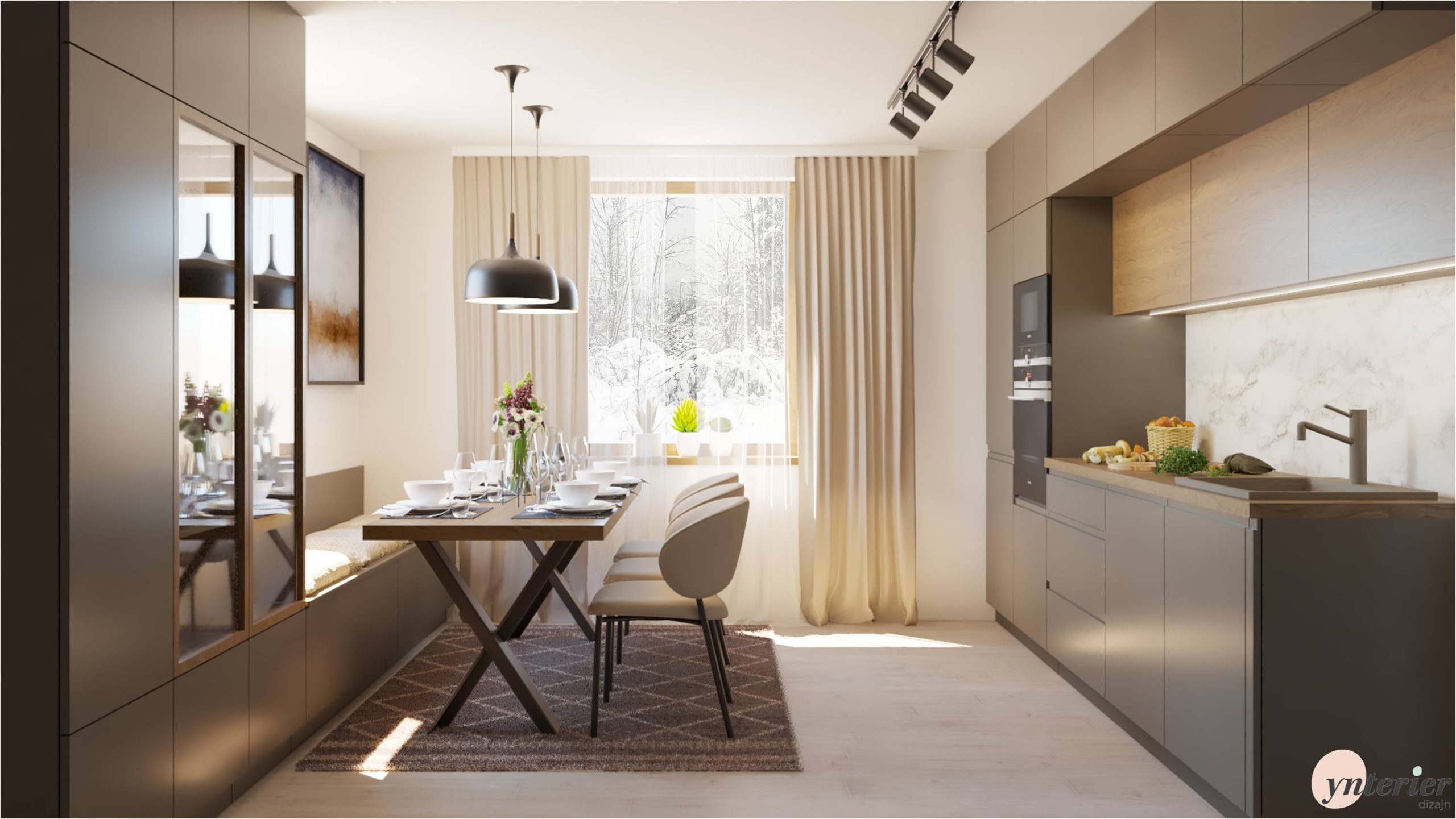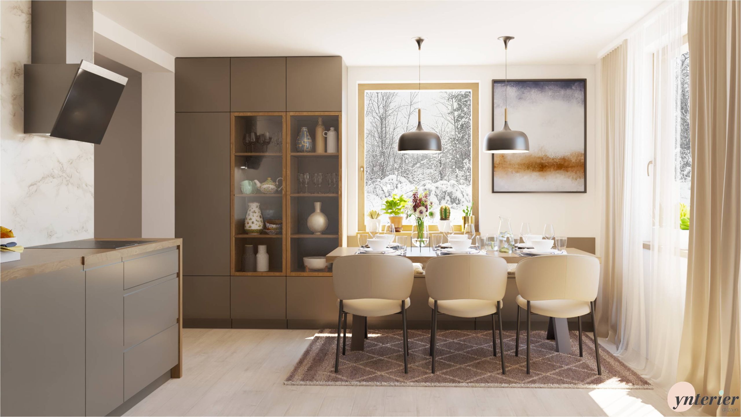 Jedným z hlavných trendov v modernom bývaní je otvorený koncept, ktorý prepojuje kuchyňu s jedálňou. V tomto prípade je jedálenský stôl vyrobený z masívneho dreva, doplnený pohodlnými stoličkami a lavicou na mieru. Táto lavica nielen šetrí priestor, ale obsahuje aj praktický úložný priestor, ktorý je ideálny na uloženie sezónnych vecí alebo iných potrieb.