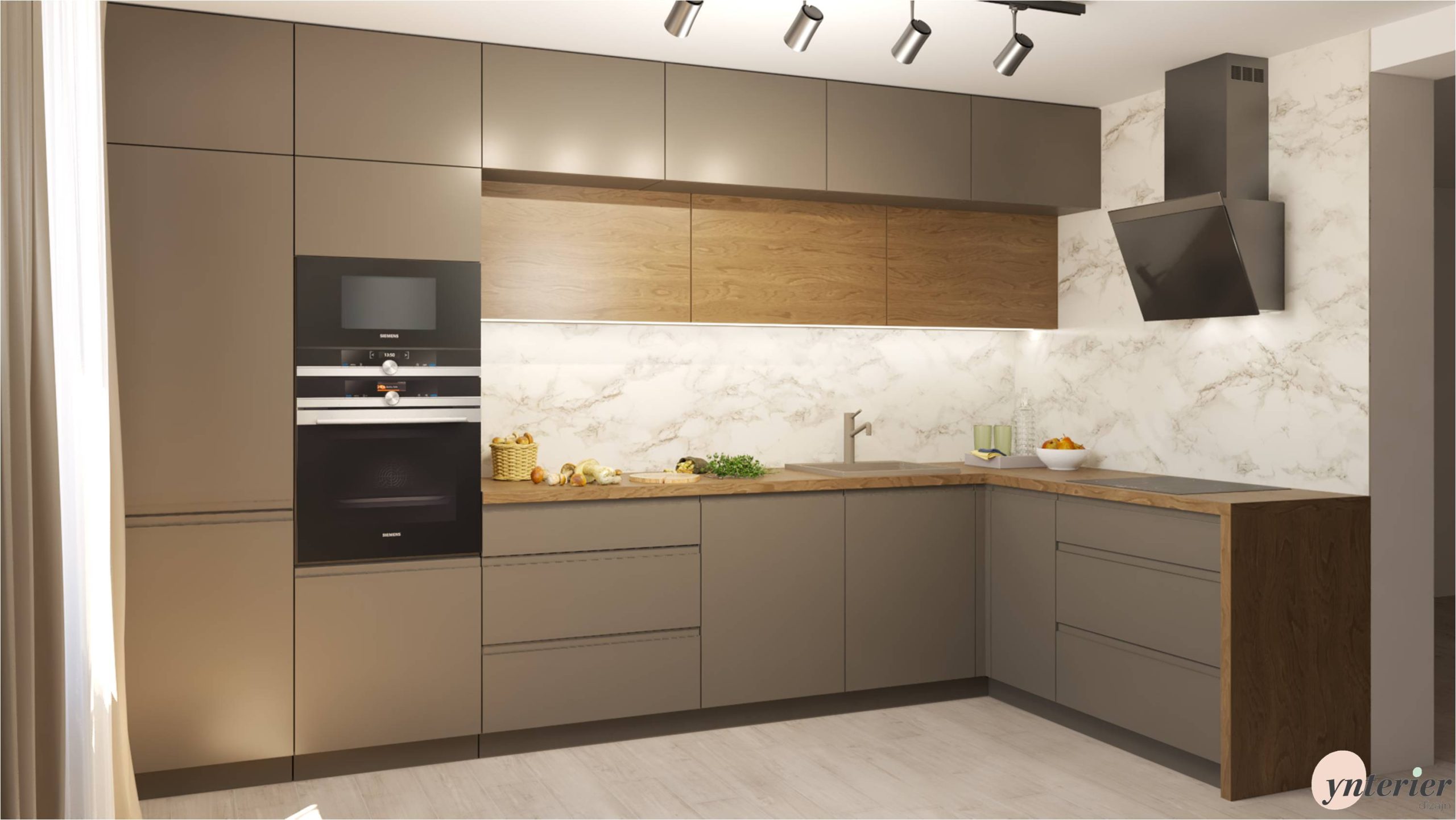 - Elegantné farebné prevedenie: Kombinácia teplých odtieňov hnedej s prírodnými drevenými akcentmi vytvára príjemnú a útulnú atmosféru. Matné povrchy znižujú odlesky a dodávajú priestoru sofistikovaný vzhľad.