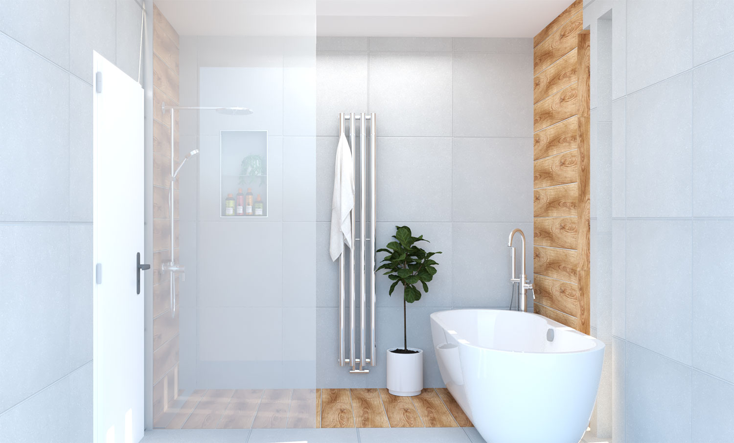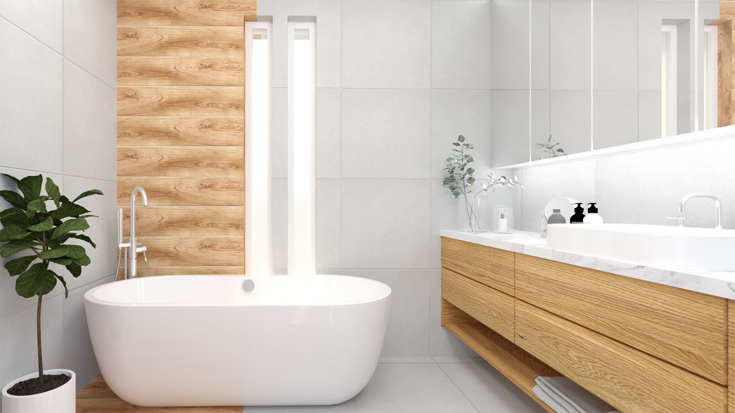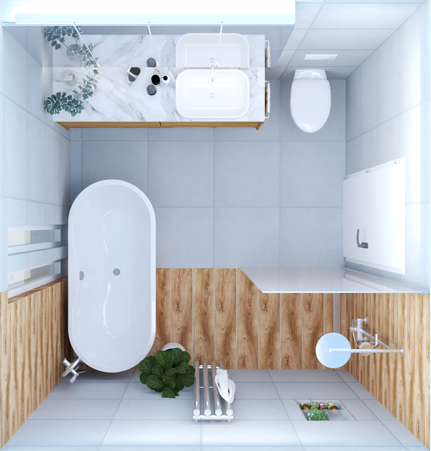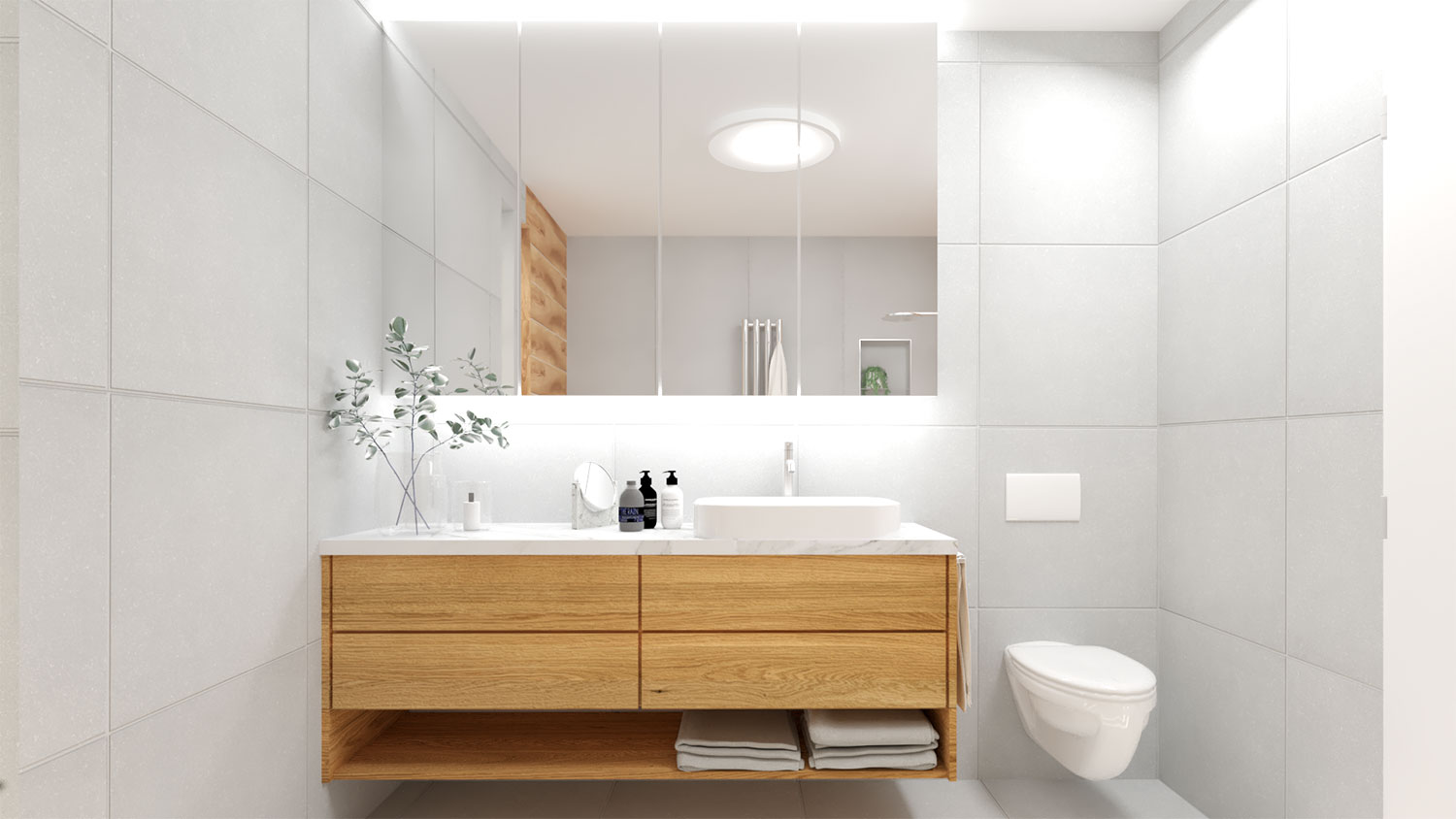 Návrh rekonštrukcie kúpeľne sa niesol v teplých farbách a nadčasovosti riešenia. Majitelia si želali dostatok úložných priestorov a zmenu klasického kúpeľňového okna. Návrh rešpektuje tieto želania. Pri vstupe do miestnosti upúta voľne stojaca vaňa a novo navrhnuté podlhovasté okná s mliečnym sklom.  Dopĺňa ich obklad s drevodekorom, ktorý plynule prechádza na stenu za vaňou a aj v mieste sprchového kúta. Opticky tiež vymedzuje mokrú zónu na jednej strane miestnosti. Druhá strana je venovaná umývadlu a toalete. Dostatok úložného priestoru na kozmetiku je v hornej skrinke a v spodnej je zas miesto na uteráky. Obe sú navrhnuté na mieru pre tento priestor.