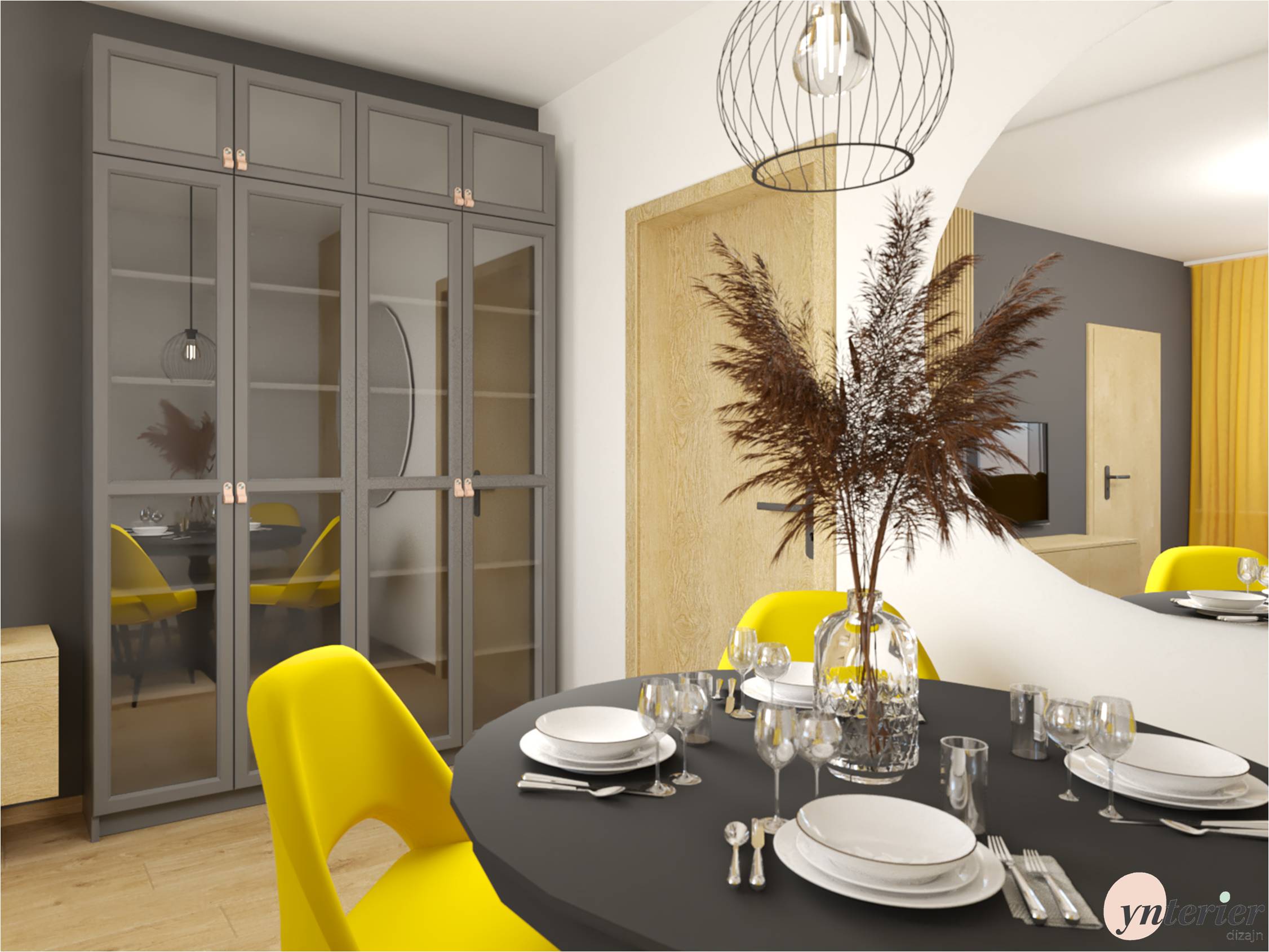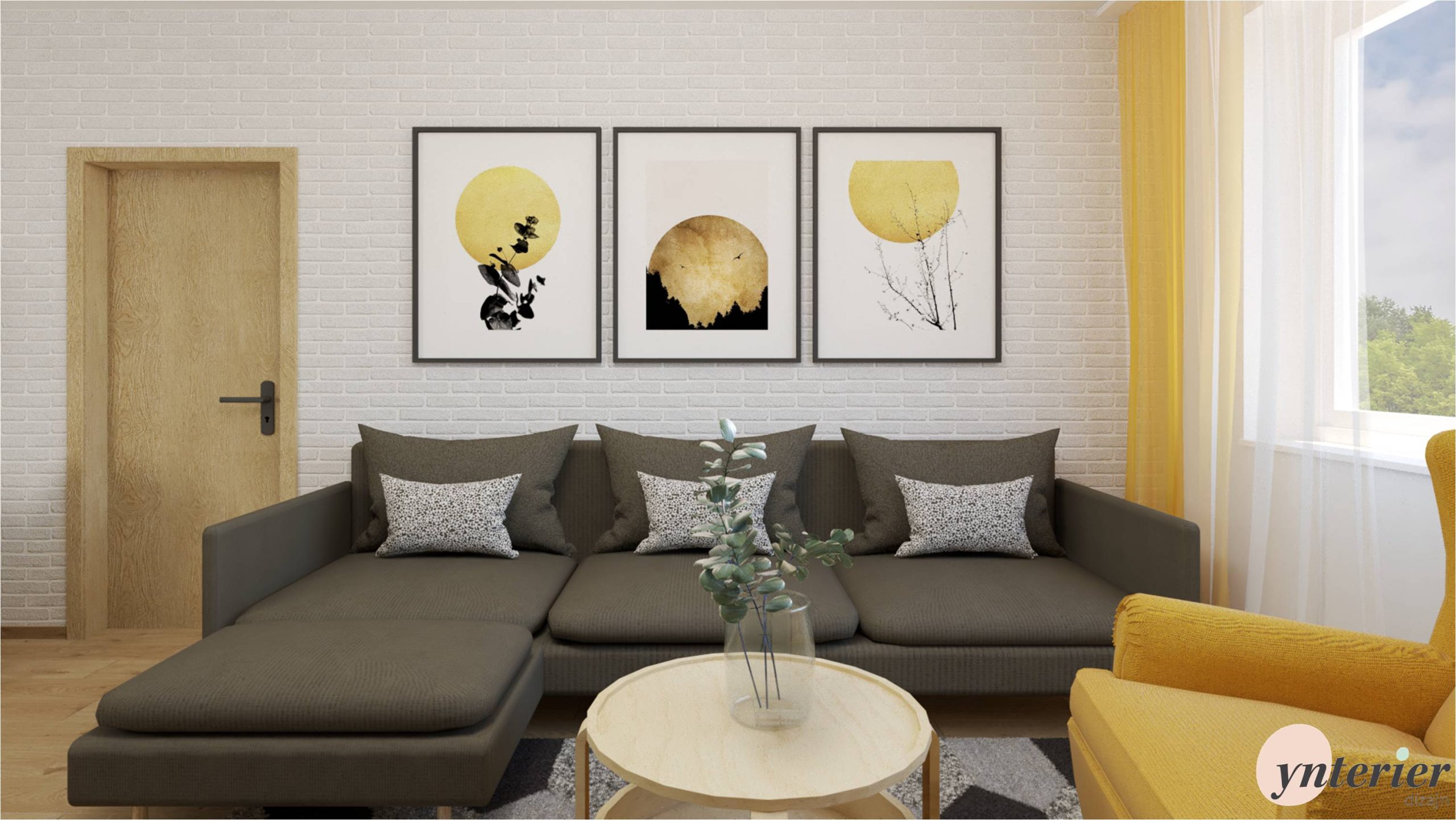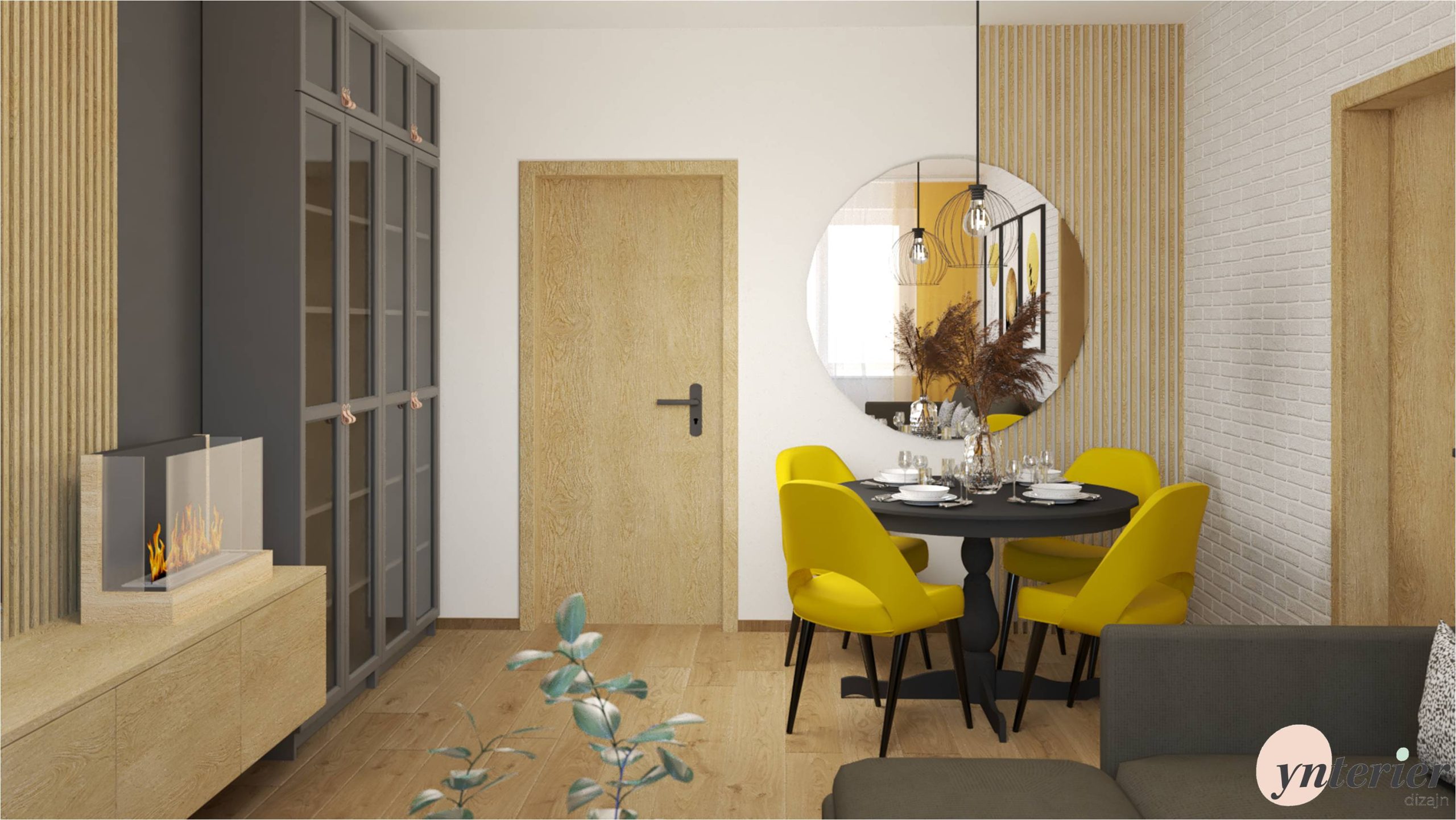 . Doplnili sme osvetlenie a výrazné žlté stoličky. Na stene je navrhnuté okrúhle zrkadlo s drevenými lamelami, ktoré odráža svetlo z protiľahlého okna.