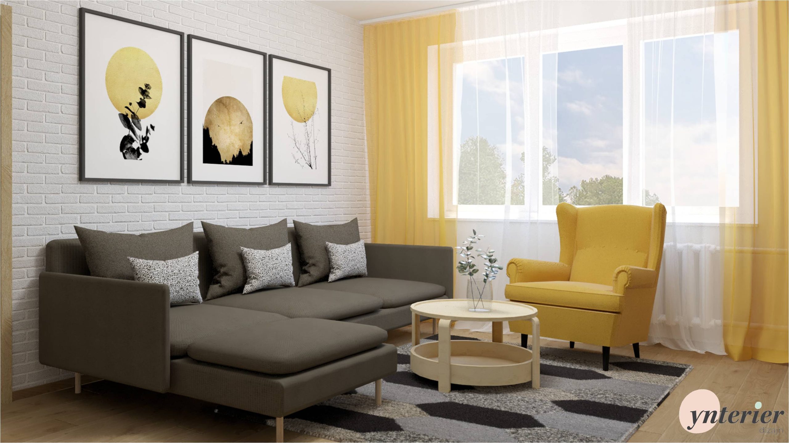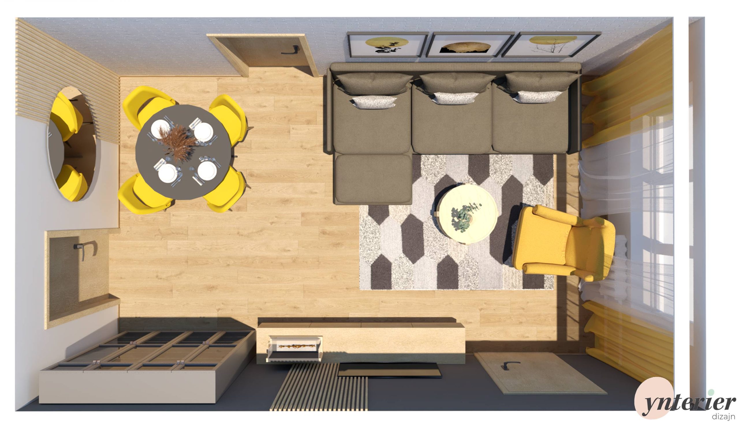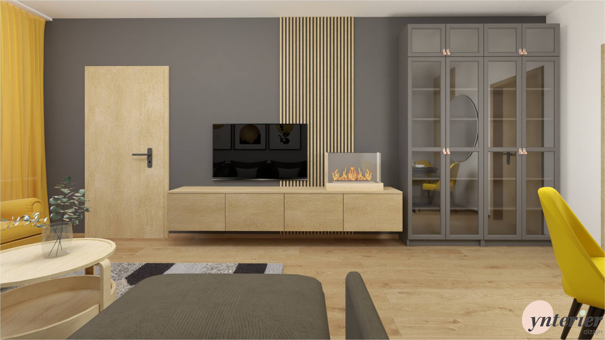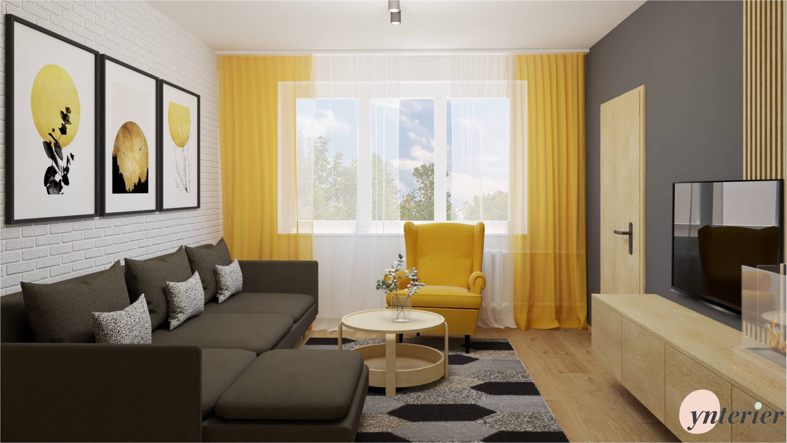 je tvorená dlhou tmavou stenou, ktorú sme rozdelili vertikálnymi prvkami. TV stenu dopĺňajú lamely. Pohodlný gauč v tvare L s výrazný žltým kreslom tvorí oddychovú zónu. Navrhli sme tiež úložné vitríny, ktoré funkčne nadväzujú na jedálenský kút.