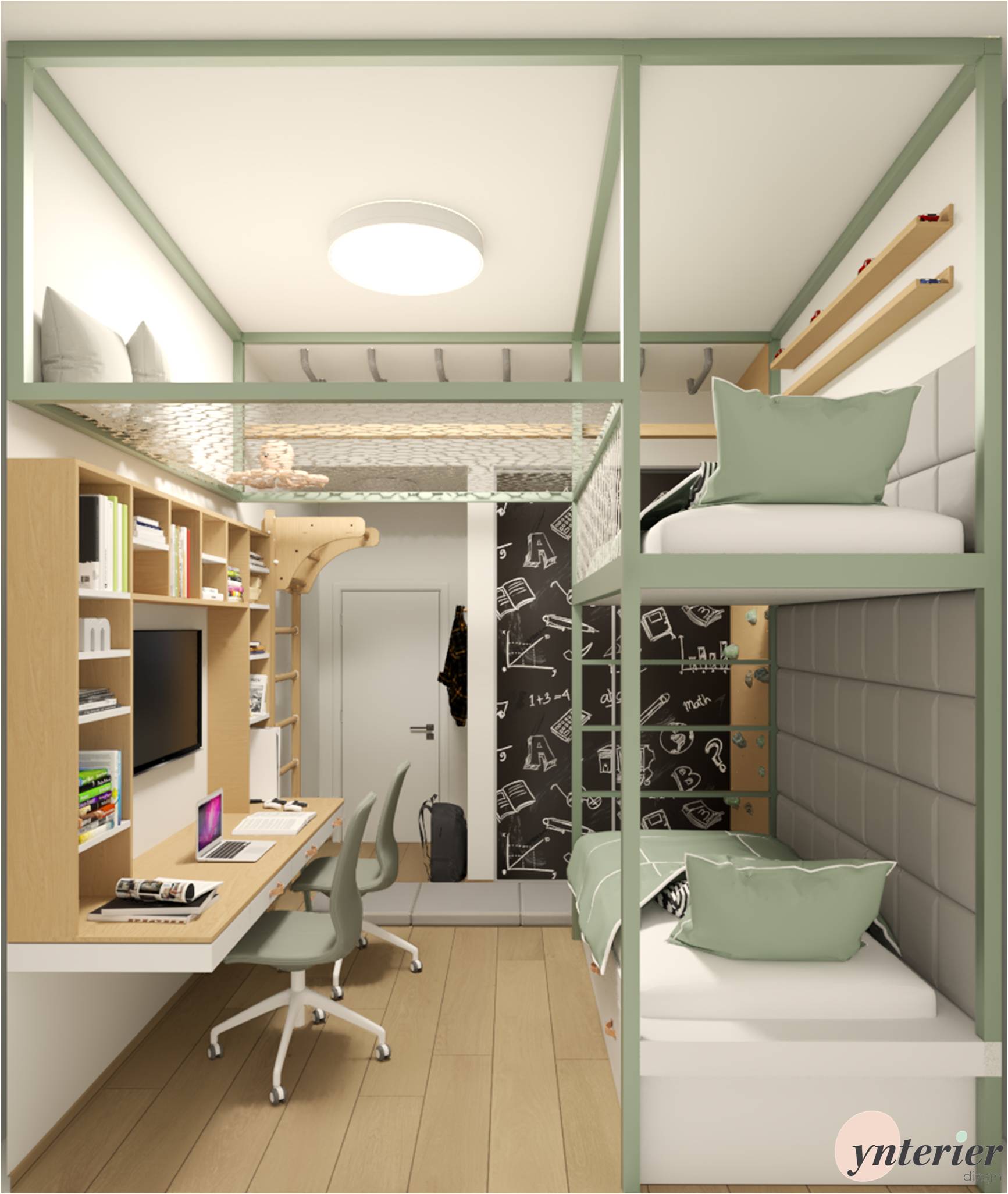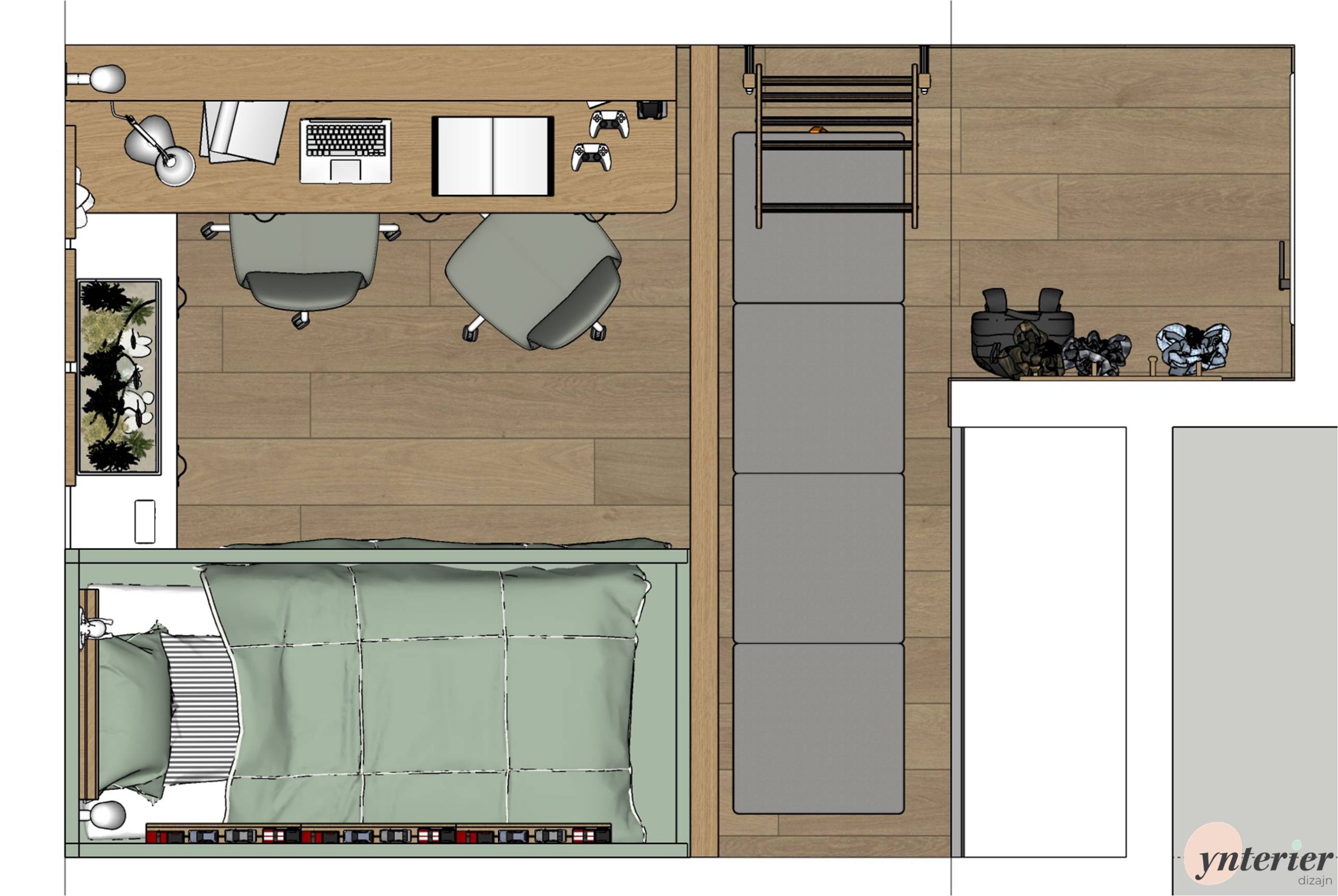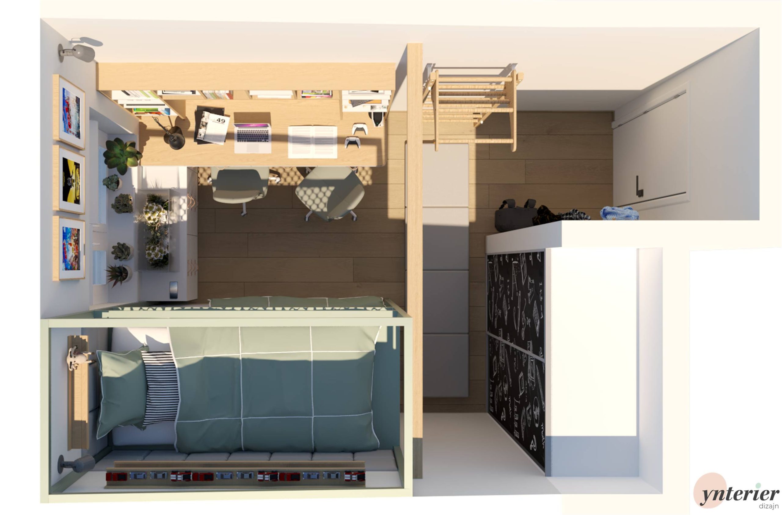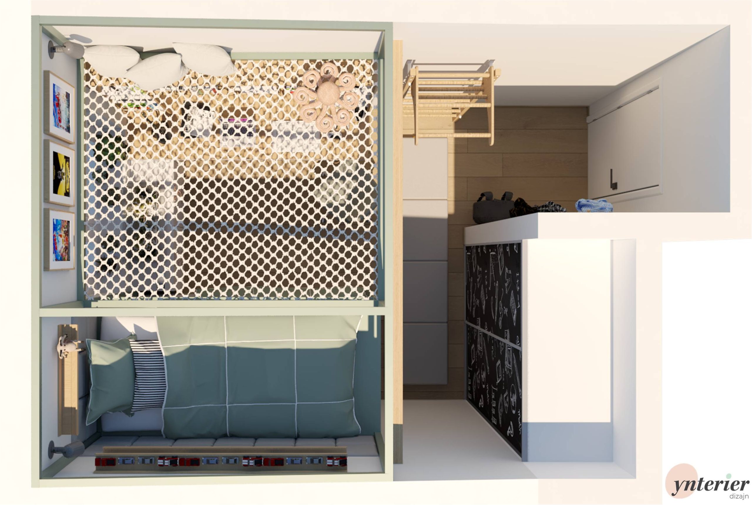 Pre každého chlapca sme chceli vytvoriť vlastný priestor, kde by mohli po športovom výkone oddychovať. Neodradila nás ani malá veľkosť izby, čo bolo využiteľných cca 9m2. Preto sme navrhli poschodovú posteľ, kde horná časť je rozšírená aj o sieť. Tá je tu špeciálne pre mladšieho z bratov, aby sa mal kde hrať ale aj sa len tak povaľovať. Pre staršieho je zas v spodnej časti telka, ktorú môže sledovať pohodlne opretý o čalúnené steny rovno z postele.