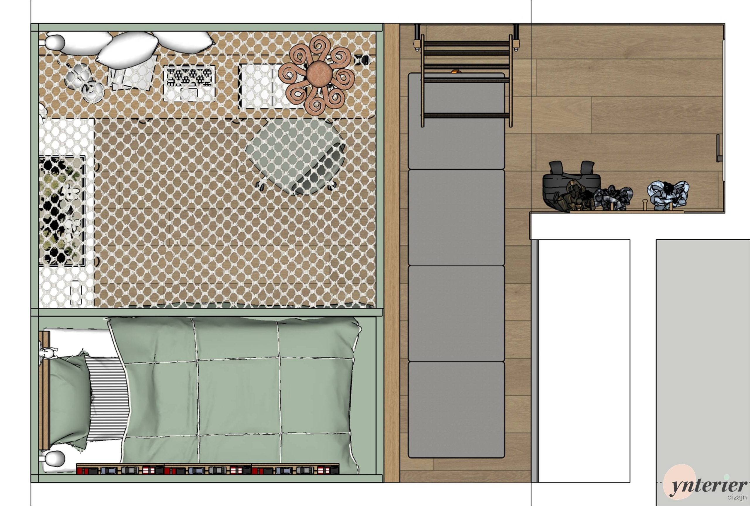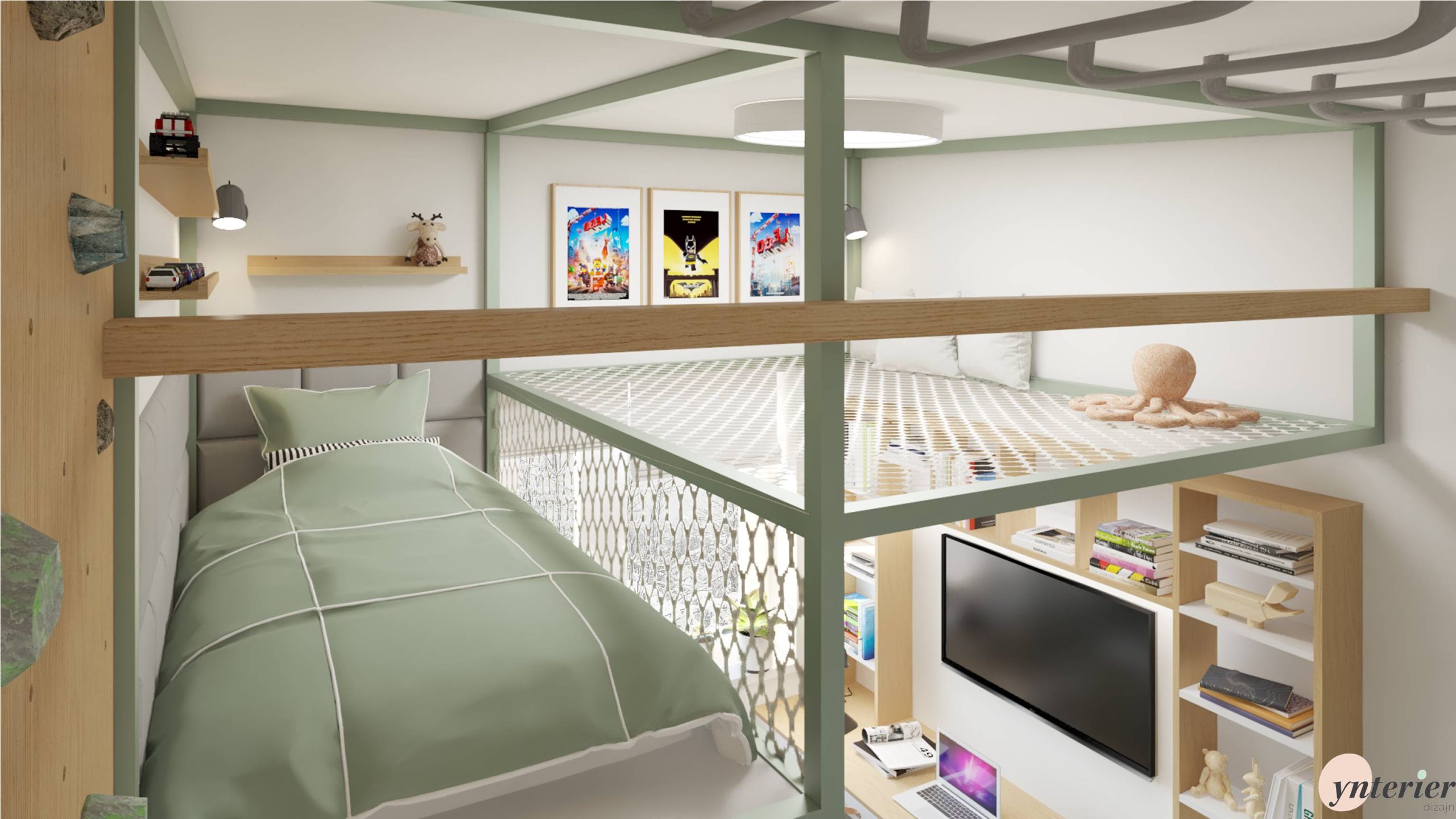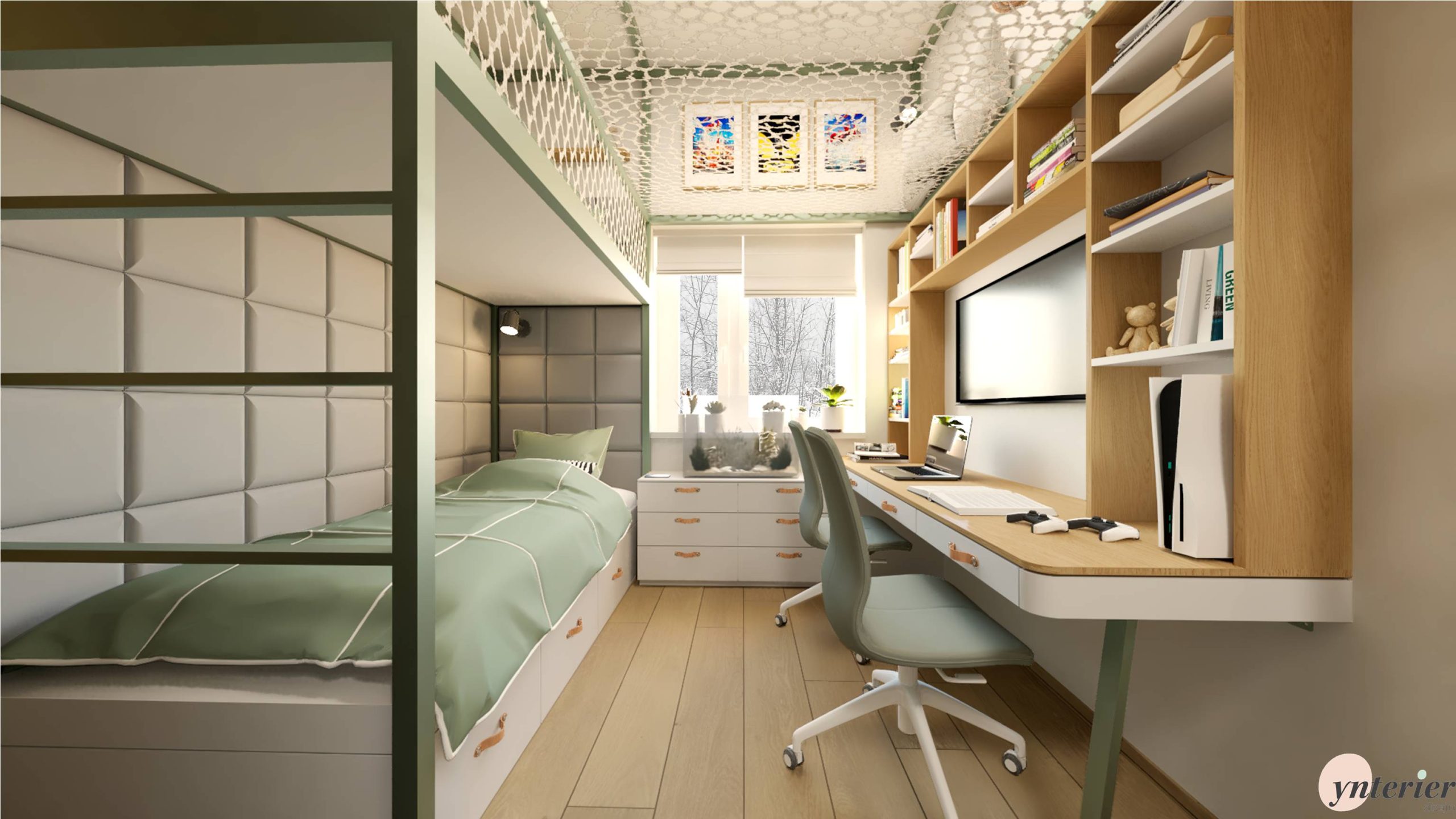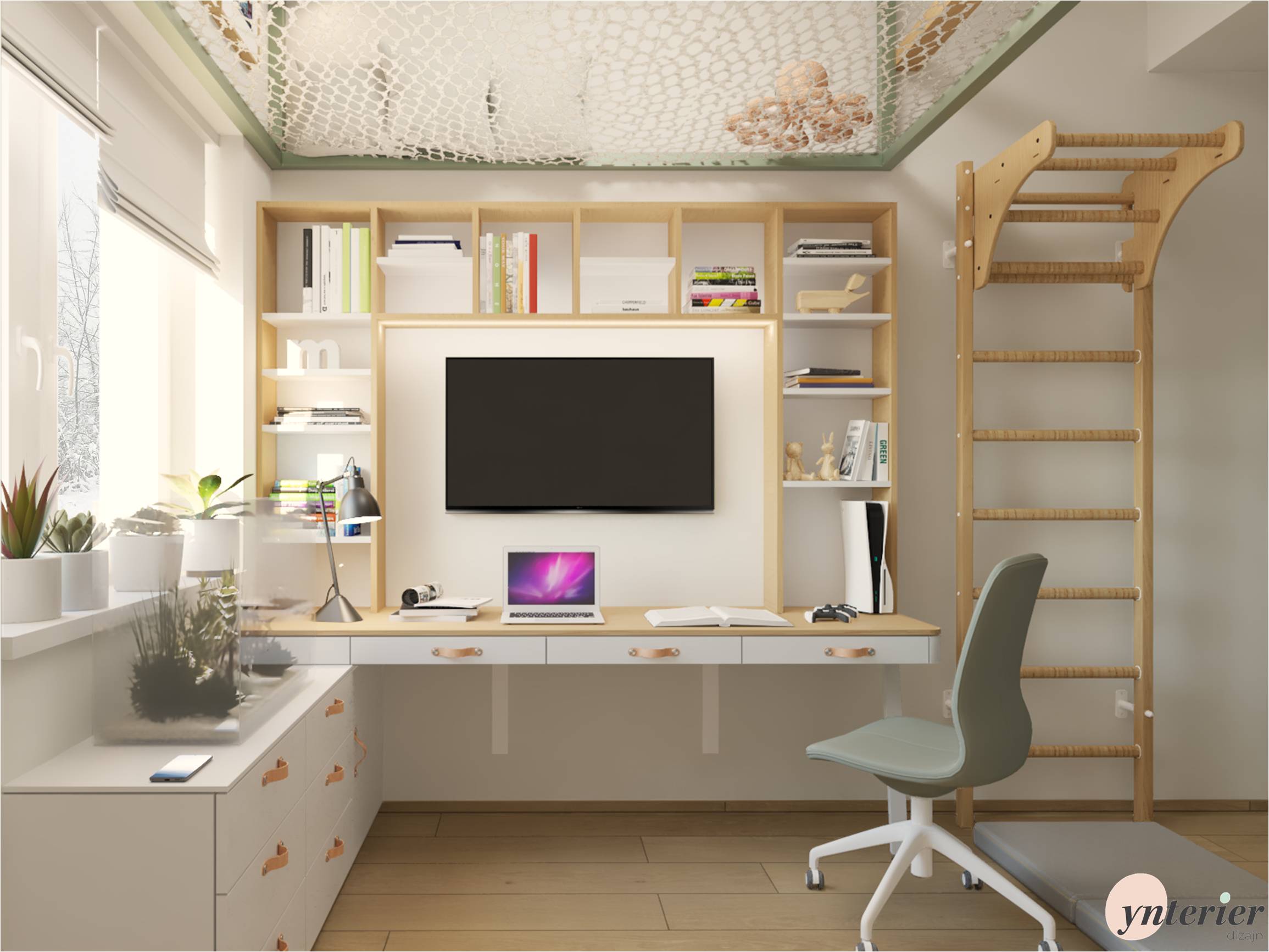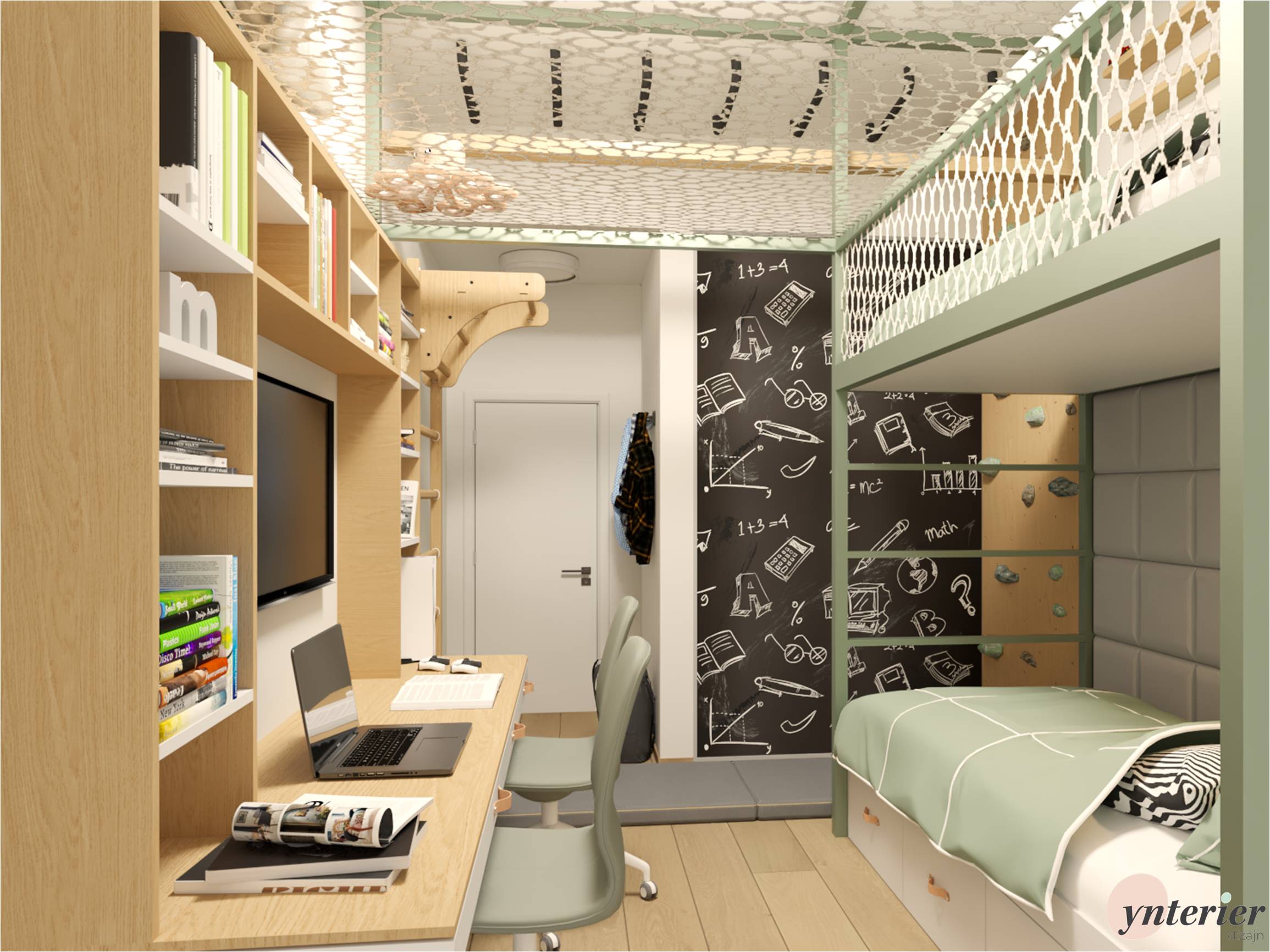 Pre každého chlapca sme chceli vytvoriť vlastný priestor, kde by mohli po športovom výkone oddychovať. Neodradila nás ani malá veľkosť izby, čo bolo využiteľných cca 9m2. Preto sme navrhli poschodovú posteľ, kde horná časť je rozšírená aj o sieť. Tá je tu špeciálne pre mladšieho z bratov, aby sa mal kde hrať ale aj sa len tak povaľovať. Pre staršieho je zas v spodnej časti telka, ktorú môže sledovať pohodlne opretý o čalúnené steny rovno z postele.