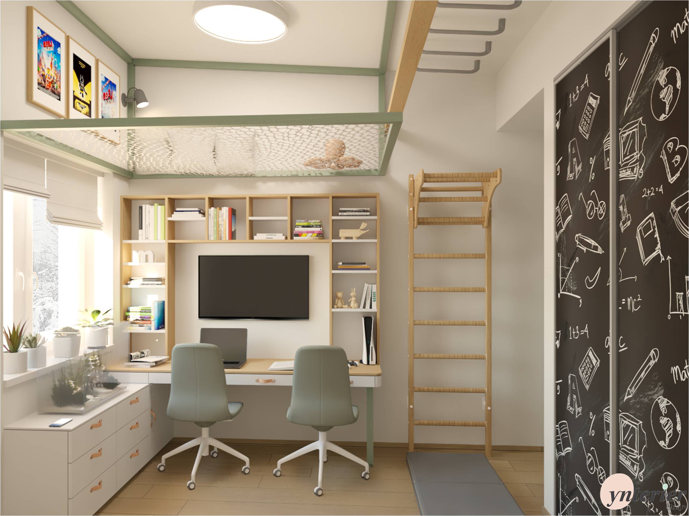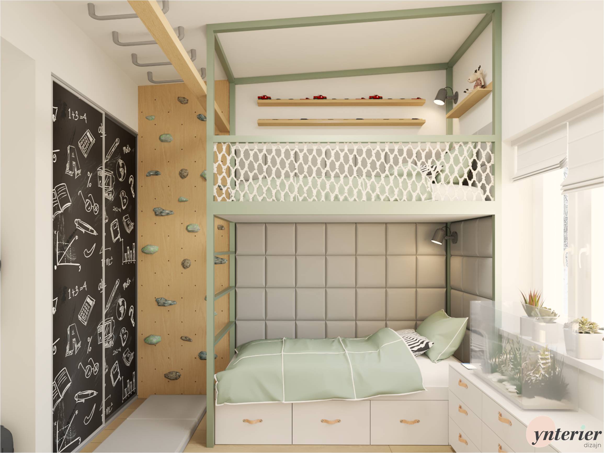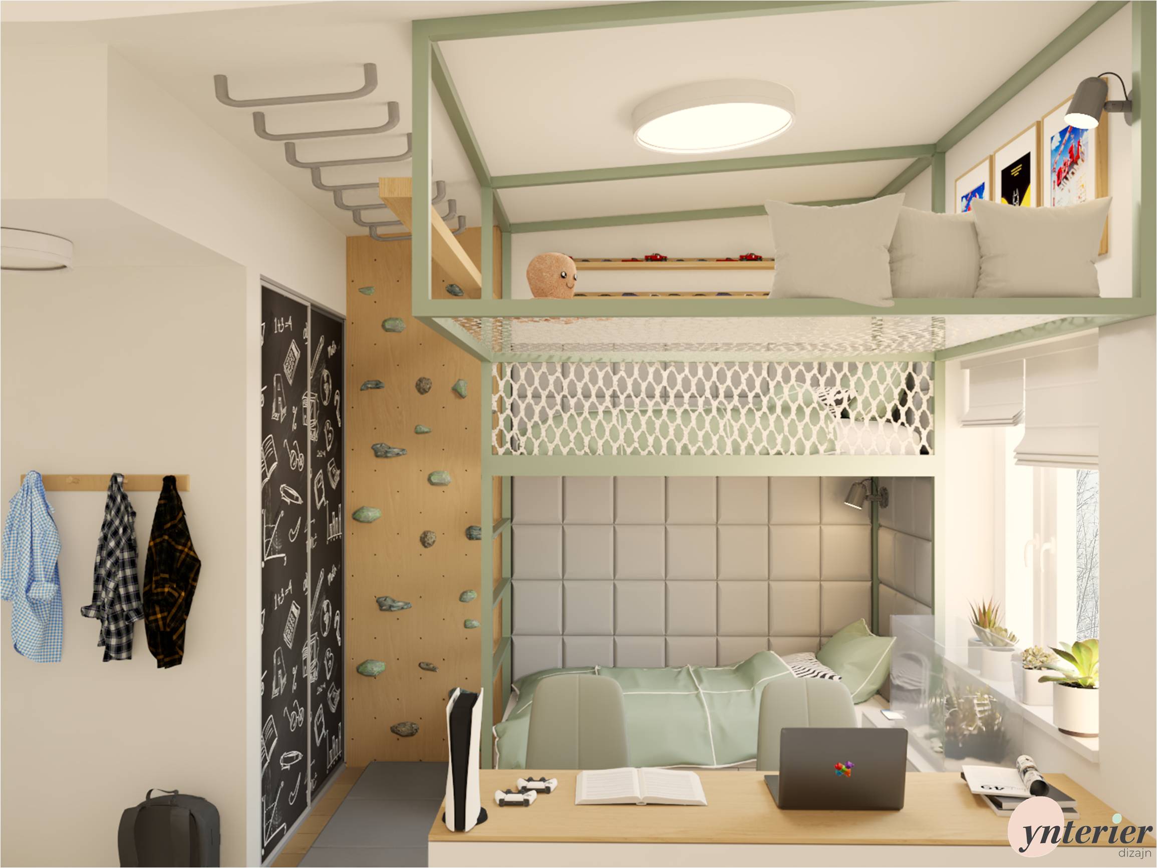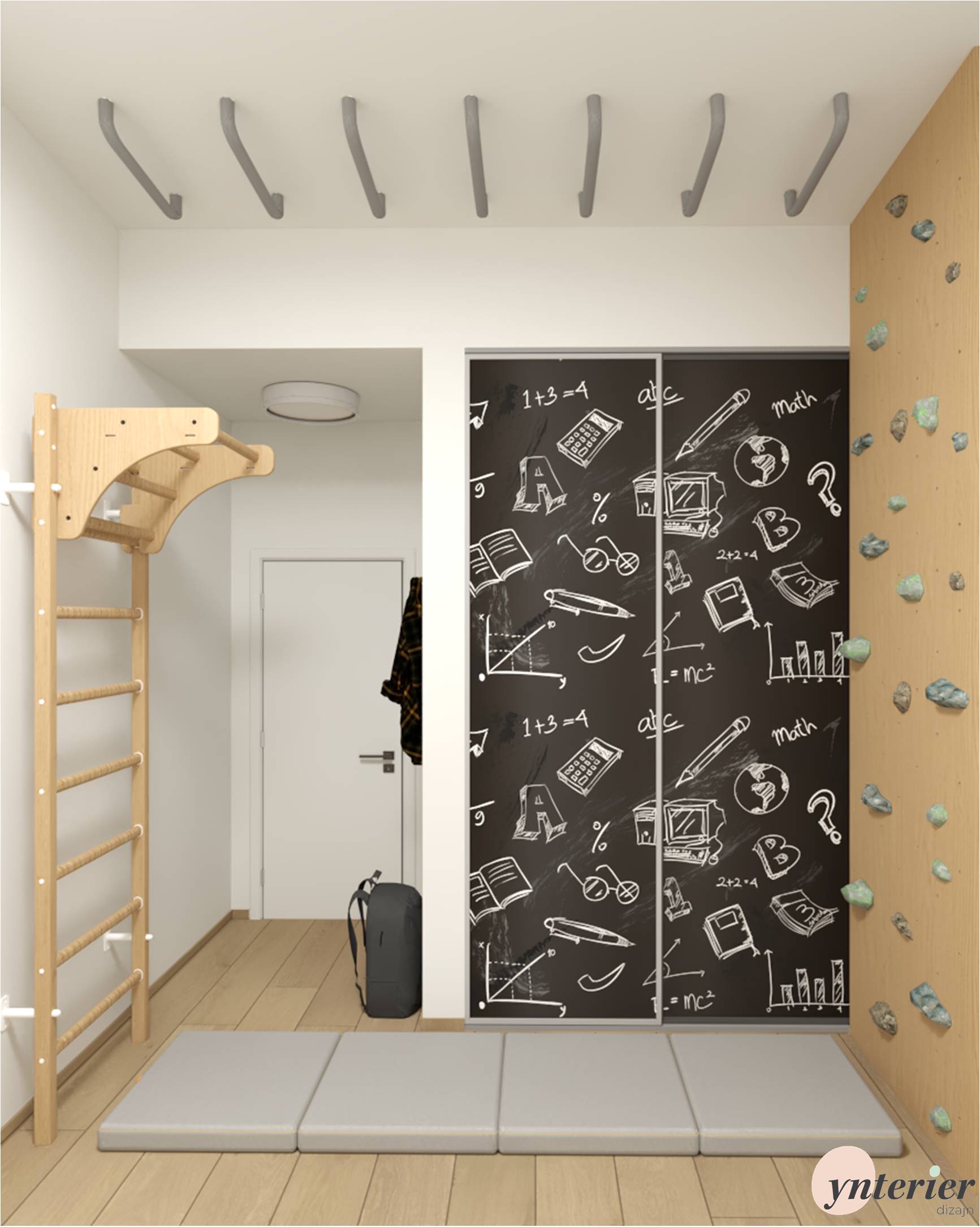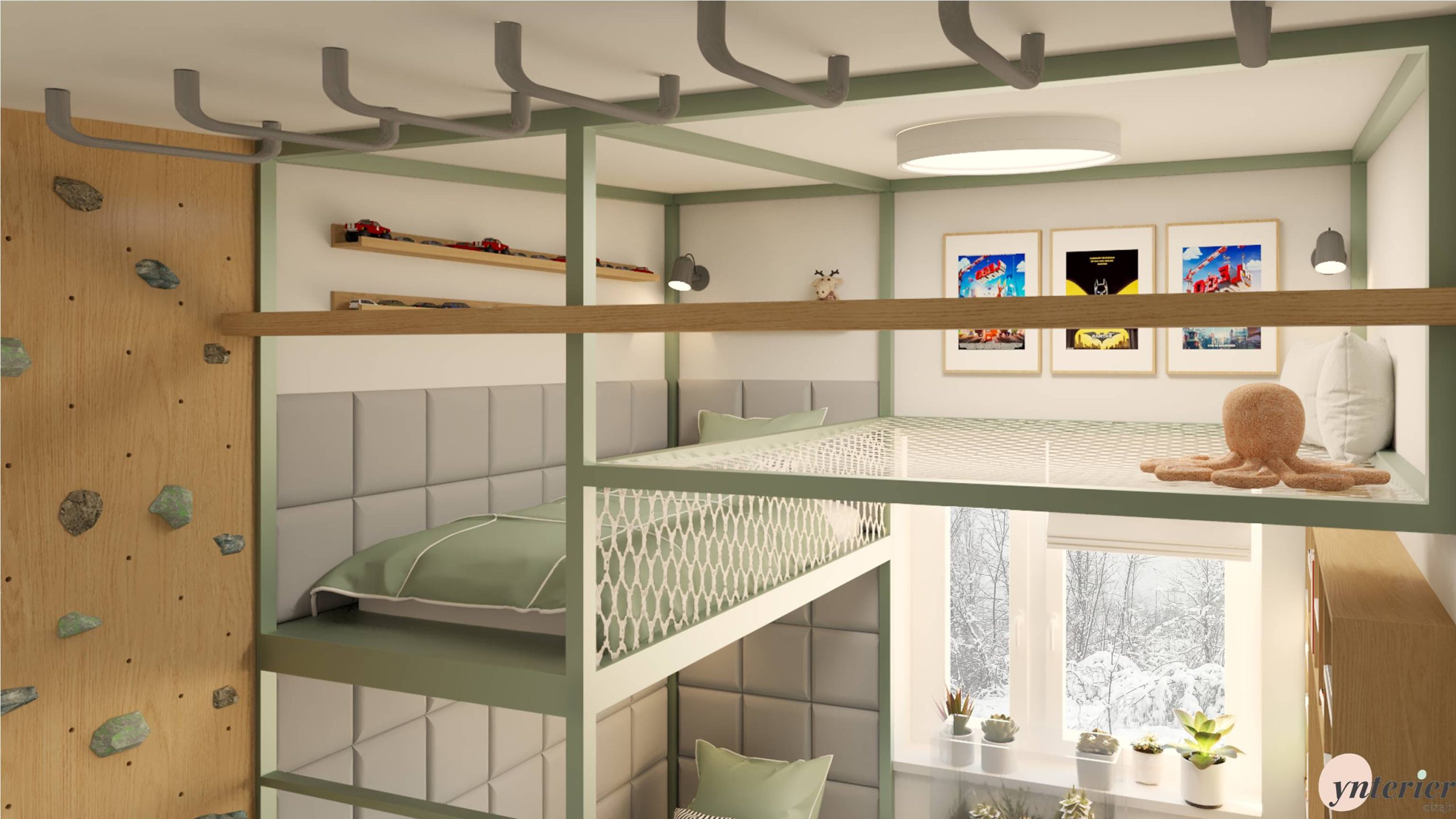 Táto detská izba je navrhnutá pre dvoch bratov, ktorý sa venujú parkouru. Využili sme preto vysoké stropy a navrhli čo najviac prekážkových dráh, na ktorých by mohli doma trénovať.