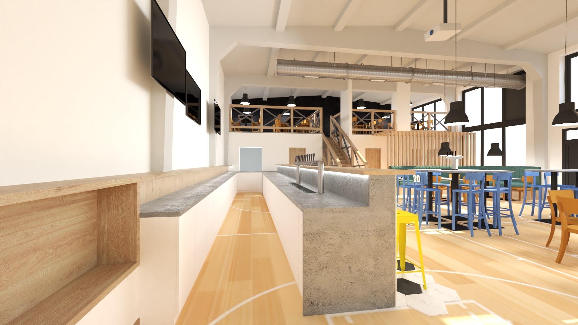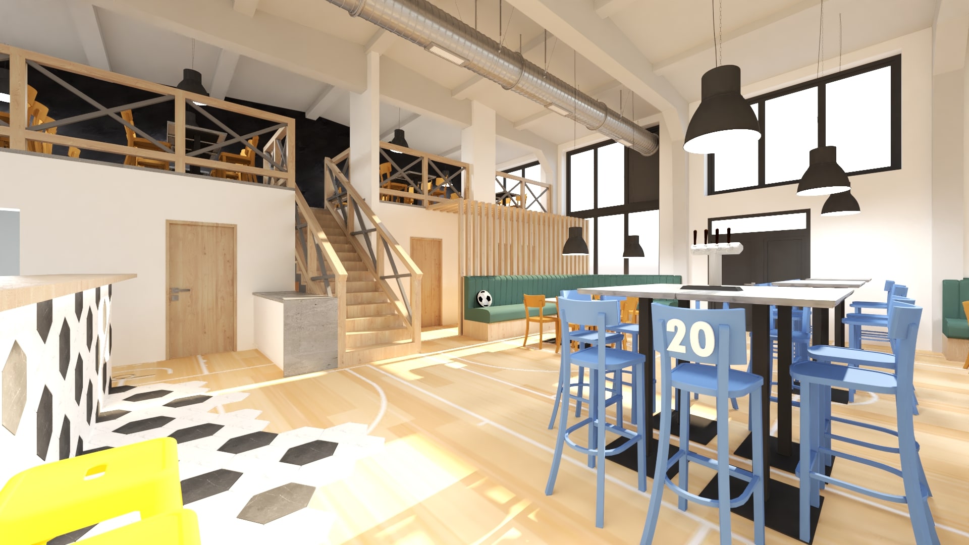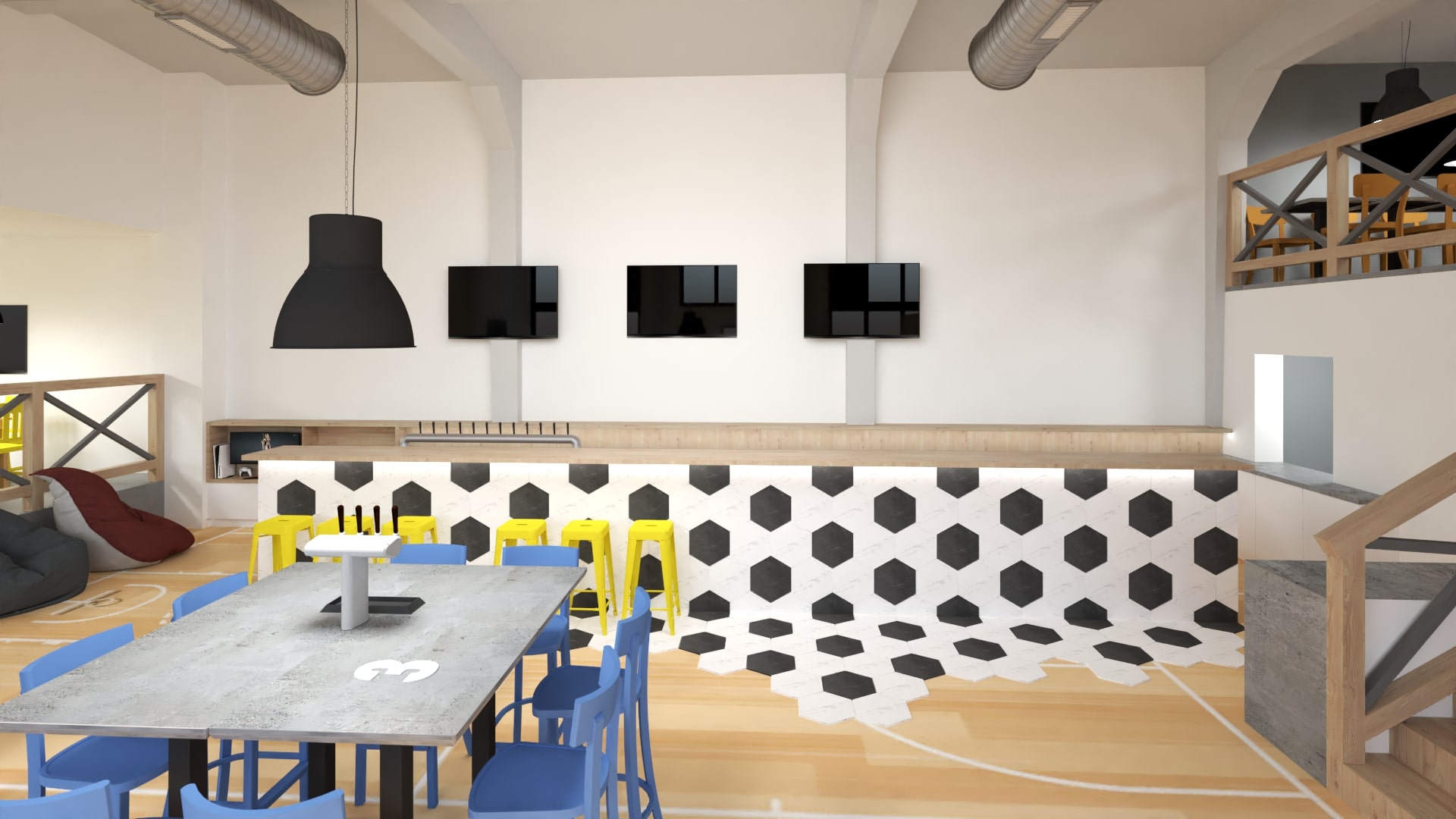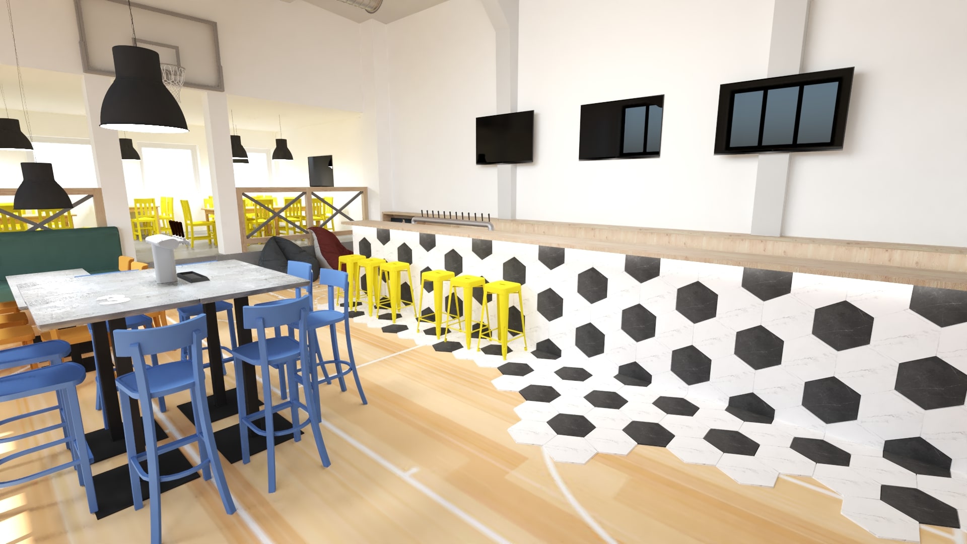 Architektonicky zaujímavý priestor pivárne potreboval nový dizajn. Témou sa stal šport a sledovanie športových prenosov. Bar je inšpirovaný vzorom futbalovej lopty, ktorý postupne prechádza do podlahy podobnej basketbalovej palubovke š čiarami. Stoličky sú farebné a majú na sebe čísla ako hráči na ihrisku.