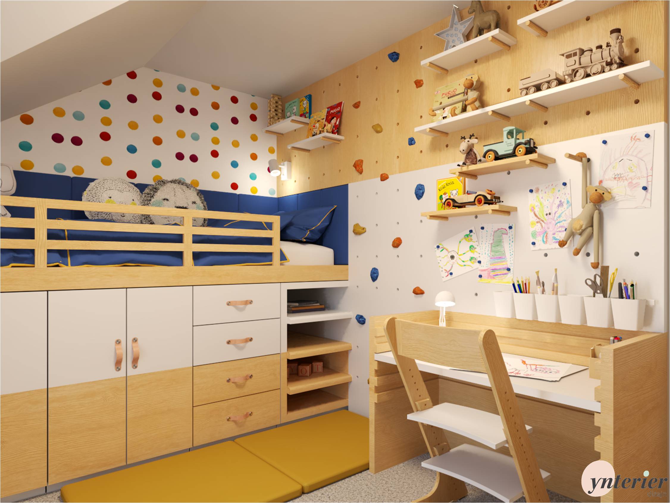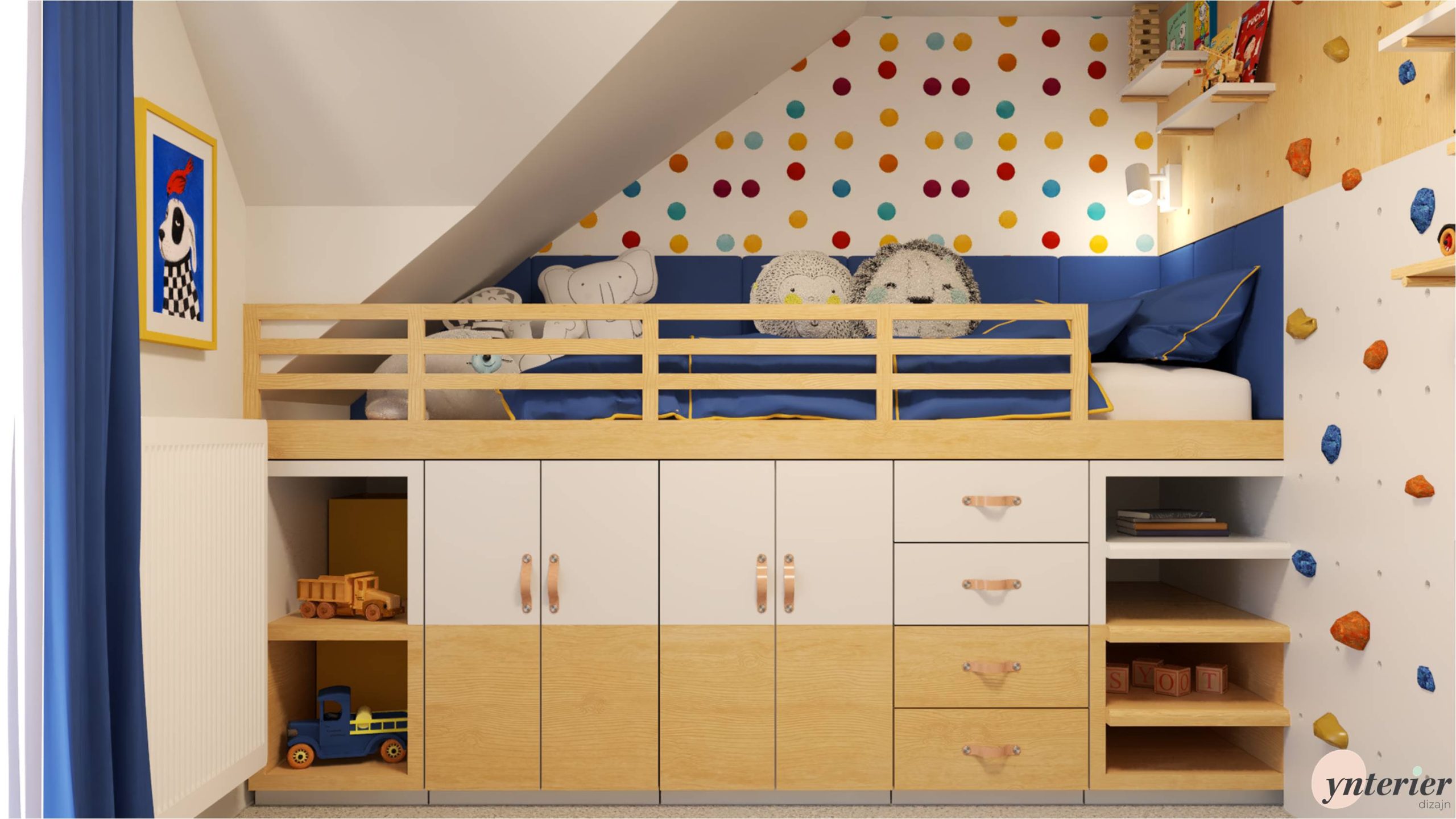 V detskej izbe sa snúbi svet fantázie, hier a dobrodružstiev s potrebou praktického riešenia priestoru. Pri návrhu podkrovnej detskej izby sme v Ynterier čelili výzve – maximálne využiť daný priestor, vytvoriť úložné riešenia, no zároveň zachovať dostatok miesta na hranie. Výsledkom je izba, ktorá spĺňa potreby detí i rodičov, a pritom vyzerá štýlovo a hravo.