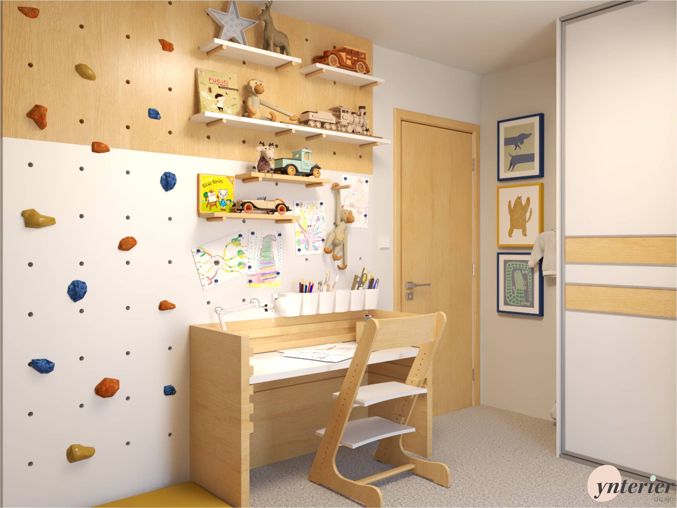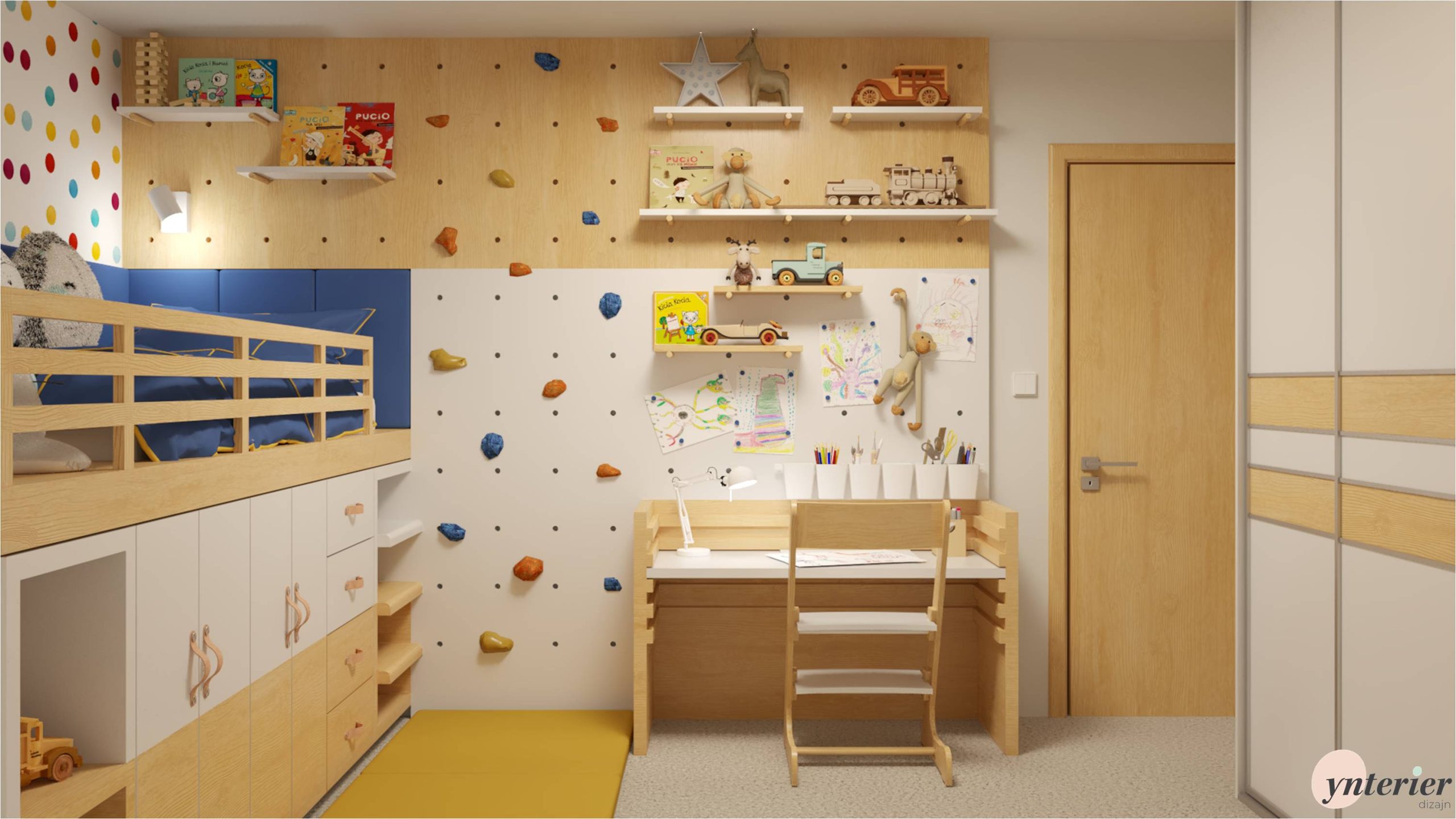 Aby sme podporili detskú energiu a pohyb, zakomponovali sme obloženú stenu s lezeckými chytmi . Táto stena je nielen výzvou pre malé horolezce, ale zároveň slúži ako funkčný prvok izby. Doplnili sme ju o poličky na vystavenie hračiek , knižiek či umeleckých diel, ktoré si deti s radosťou tvoria.