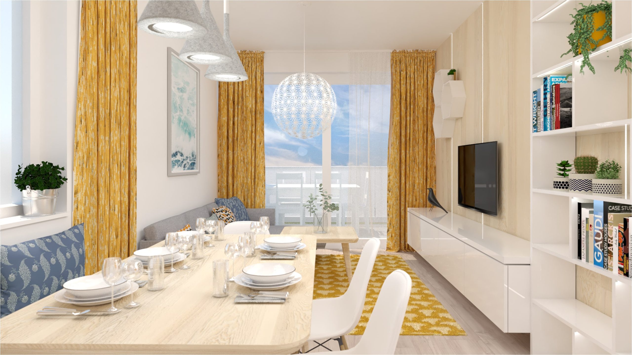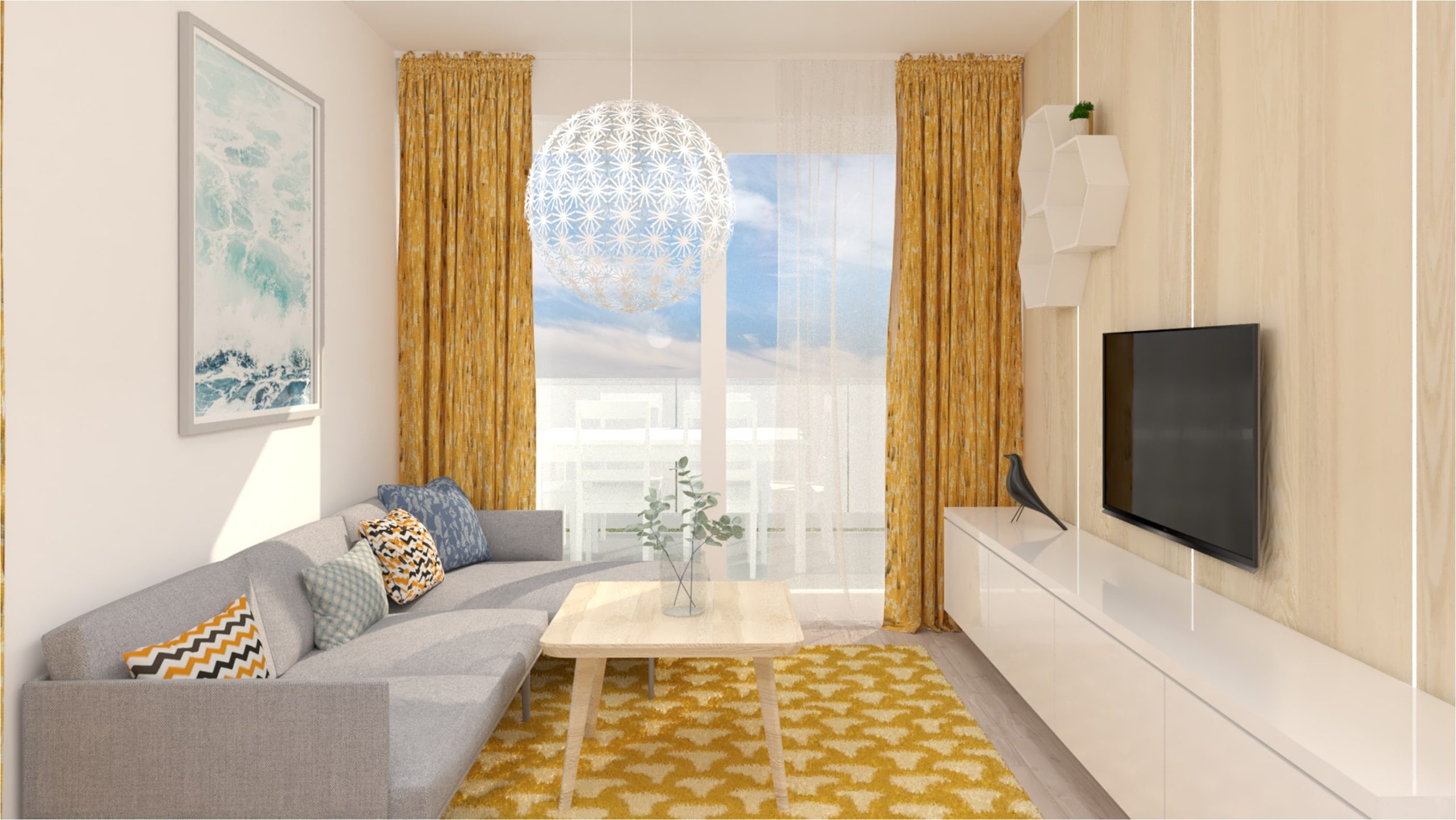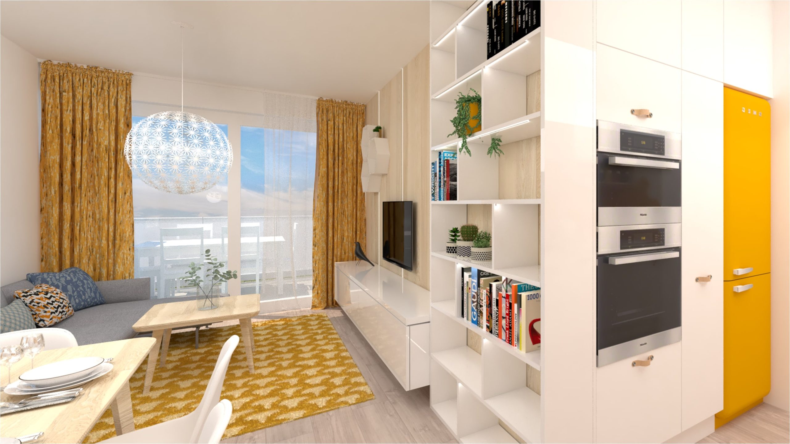 Návrh dennej časti 3 izbového bytu sa nesie vo svetlých farbách a dominantnou žltou v doplnkoch. Nábytok je navrhnutý v neutrálnej farebnosti. Kladie sa tu dôraz na úložné priestory, ale aj na vzdušnosť priestoru.