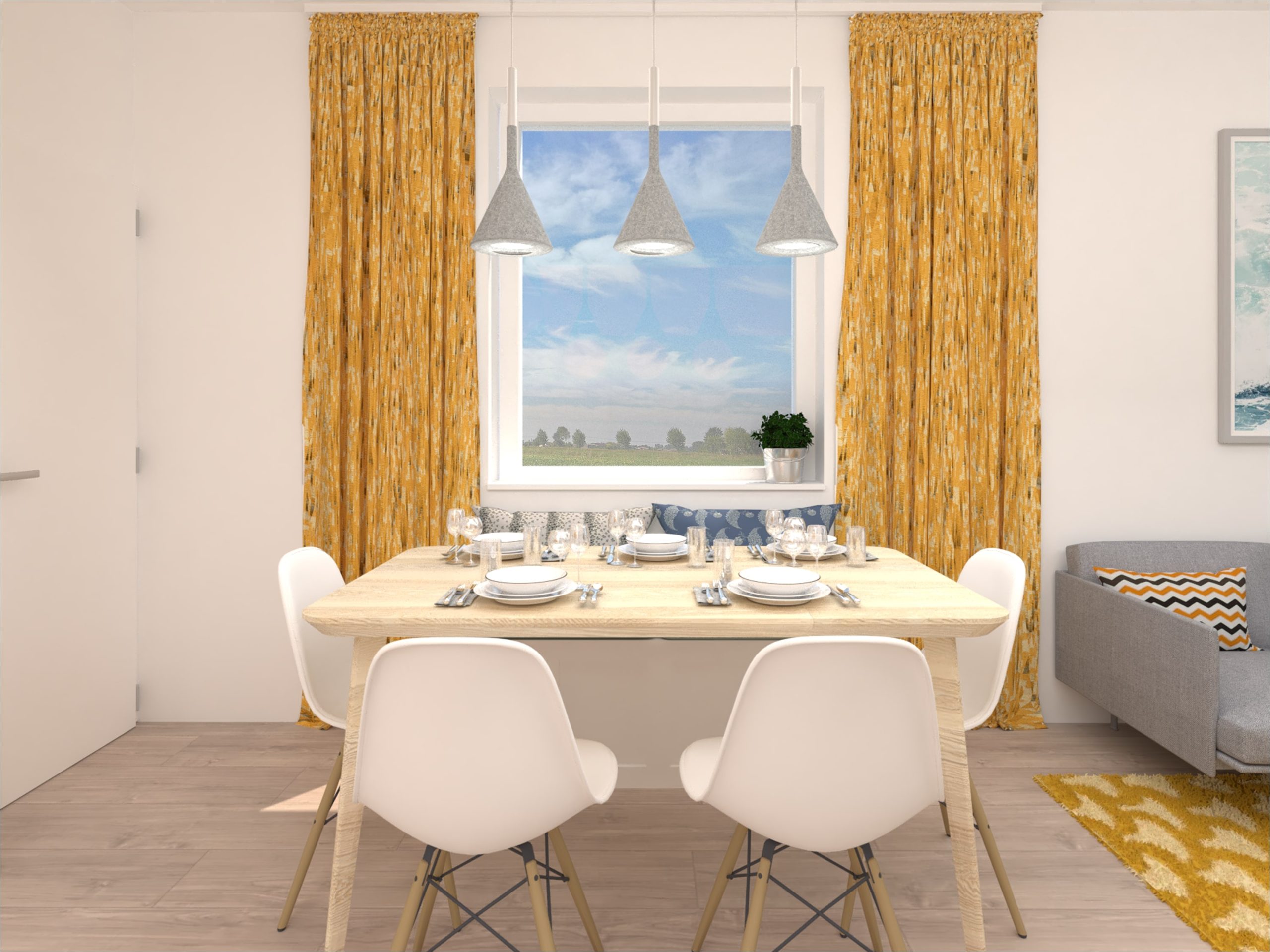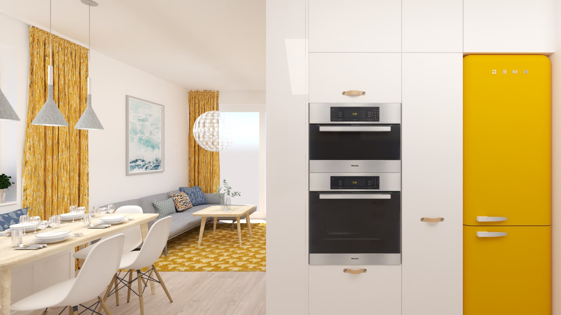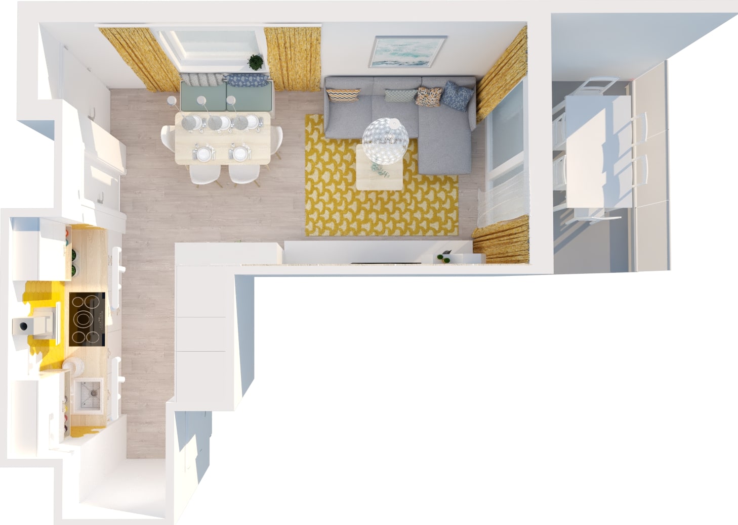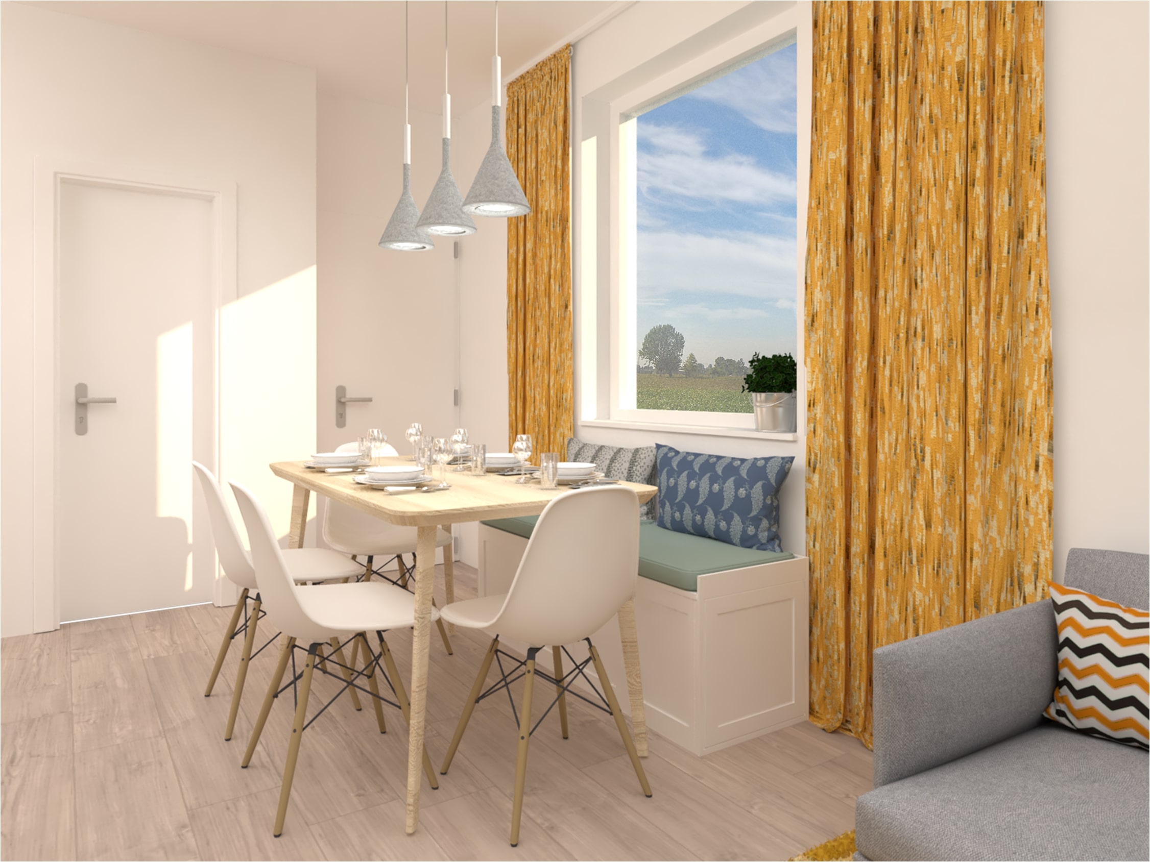 Návrh dennej časti 3 izbového bytu sa nesie vo svetlých farbách a dominantnou žltou v doplnkoch. Nábytok je navrhnutý v neutrálnej farebnosti. Kladie sa tu dôraz na úložné priestory, ale aj na vzdušnosť priestoru.