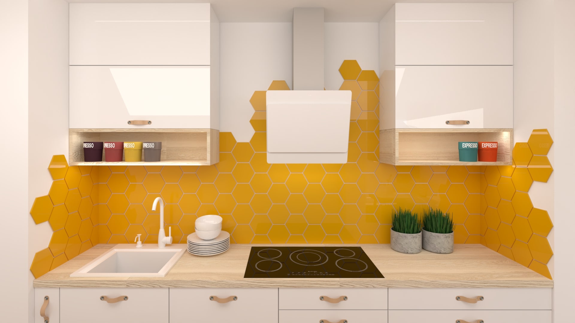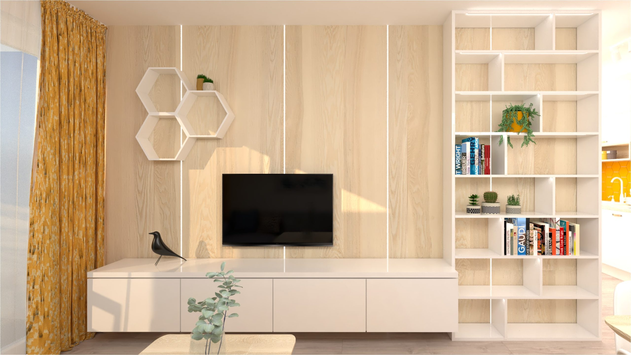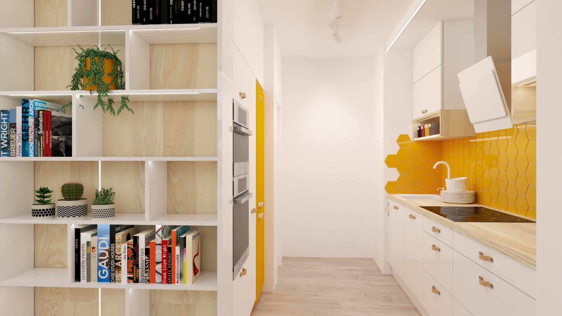 Kuchyňa je v dvoch blokoch. Blok vysokých skriniek obsahuje potravinovú skriňu, rúru a na želanie majiteľa voľne stojacu chladničku. Na druhej strane je kuchynská linka vsadená do výklenku. Dominantné sú žlté šesťuholníkové obkladačky, ktoré sú umiestnené nepravidelne. V jedálenskej časti je navrhnutá praktická lavica s úložným priestorom. V návrhu je zaujímavé prepojenie nábytkovej zostavy smerom z kuchyne do obývačky. V obývačke tak vznikla veľká knižnica s množstvom úložného priestoru nielen na knihy. Stena je obložená drevenými panelmi s LED osvetlením, ktoré priestor zútulňujú.
