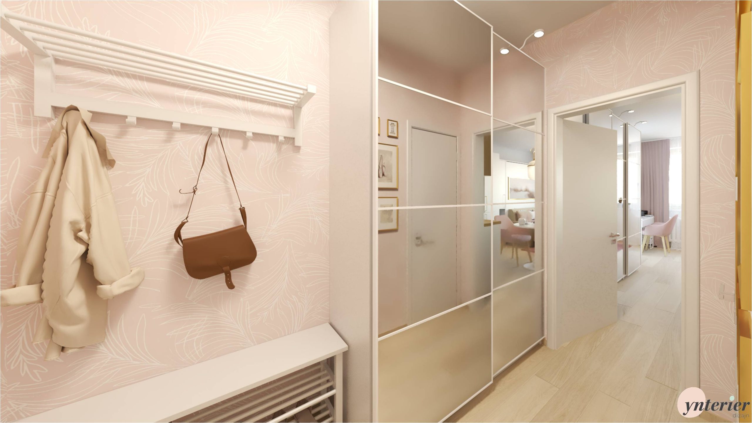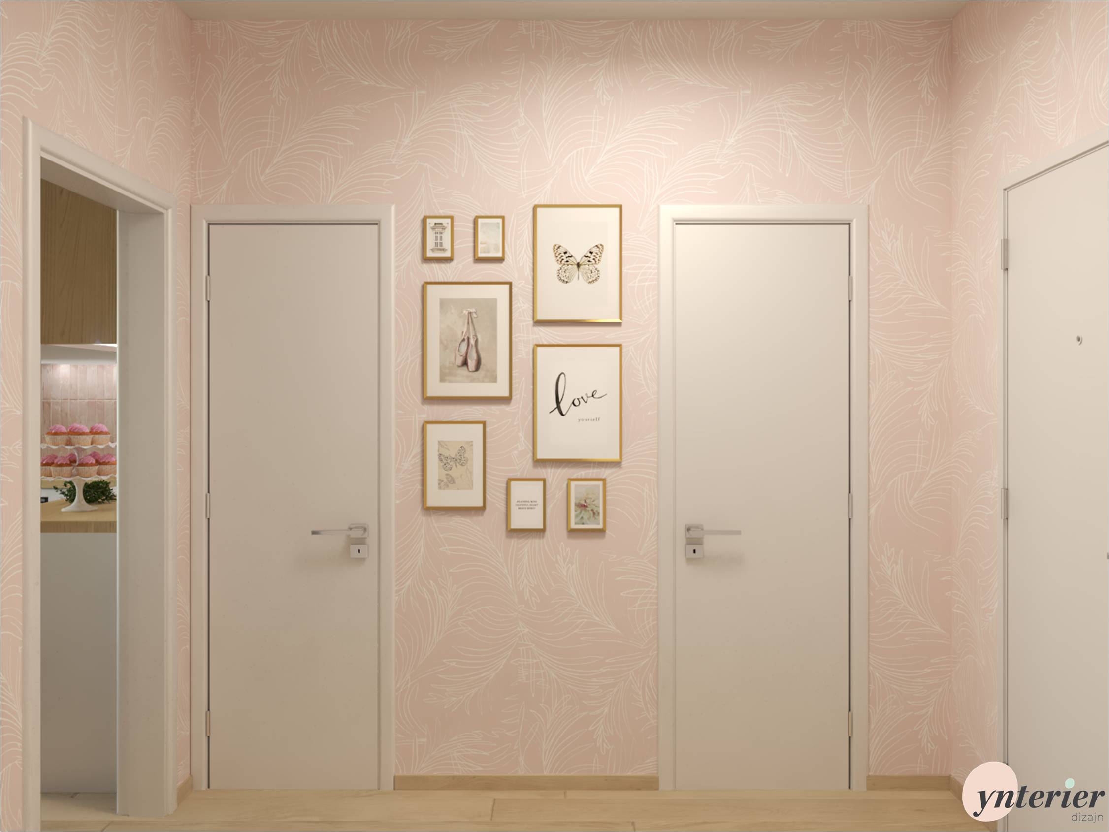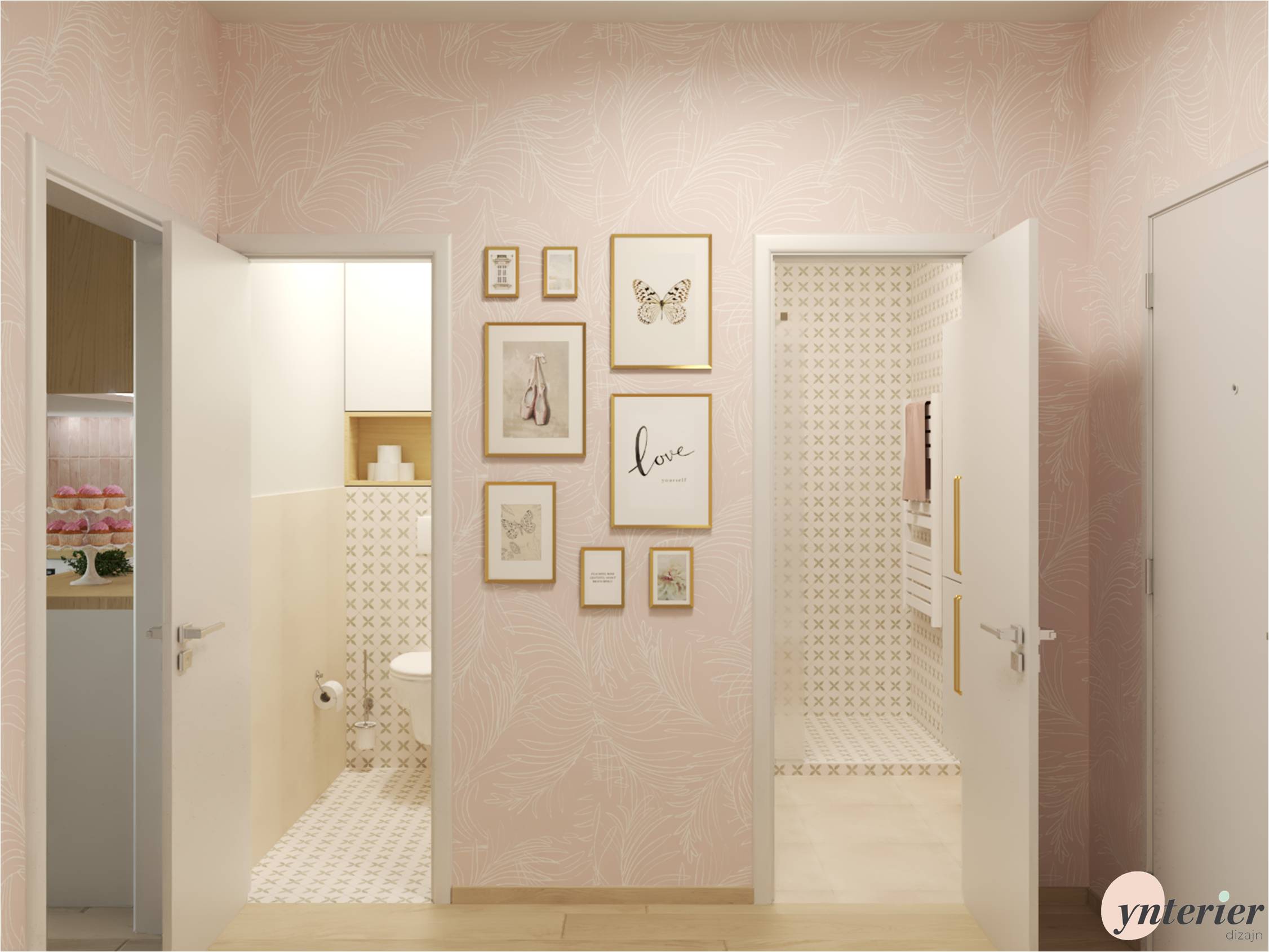 Dominantou je tu ružová tapeta s jemným organickým vzorom. Použili sme ju na všetky steny a tak môže vyniknúť biely nábytok, zlaté doplnky a biele dvere. Tie vedú do novonavrhnutej kúpeľne a samostatnej toalety. Ich návrh si môžete pozrieť tu 👉 Kúpeľňa v garsónke 👈
