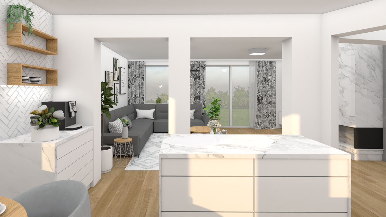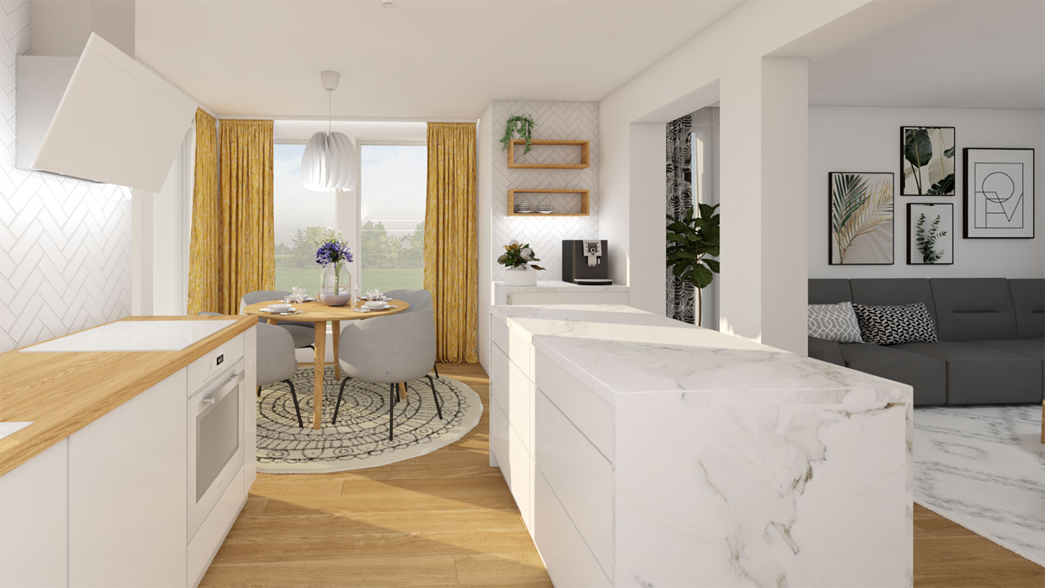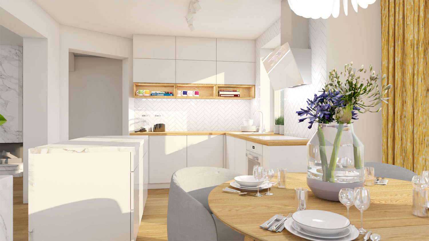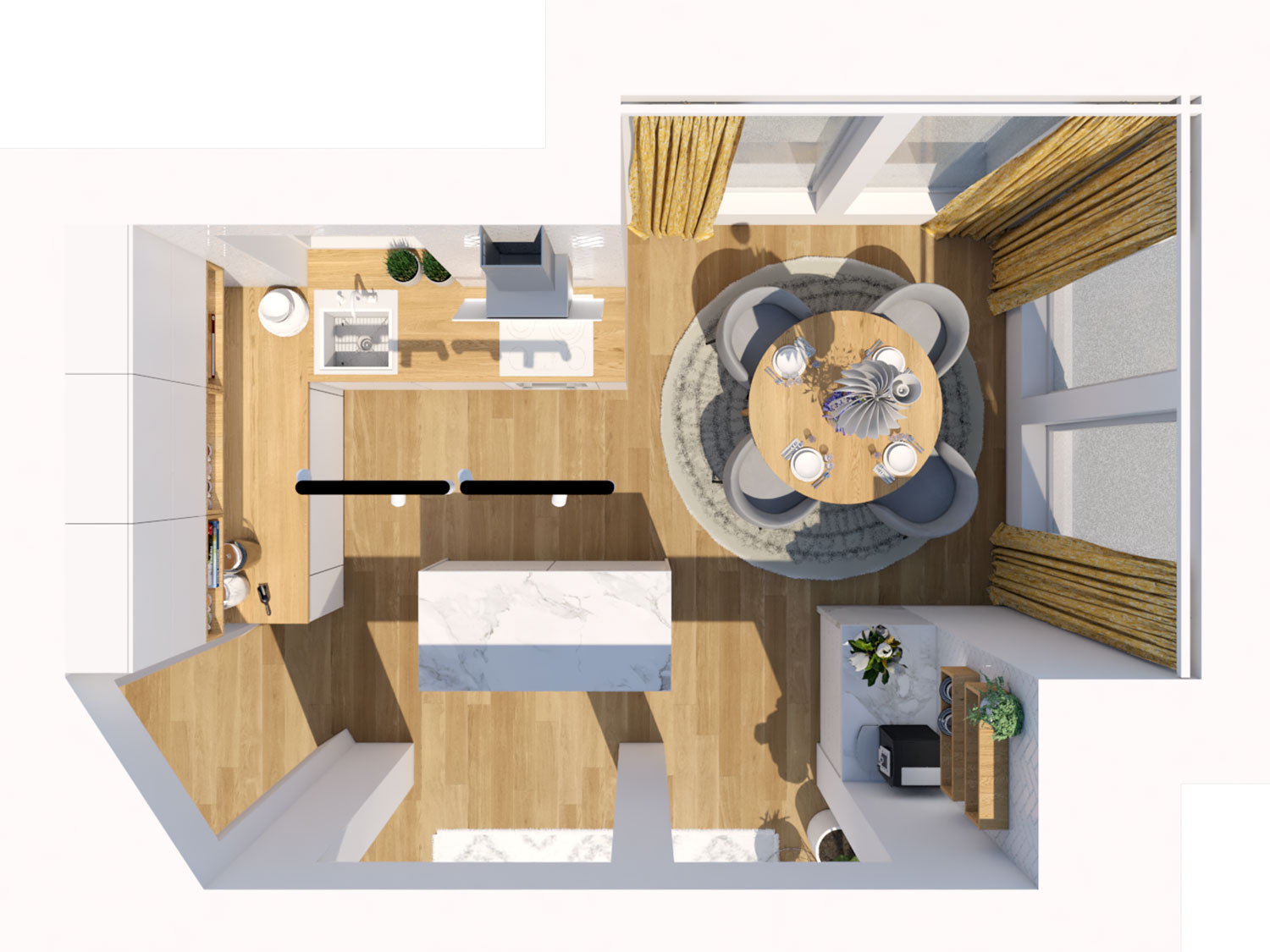 Pre rekonštrukcií kuchyne bol želaním majiteľky kuchynský ostrovček a získanie viac pracovného miesta. Pri návrhu bol však limitujúci špecifický priestor vymedzený stĺpmi. Ostrov je preto navrhnutý tak, aby sa dalo okolo neho pohodlne chodiť a ulička medzi ním a kuchynskou linkou bola optimálnych 120 cm. Nevzniknú tak problémy pri súčasnom otváraní skriniek na oboch stranách, alebo ak sa bude v kuchyni pohybovať viac ľudí naraz. Celá miestnosť je ladená do svetlých farieb, aby pôsobila priestranne a vzdušne. Pomohla tomu tiež absencia vysokých skríň, pretože chladnička aj potraviny sú uložené v špajzy. Úložný priestor sme ale vytvorili hornými skrinkami navrhnutými až po strop. Na pravej strane sme tiež vytvorili kávový kútik.