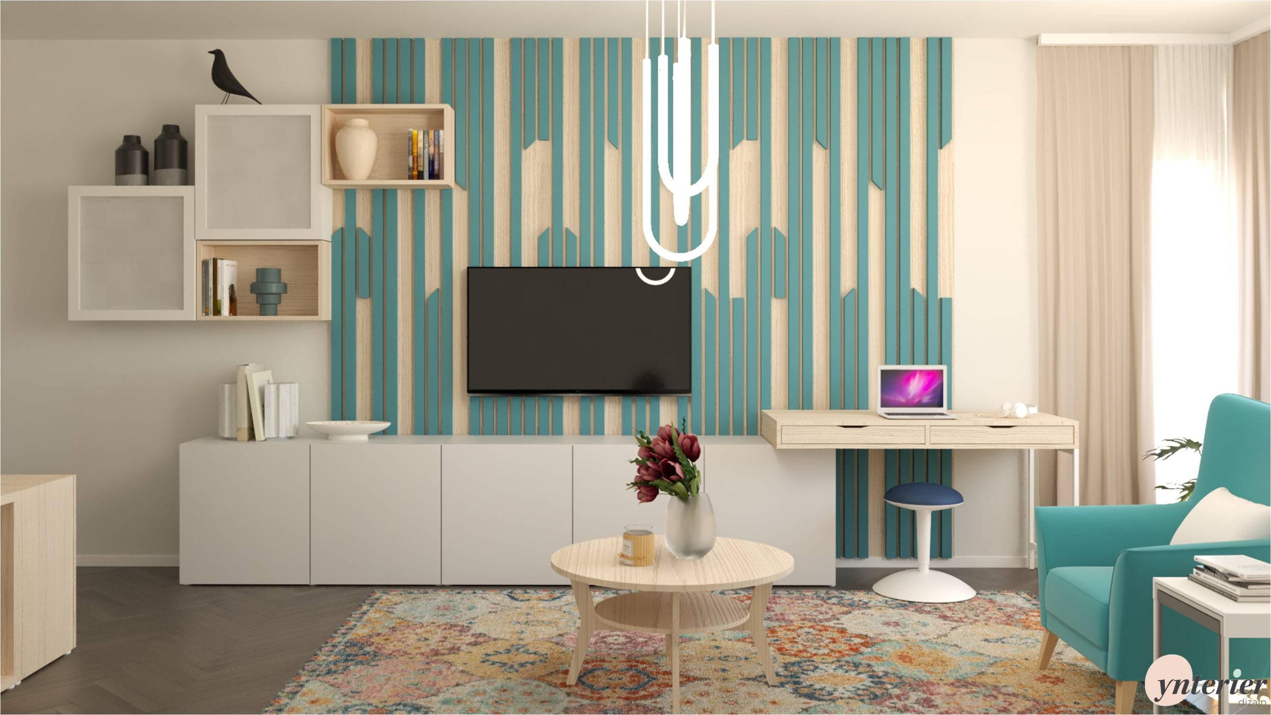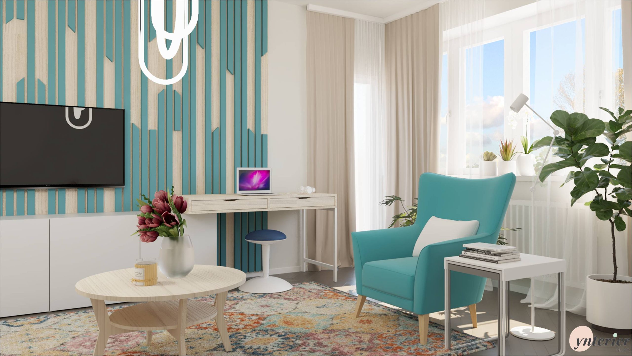 • Stena za televízorom: Vytvorili sme originálny 3D dizajn s vertikálnymi panelmi v tyrkysovej a drevenej farbe, ktorý dodáva priestoru dynamiku a vizuálnu hĺbku.