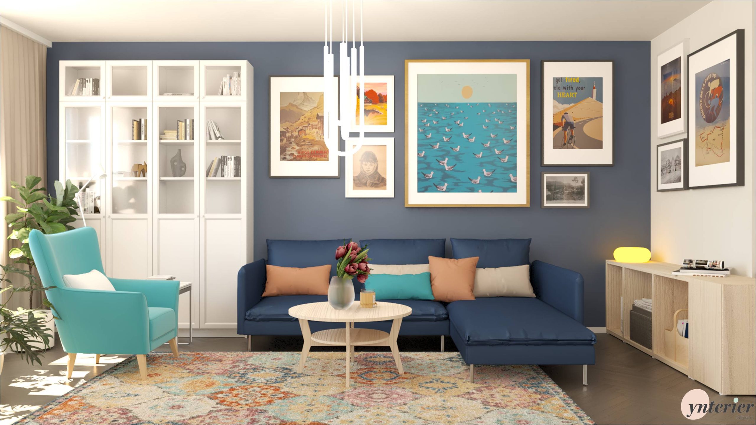 • Dekorácie: Galéria obrazov na tmavomodrej stene nad pohovkou dodáva priestoru osobitosť a šmrnc.