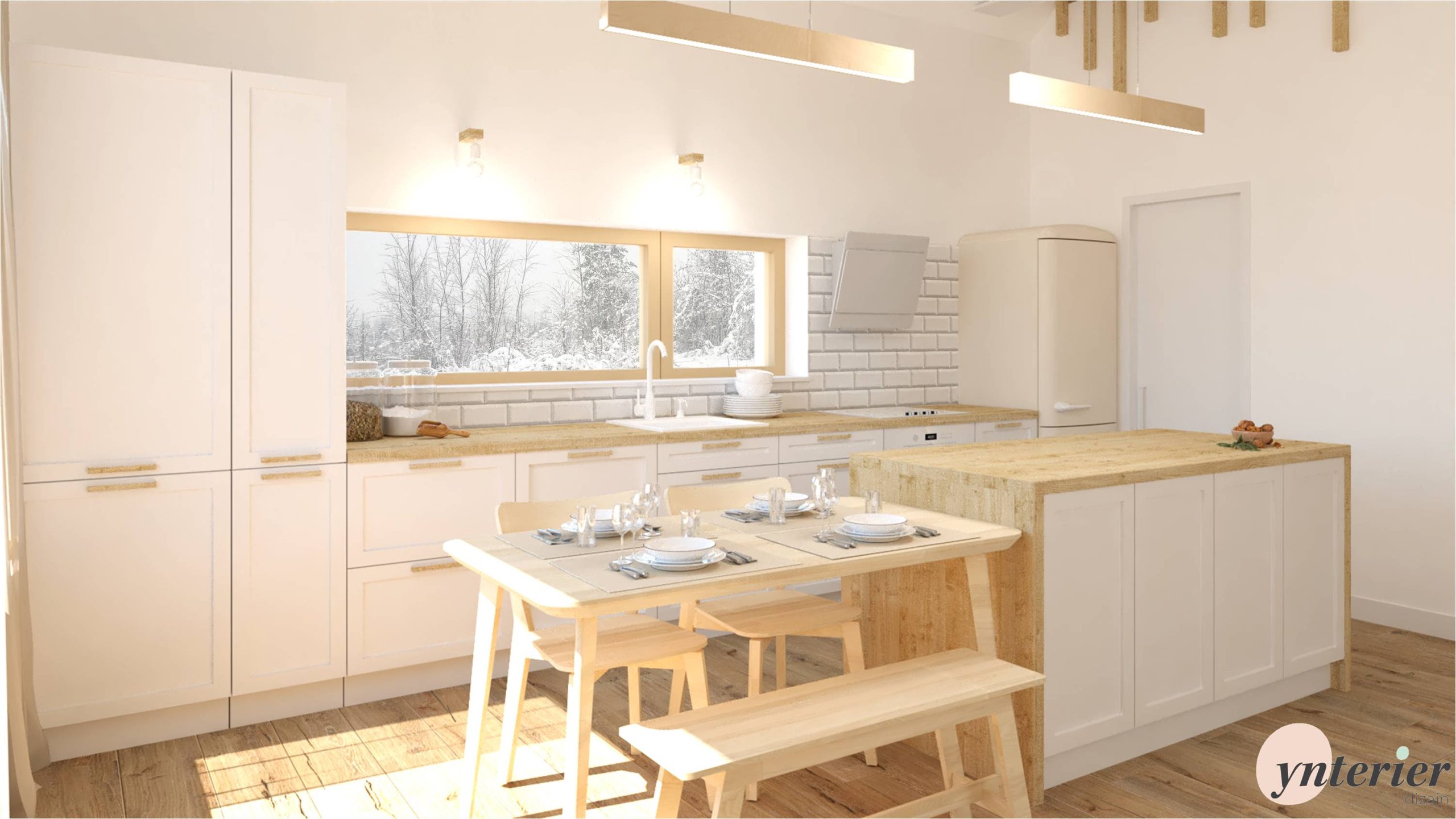 je lineárna a plynule nadväzuje na jedálenské sedenie. Tvorí ju ostrovček s veľkou pracovnou plochou a zostava situovaná pri stene. Farebnosť je neutrálna biela s drevenou pracovnou doskou.