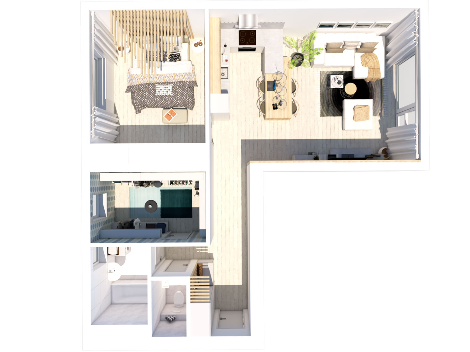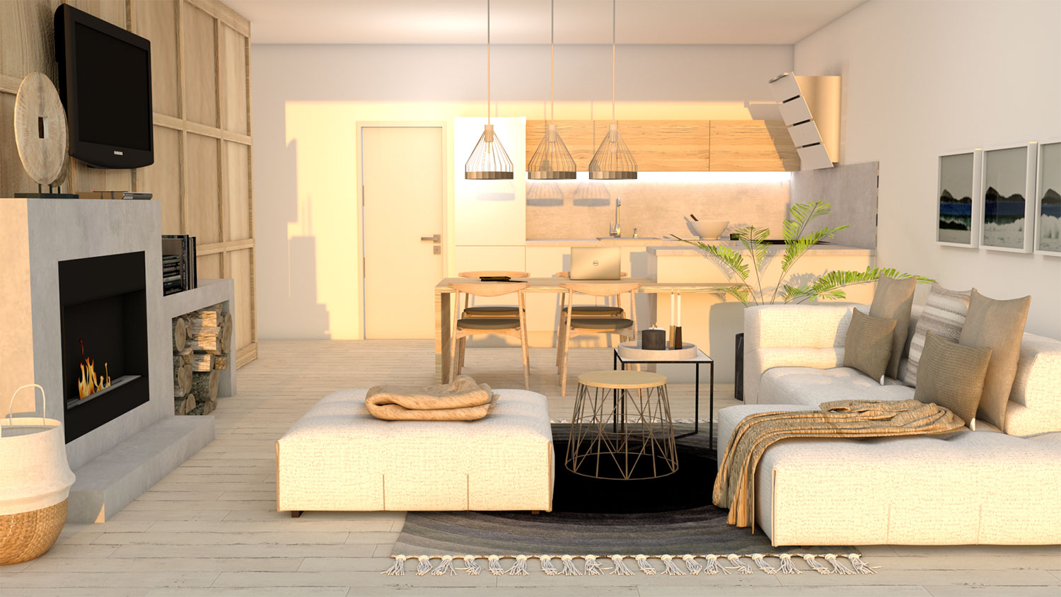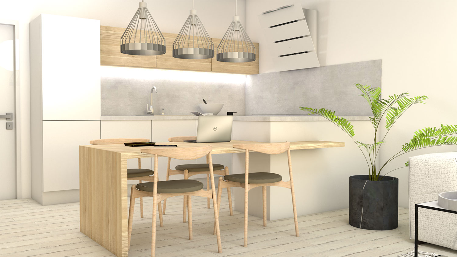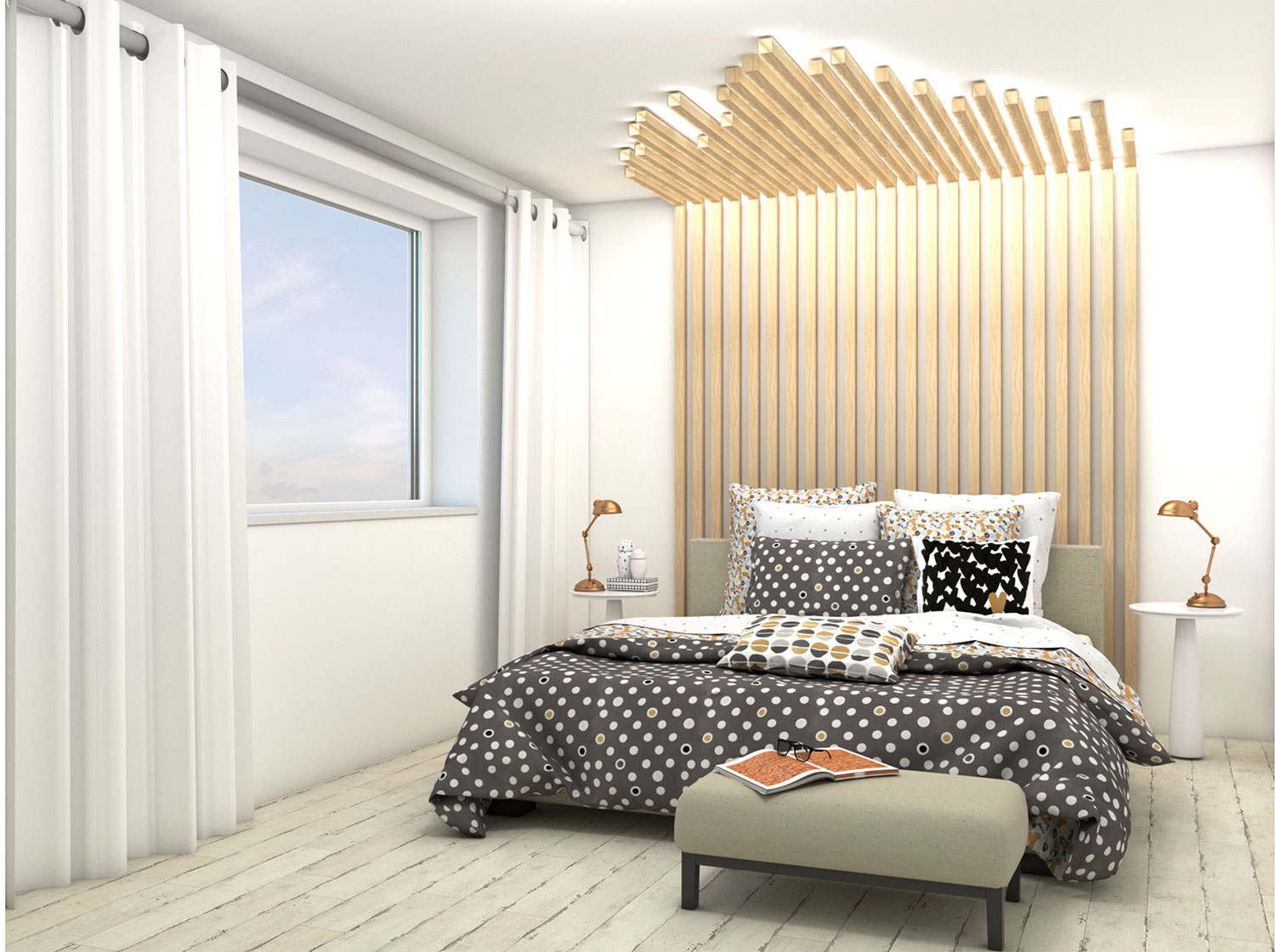 V návrhu sú použité svetlé materiály. Byt pôsobí vzdušne a vďaka drevu aj útulne a domácky. Zaujímavá je konštrukcia s drevených lamiel v spálni, ktorá je podsvietená LED osvetlením. V dennej časti je naplánovaná veľká kuchynská linka súčasťou ktorej je aj jedálenské sedenie.