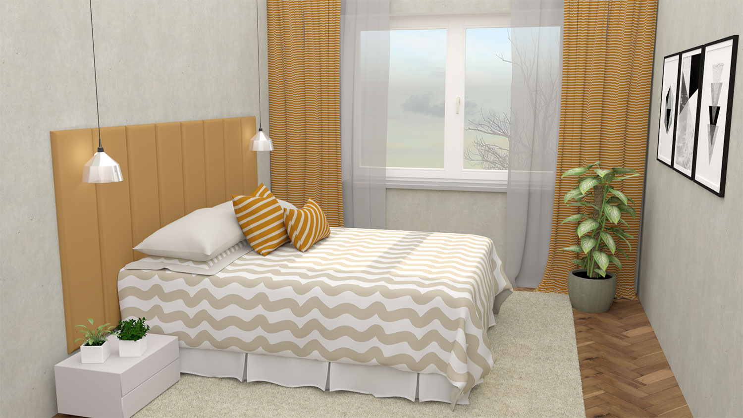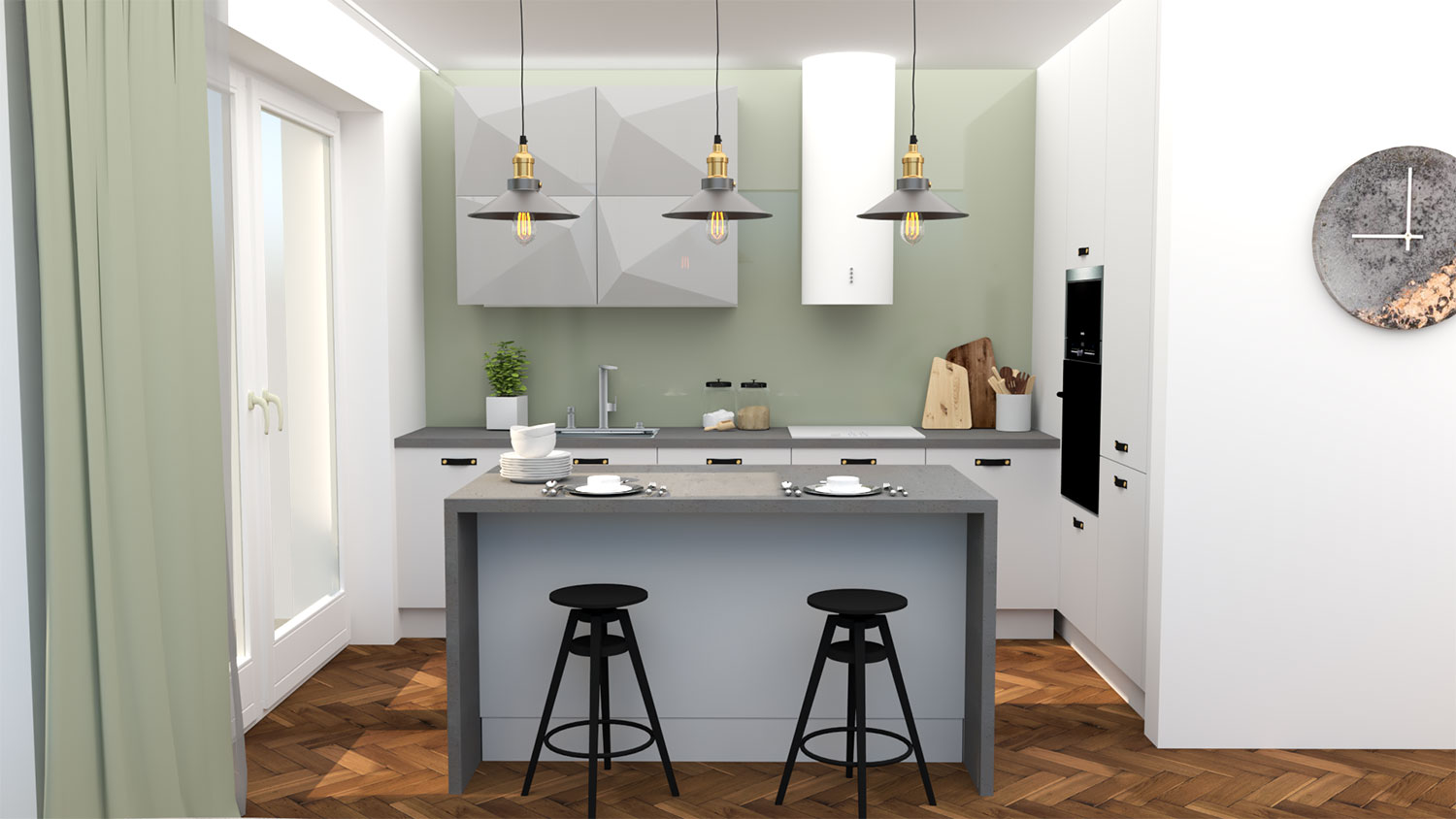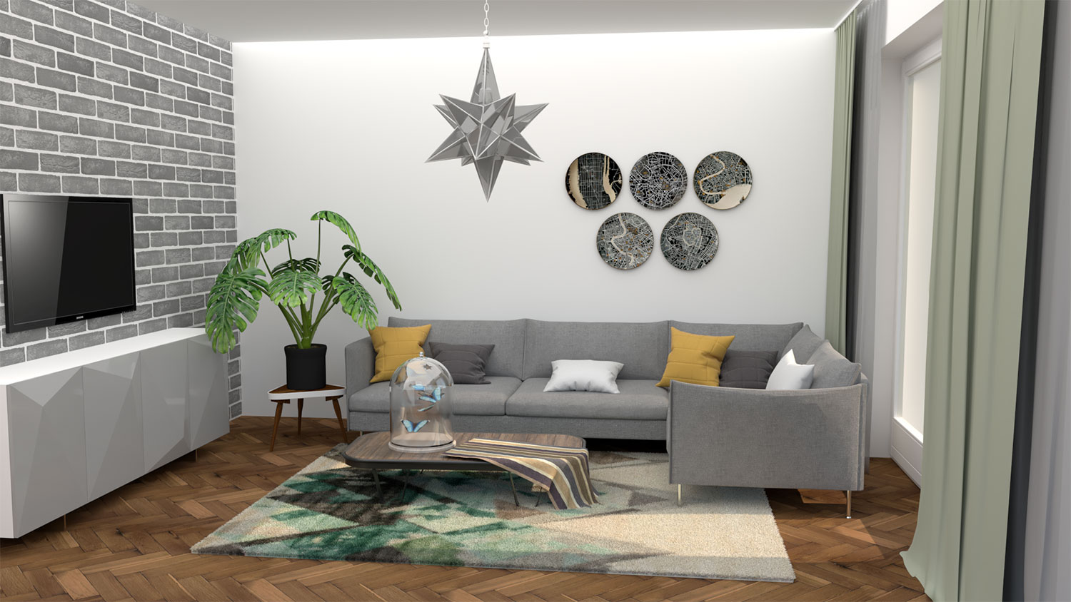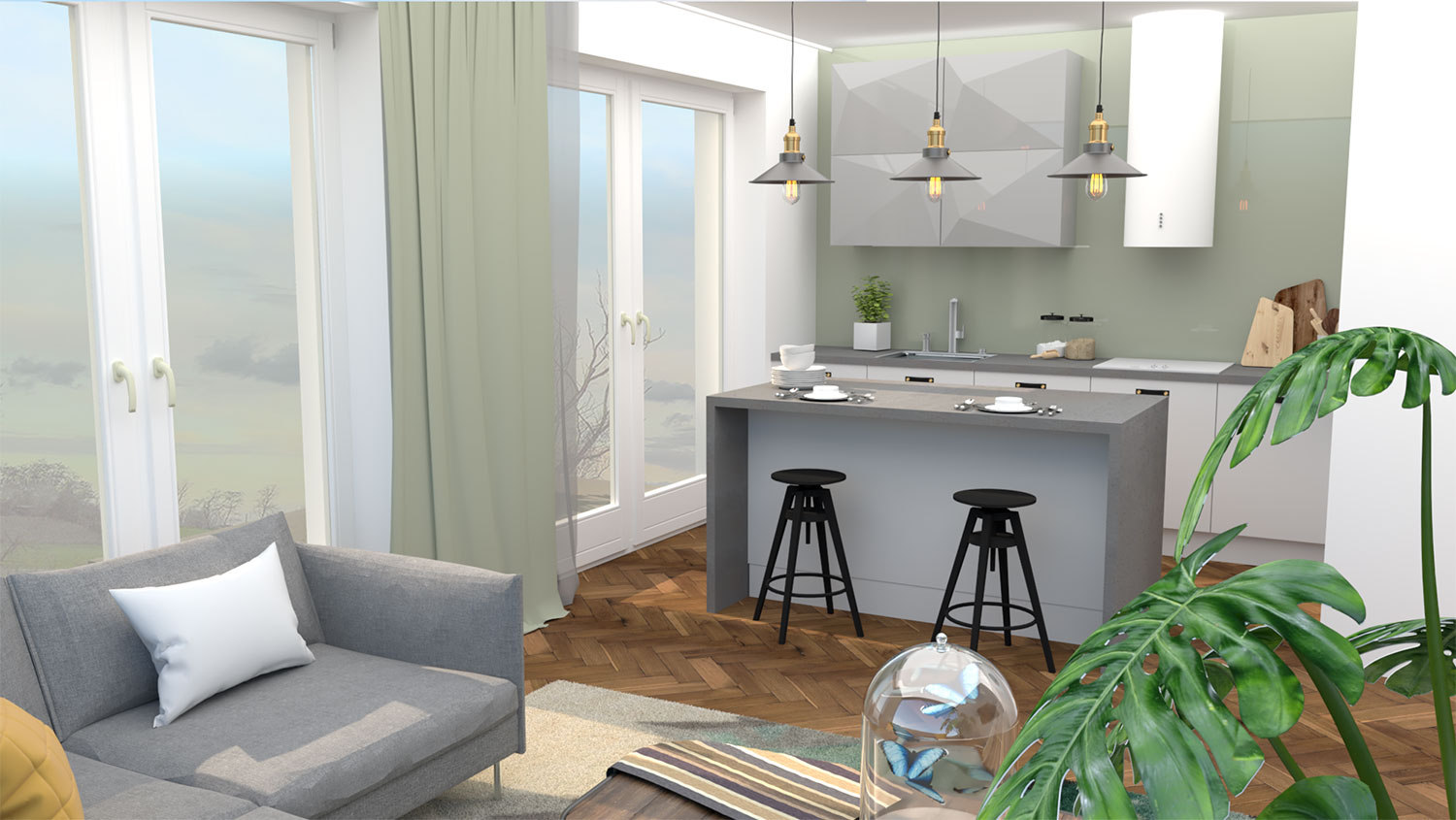 Návrh neutrálneho dvojizbového byt sme oživili farbami. Denná časť je doplnená o sviežu zelenú vo forme doplnkov. V kuchyni dominuje ako praktická sklenená zástena. V obývačke sú to závesy a farebný koberček. V spálni pohľad upútajú výrazné vzory textílií a veselá oranžová farba.