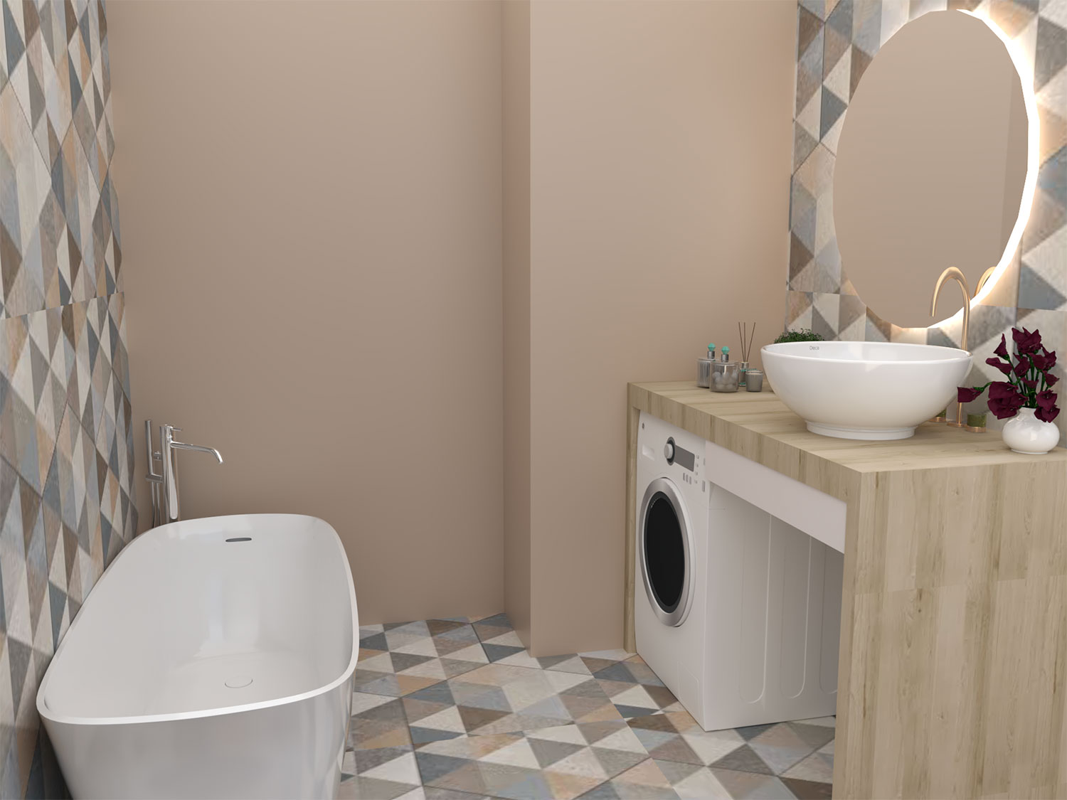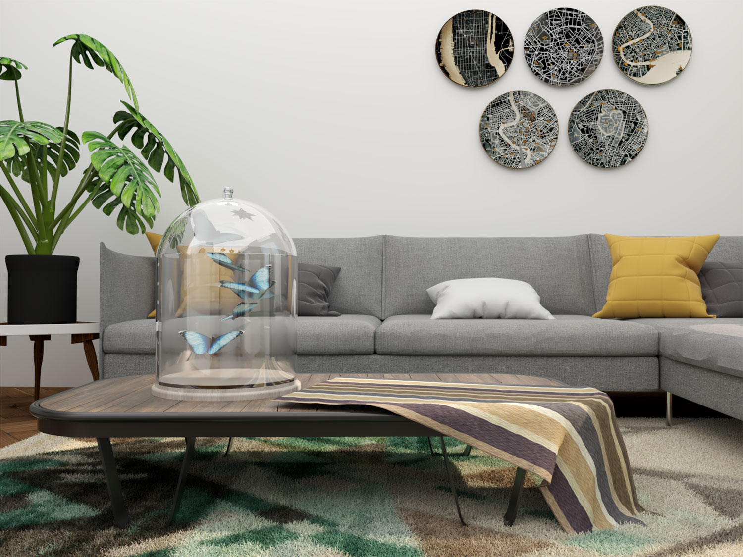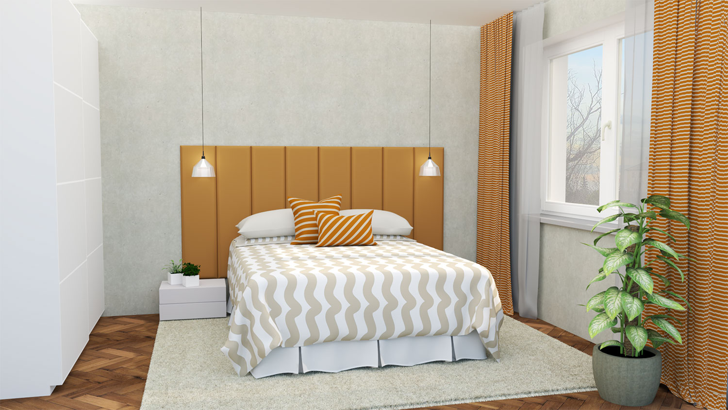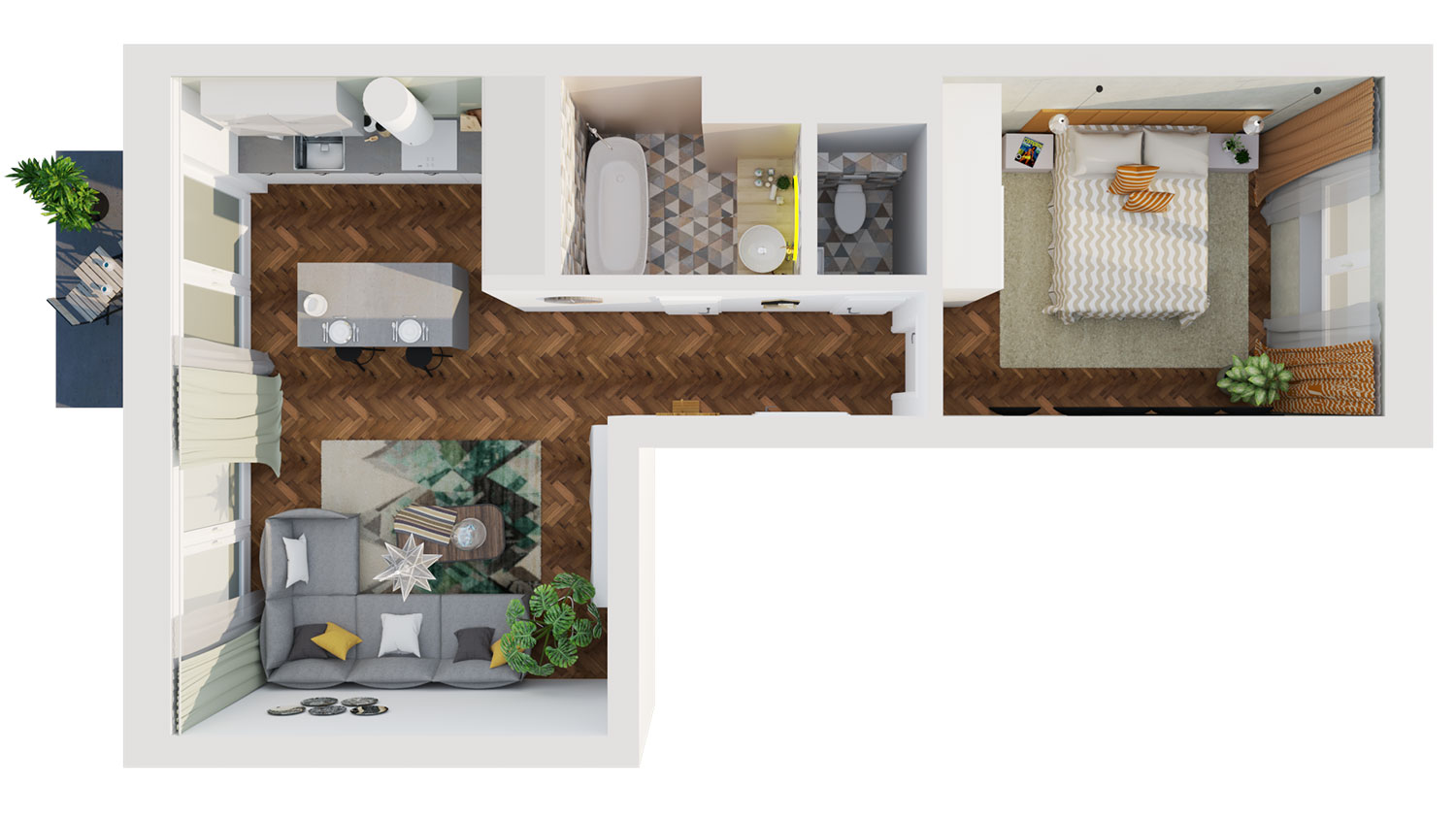 Návrh neutrálneho dvojizbového byt sme oživili farbami. Denná časť je doplnená o sviežu zelenú vo forme doplnkov. V kuchyni dominuje ako praktická sklenená zástena. V obývačke sú to závesy a farebný koberček. V spálni pohľad upútajú výrazné vzory textílií a veselá oranžová farba.