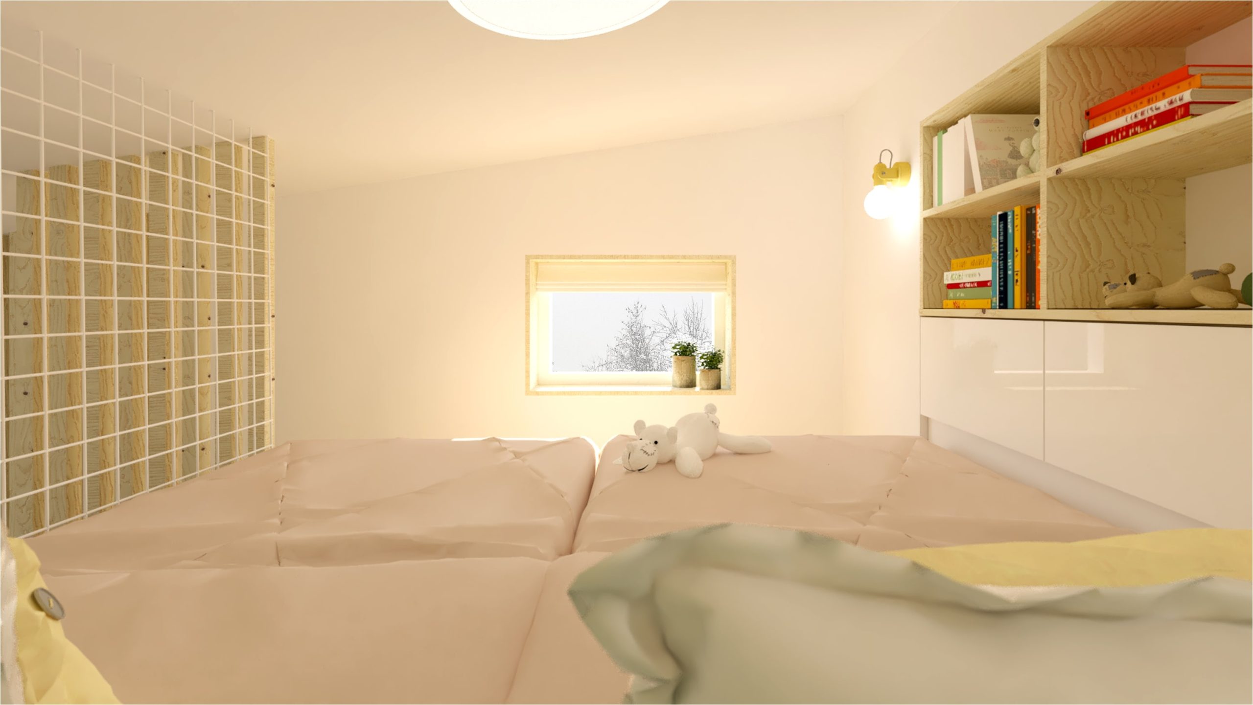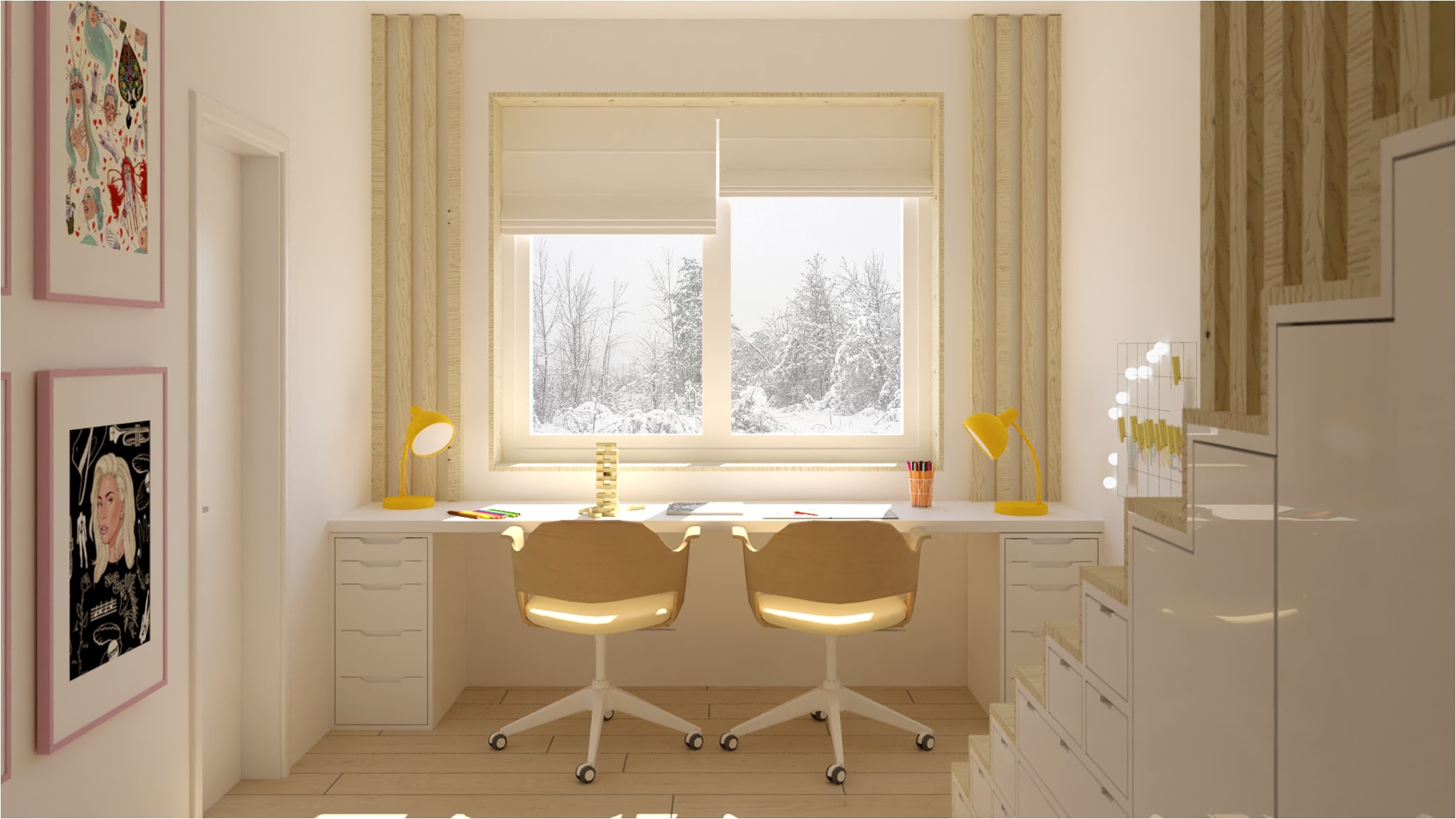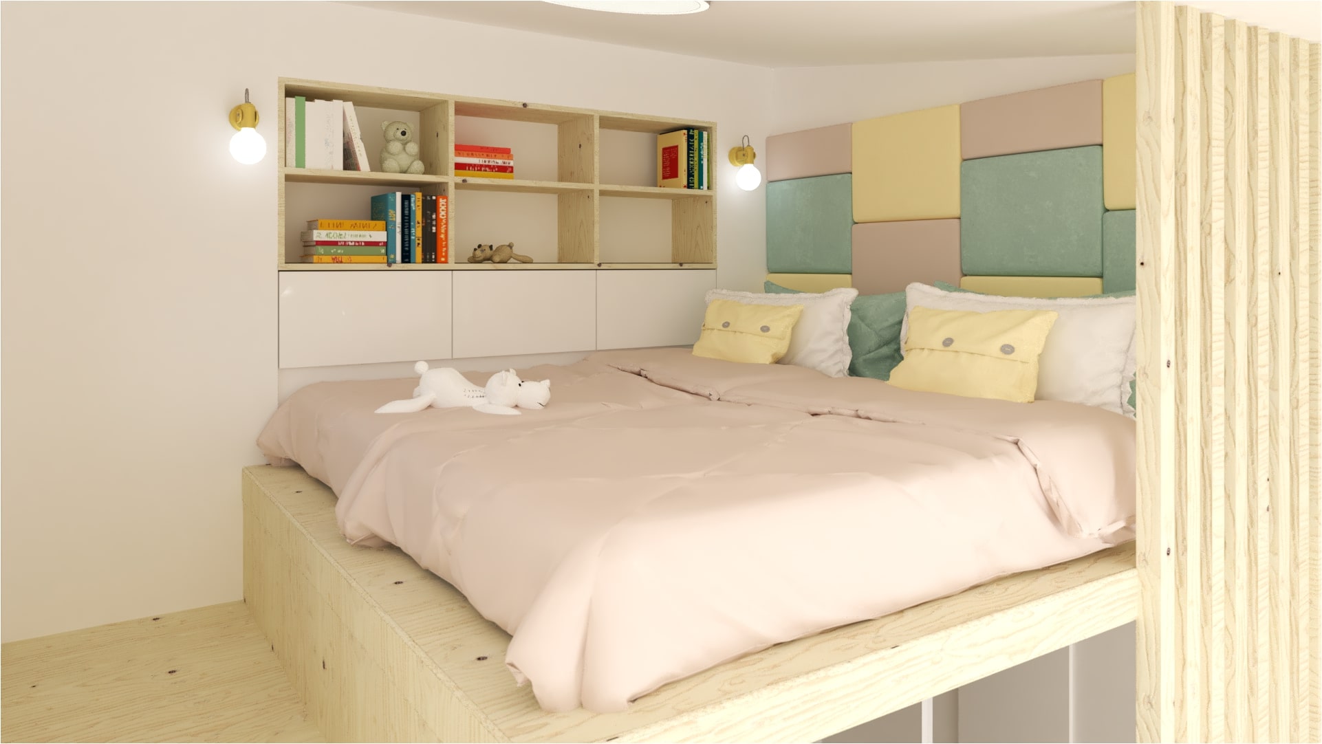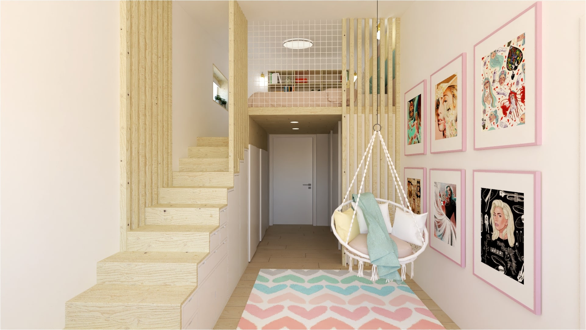 Navrhli sme detskú izbu s vyvýšeným poschodím pre spanie. Zaujímavý projekt kde sa využil priestor na maximum. Spodná časť slúži ako šatník a vrch na odpočinok. Izba bude pre dievčatá dvojičky, ktoré majú radi pastelkové farby a Lady Gagu.