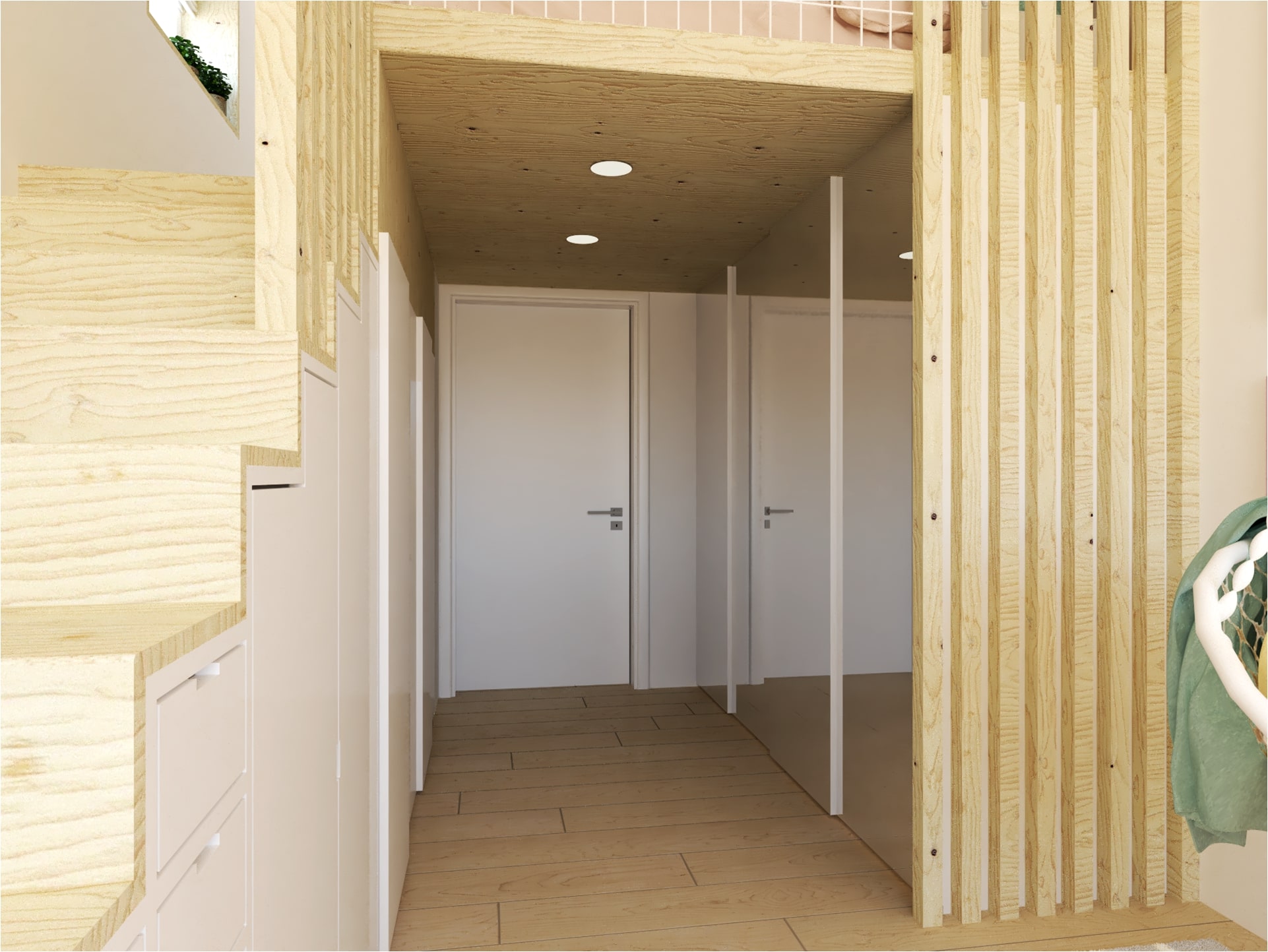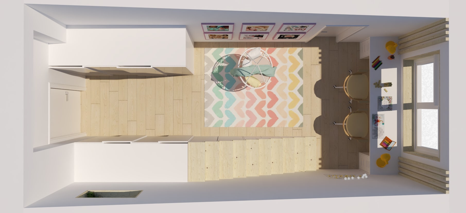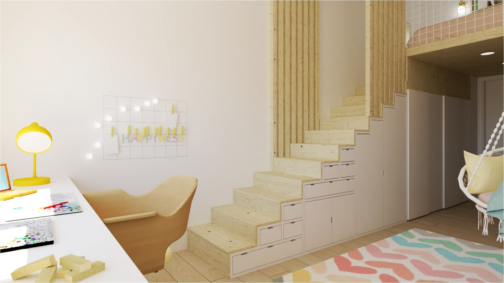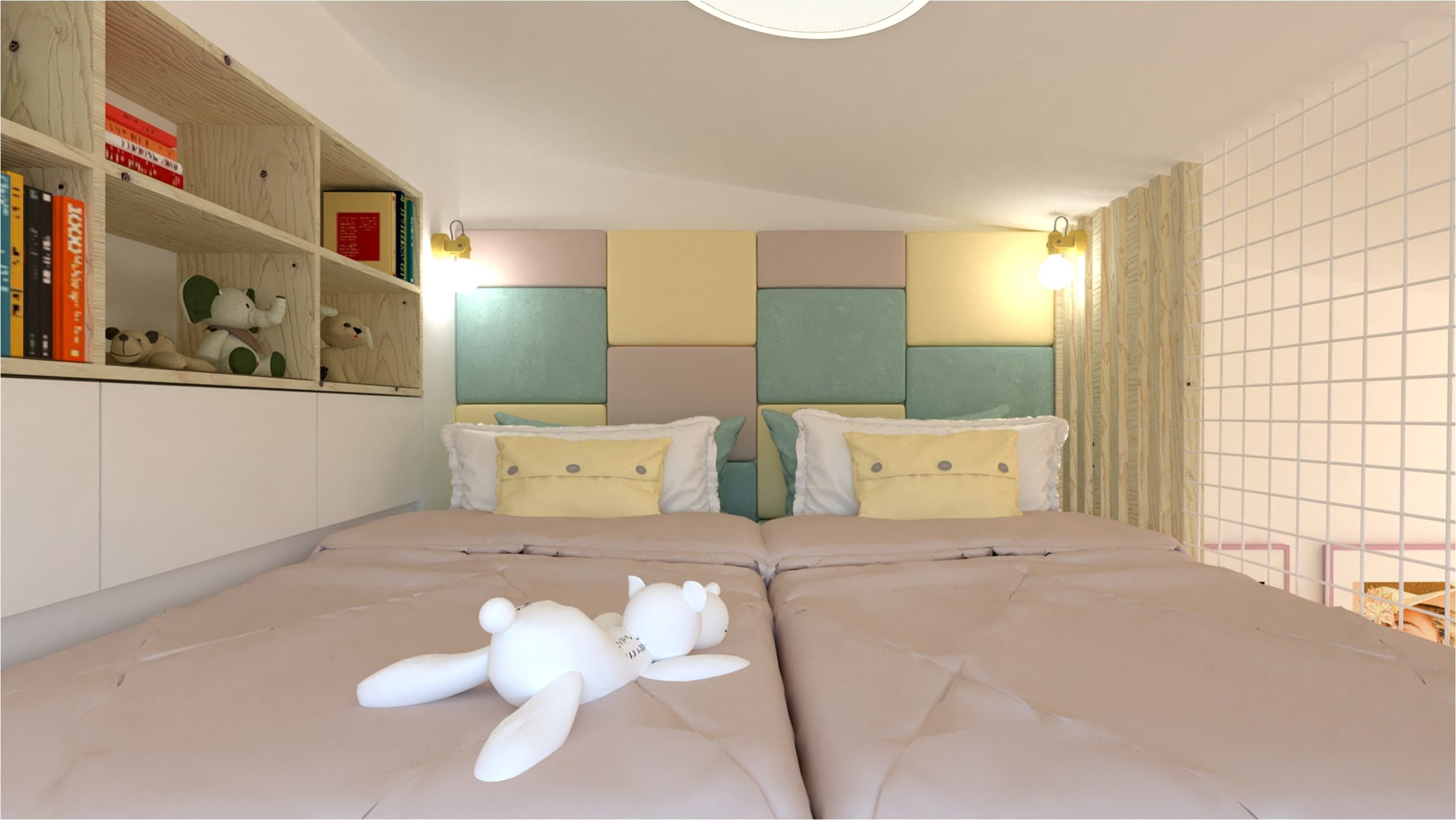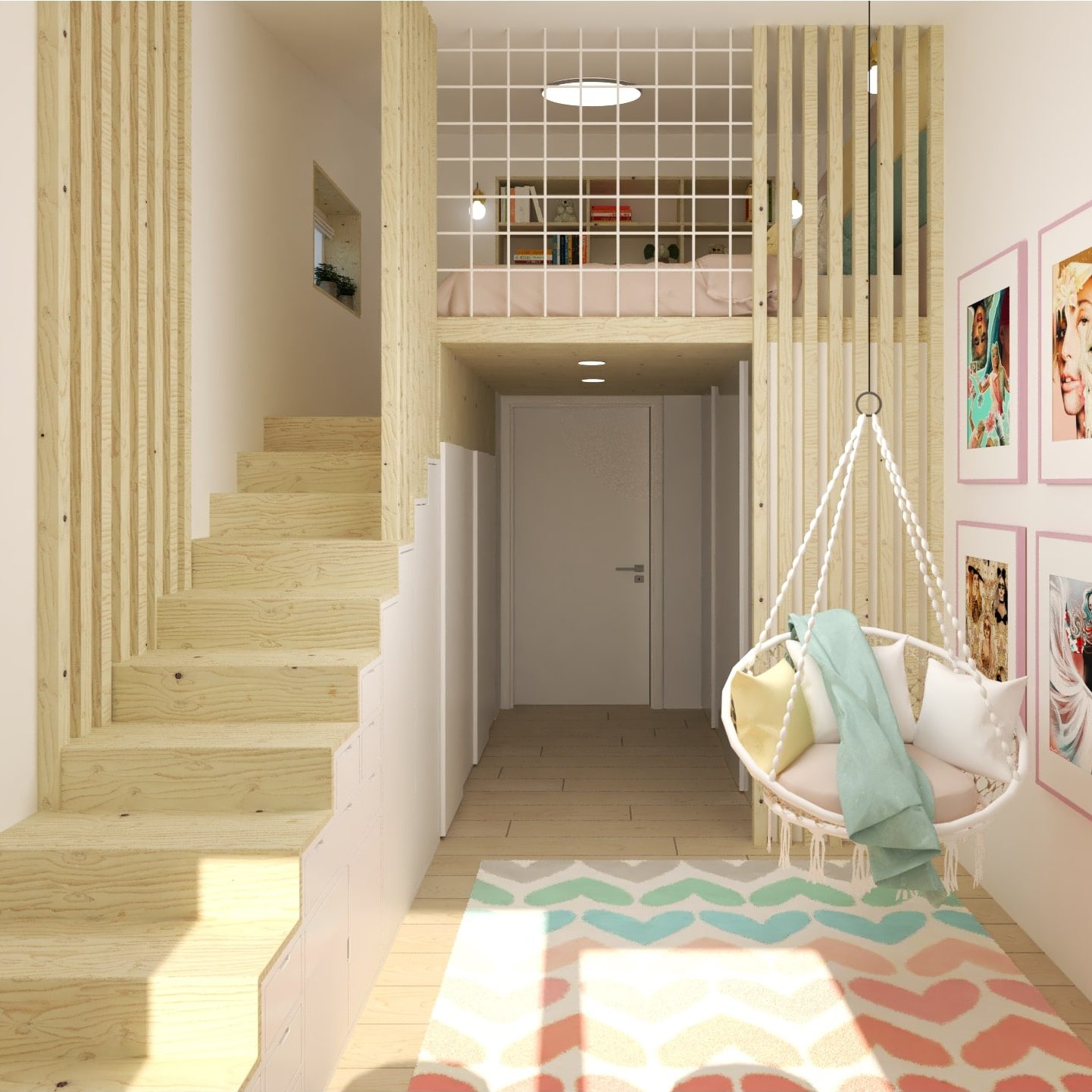 Navrhli sme detskú izbu s vyvýšeným poschodím pre spanie. Zaujímavý projekt kde sa využil priestor na maximum. Spodná časť slúži ako šatník a vrch na odpočinok. Izba bude pre dievčatá dvojičky, ktoré majú radi pastelkové farby a Lady Gagu.